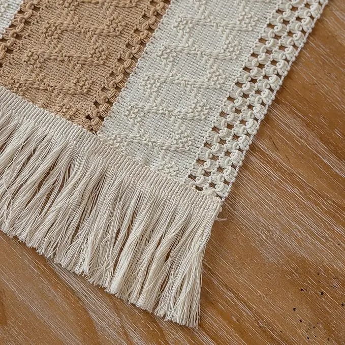 - SPLICING DESIGN: Delicate weaved hollow striped cotton fabric and woven burlap with tassel, giving a minimalist feel and creating a relaxed feel in the room. The bohemian style of the table runner evokes a warm and classy taste that both works harmoniously and aesthetically with any decor and furniture
