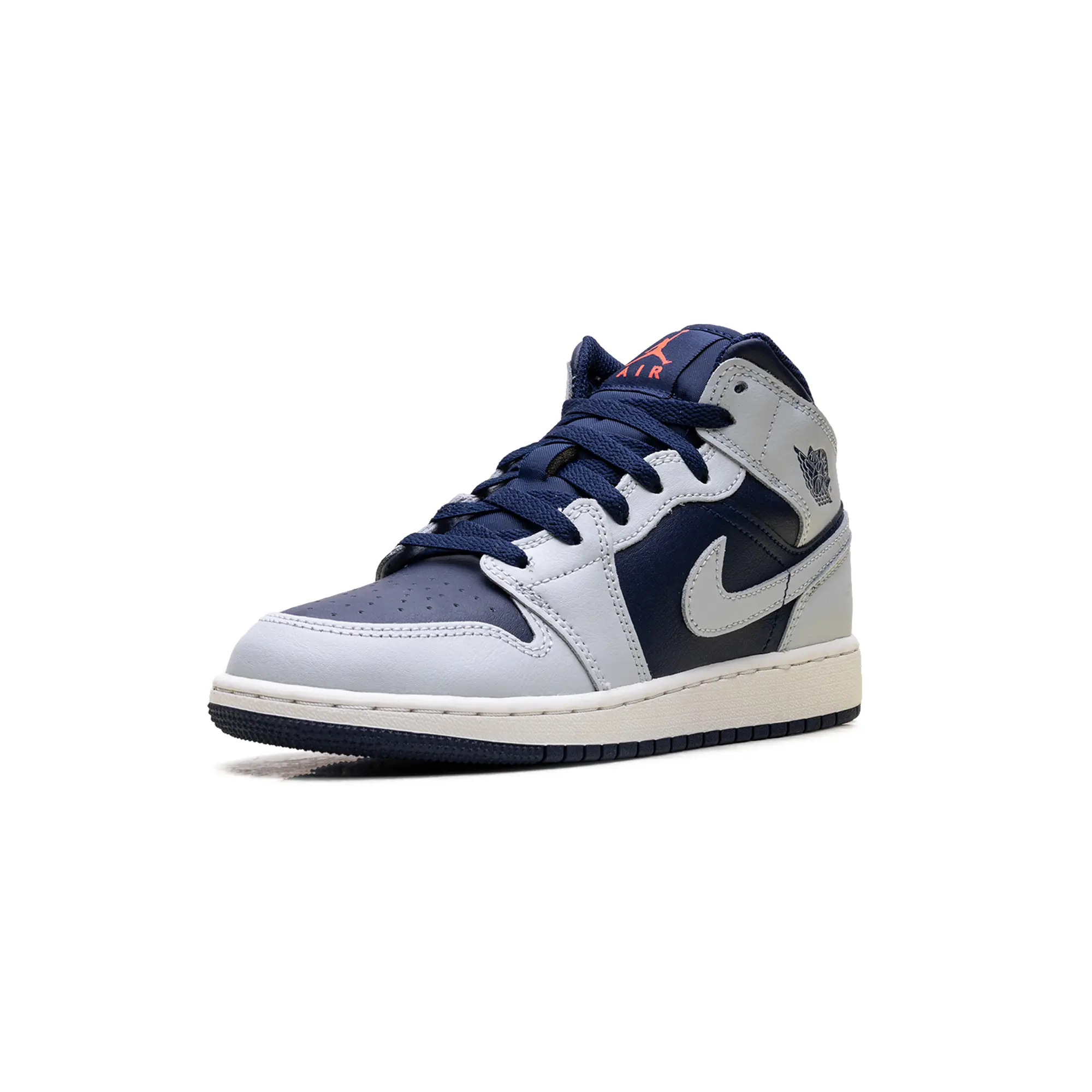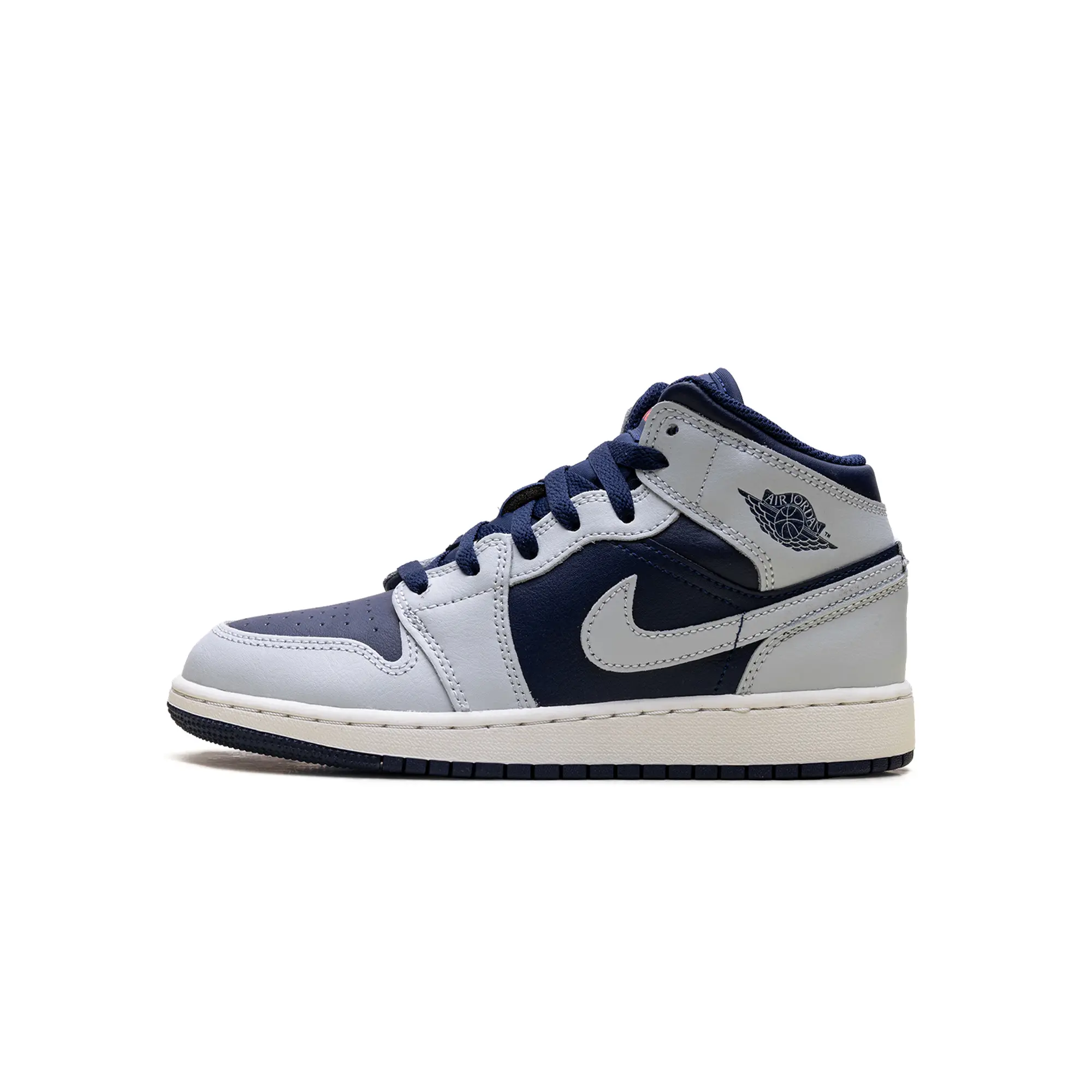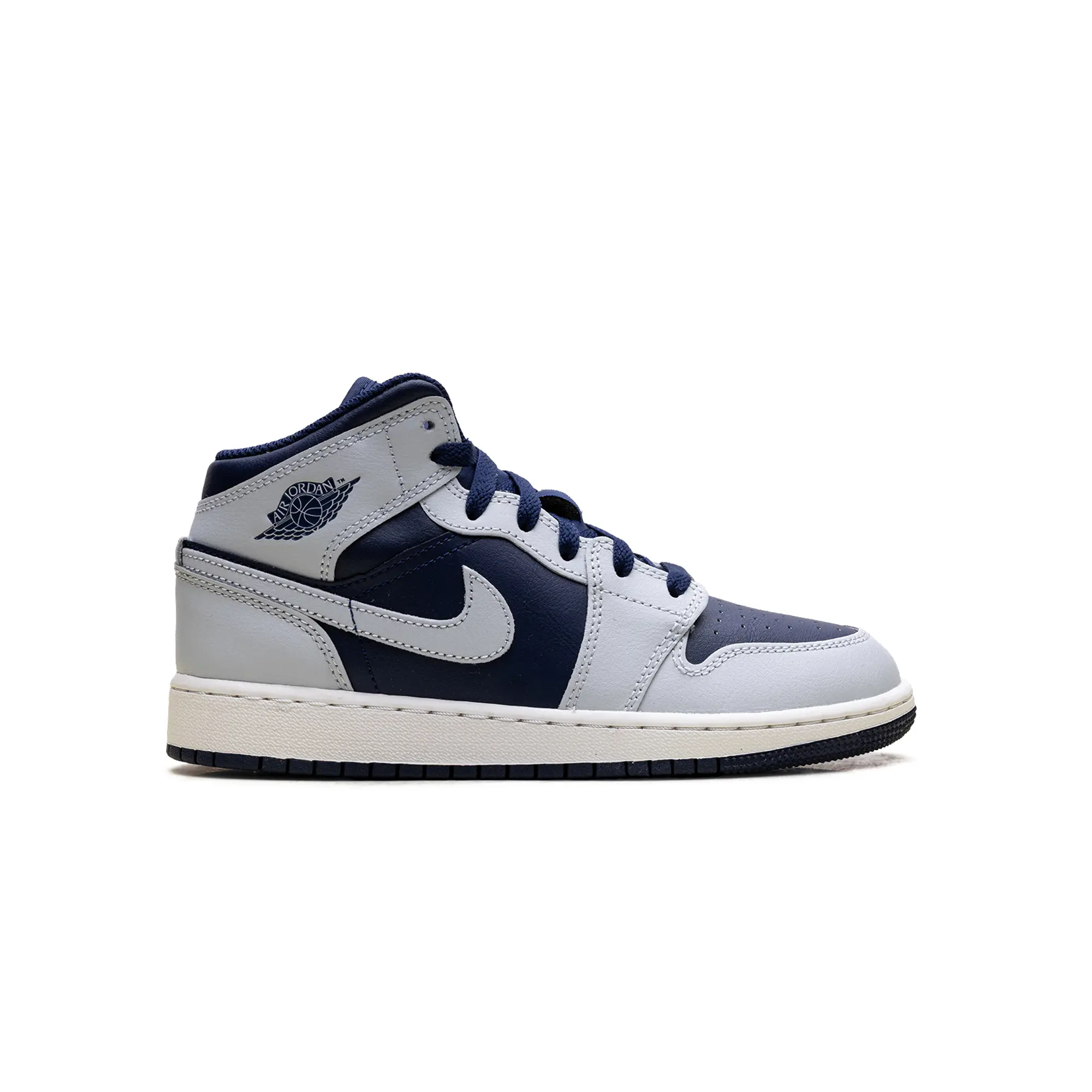 The Air Jordan 1 Mid GS "Grey / Obsidian" delivers a clinical, high-status execution of the 1985 hardwood icon, masterfully blending "Georgetown-adjacent" heritage with a radical, contemporary technicality. This Grade School exclusive features a premium landscape of smooth "Obsidian" navy leather and structural cool grey overlays, providing a muted, multi-dimensional foundation for the model’s iconic anatomical profile. The design is defined by its artisanal strike, utilizing a specialized grey leather Swoosh and debossed Wings branding that injects a layer of high-octane luxury into the deconstructed court build. Grounded by a vintage-inspired "Sail" midsole for elite aesthetic depth and finished with a navy rubber outsole for superior multi-surface grip, this release successfully pairs the AJ1’s aggressive DNA with a sophisticated, "Collegiate-Vapor-Elite" aesthetic.