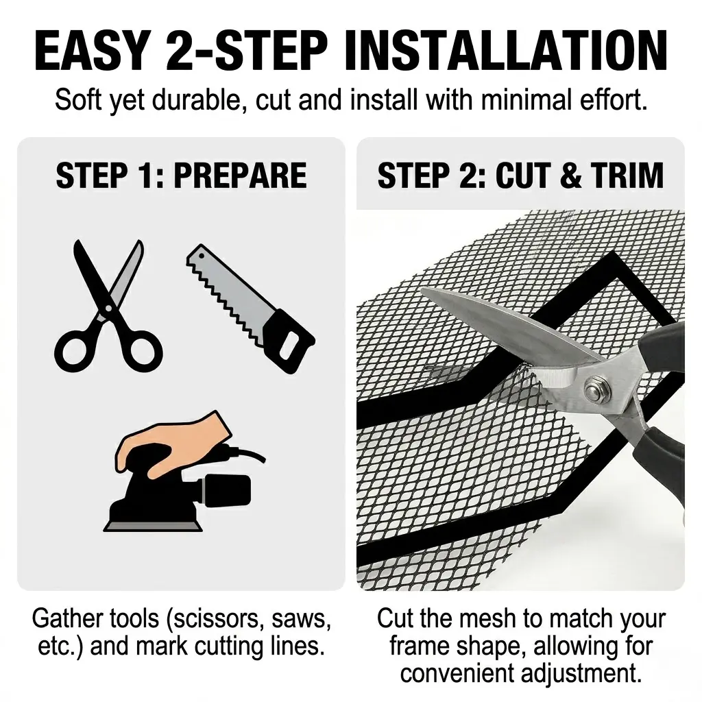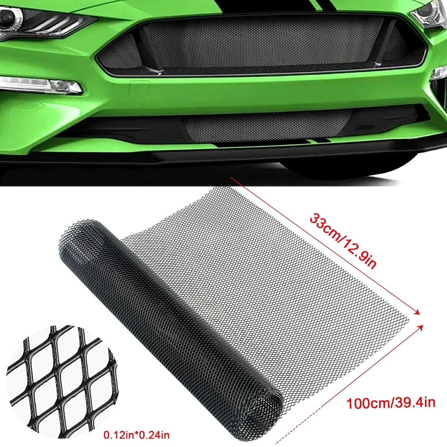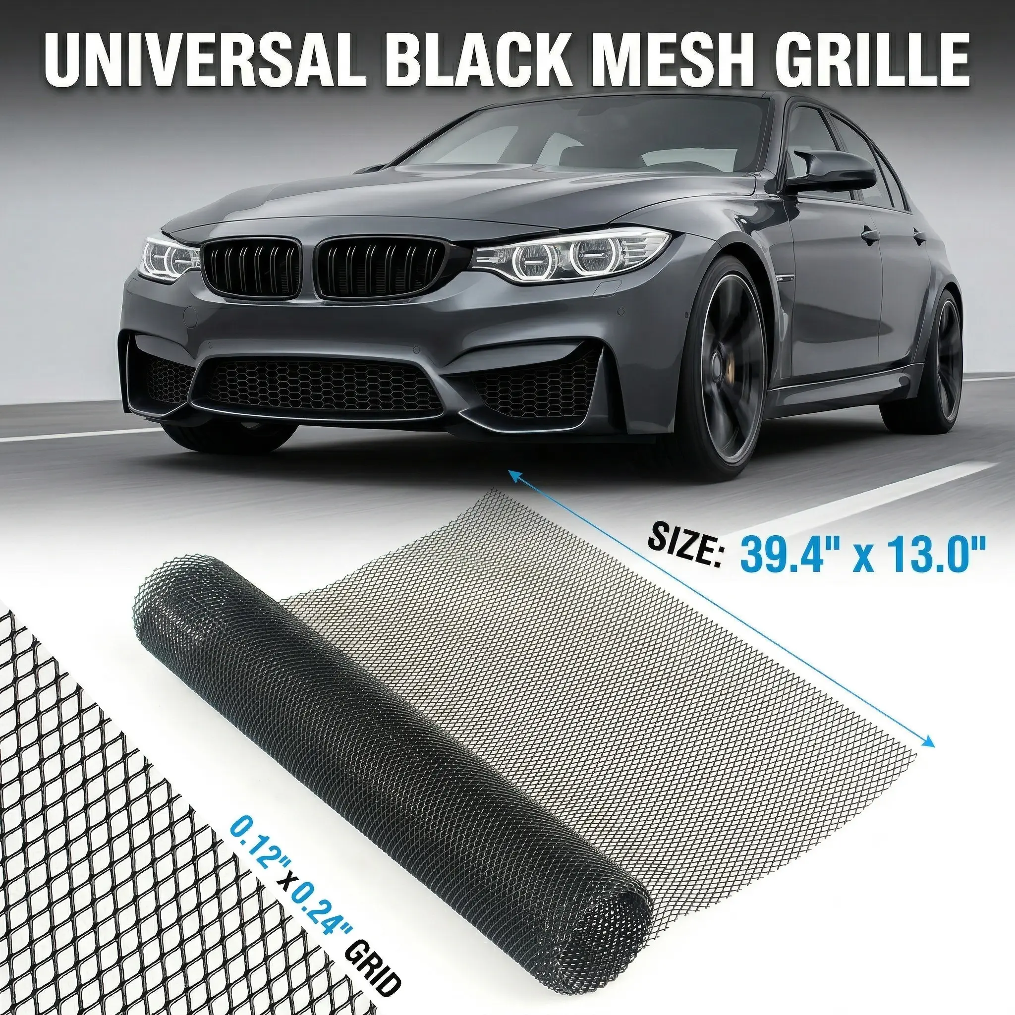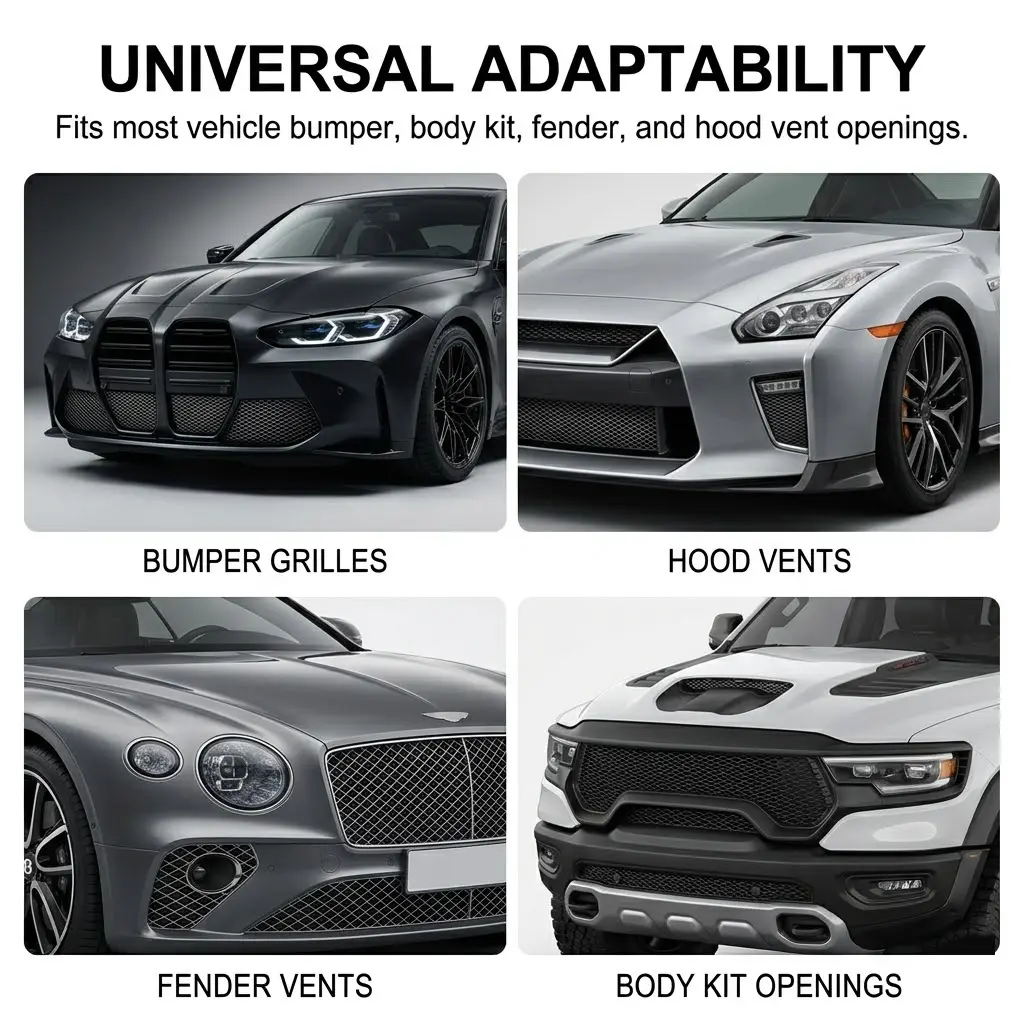 The 100x33cm sheet with 3x6mm rhombic holes is easy to cut with scissors to fit any shape. Perfect for front bumpers, grilles, vents, body kits, and hood openings on cars, trucks, SUVs, and ATVs.