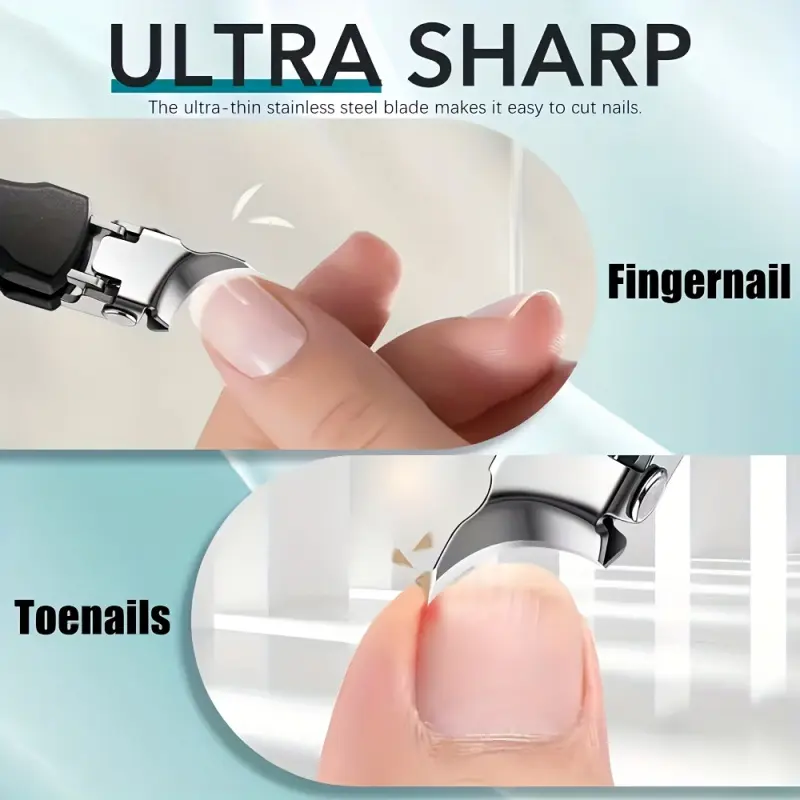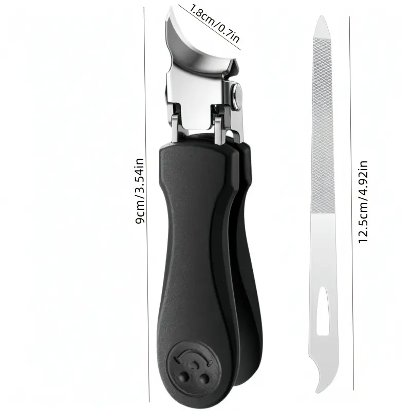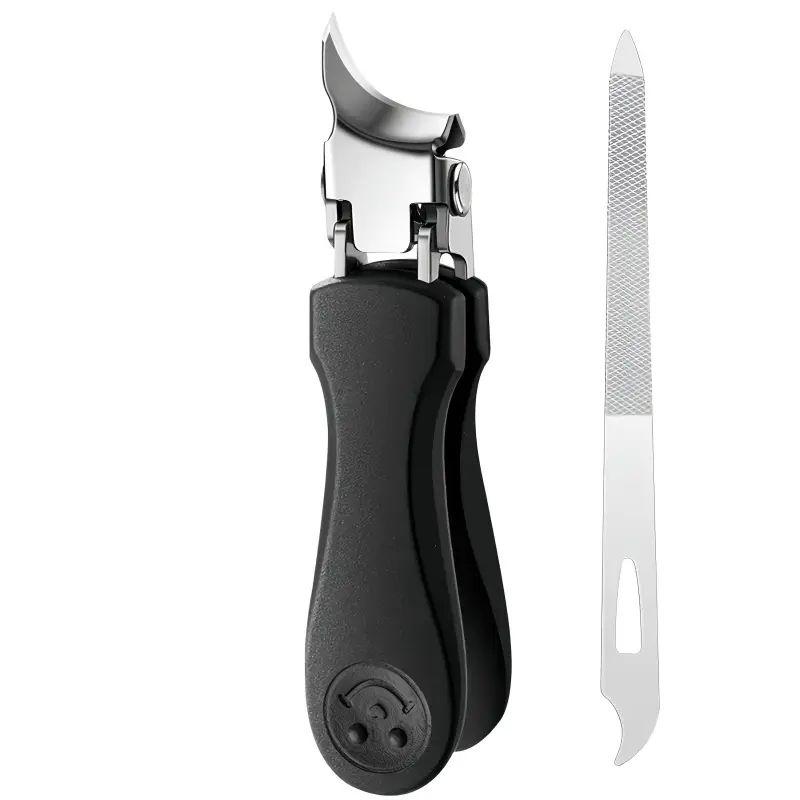 2-piece set of splash proof large opening nail clippers, designed with a slanted mouth specifically for toenails, paired with nail files for a cleaner and more worry free trimming of thick and embedded nails