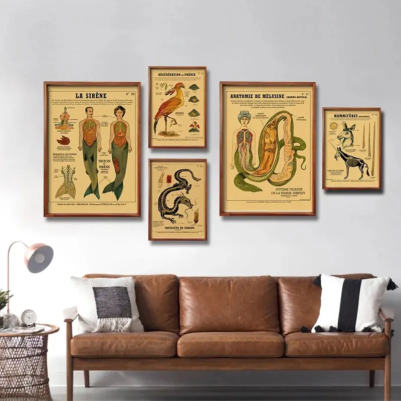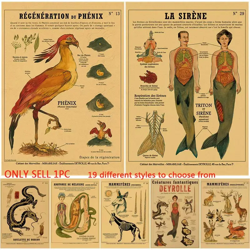1pc Unframed Anatomy of Mermaid Poster Bird Curious Creatures Imitation kraft paper printing Vintage Home Room Cafe Bar Art Wall Decor Aesthetic Painting (19 different styles to choose from)