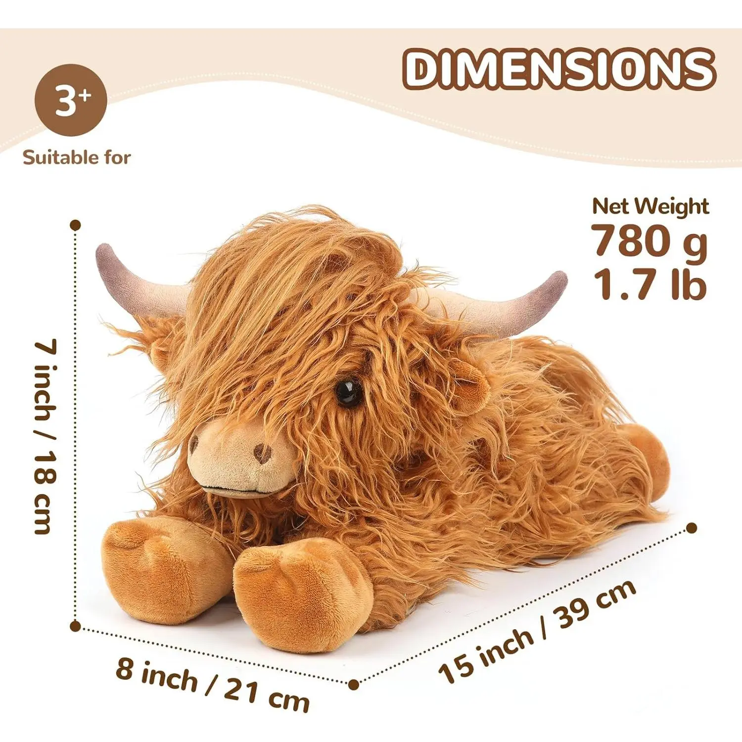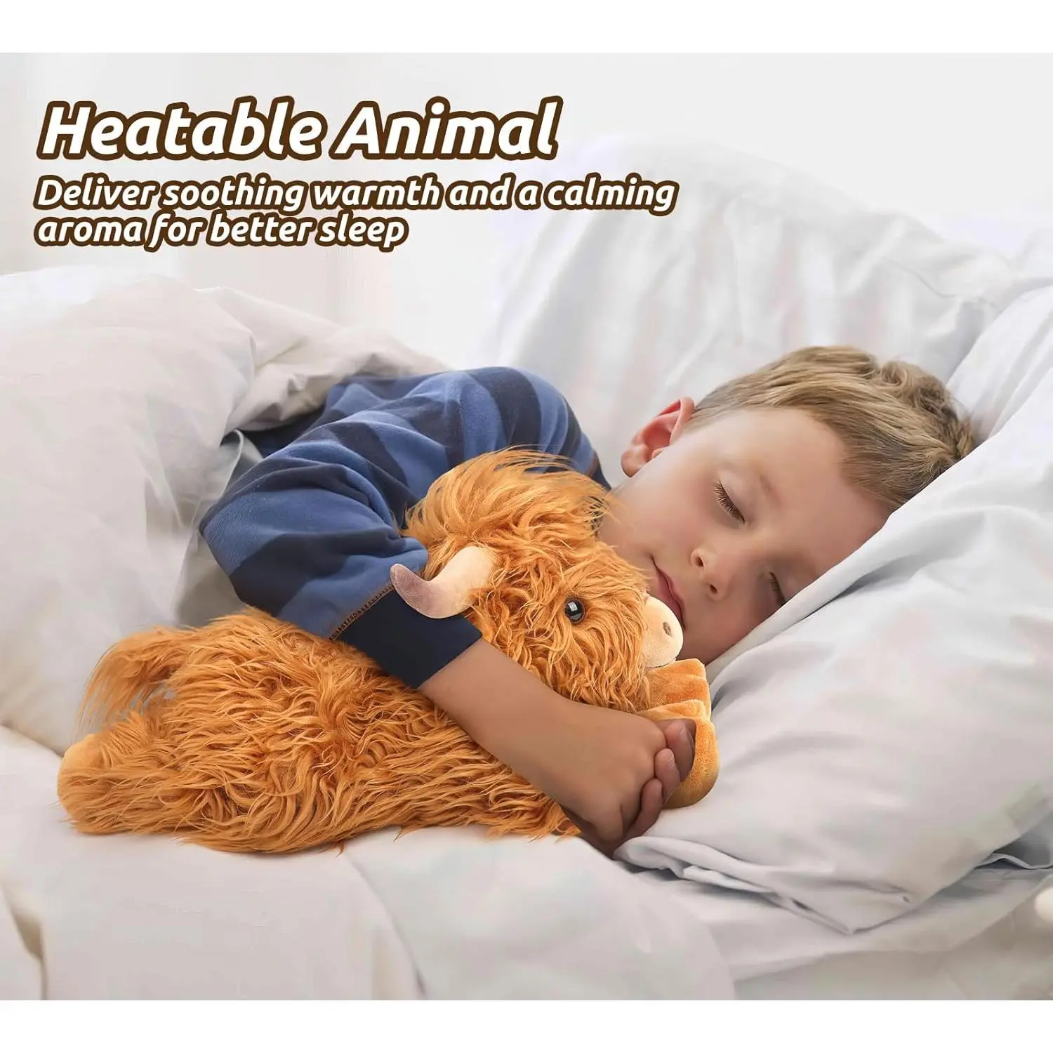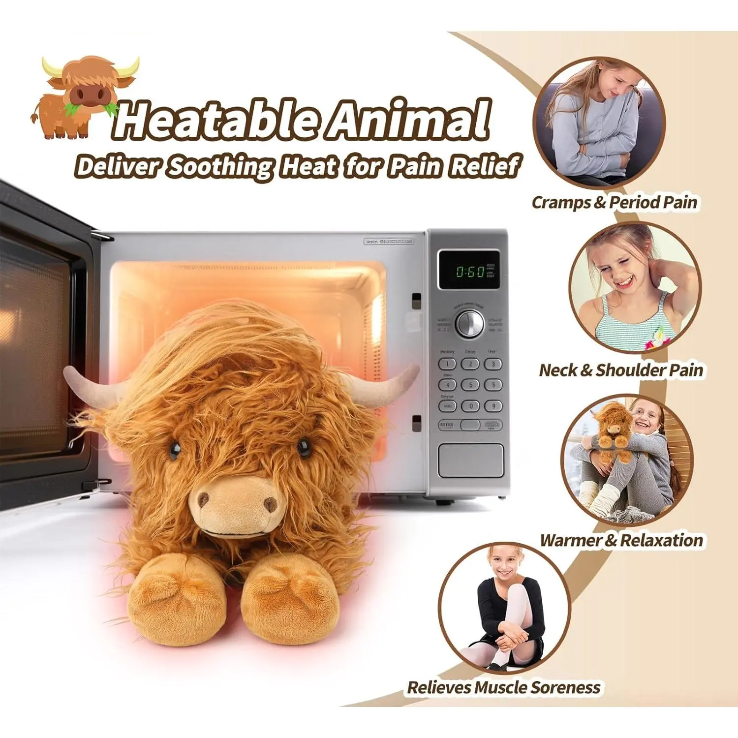 LIFELIKE HIGHLAND COW APPEARANCE: This highland cow stuffed animal plush is a designer original! This plush is approx: 15"L x 8"W x 7"H in size. Meet your perfect cute highland cow plushies companion, resting in a cozy, lay-down position for added cuteness and comfort. This sweet buddy is irresistibly soft, featuring shaggy fur, an endearing facial expression. It's the ideal cuddle buddy, bringing warmth and joy to both kids and adults alike. A unique and delightful gift for any cow lover, sure to add charm to any settingSUPER SNUGGLES: Delight your little ones with this cow plush toys. Made from ultra-soft materials, it’s perfect for snuggling, offering warmth and security during bedtime while uplifting their mood and soothing their mind. Give the gift of a Cuckool to brighten anyone's day. These heated stuffed animals toy make the perfect present for friends, family, or that special someone. Whether for traveling, bedtime, playtime, naptime, or just when you need a hug, give someone you love a Cuckool todayREDUCED STRESS, ANXIETY AND ENHANCED MOOD: Designed to bring comfort and a smile, the cute plush cow offers a gentle lavender aromatherapy that soothes the nervous system, helping kids feel calm and less anxious during challenging times. Design for mimics a comforting hug, providing a sense of security and relaxation. Adorable cow plush stuffed animal can lift your child’s mood, promoting a sense of well-being and easing feelings of sadness or unease. It’s the perfect gift to help kids find peace and calm during stressful momentsNATURAL AND SAFE: Filled with natural flaxseeds, our cow stuffed animal provides longer-lasting, comforting moist heat than other fillings like wheat. Cozy cow plush heating pad microwavable promotes circulation and eases cramps, while the subtle lavender scent offers floral and fresh notes to calm your senses, relieve headaches, and soothe menstrual discomfort. Heatable stuffed animals is the perfect comfort gift for girls experiencing their first period cramps, helping to improve sleep and well-being during this important timePERFECT GIFT FOR ANY OCCATION: Presented in exquisite packaging with an adoption certificate, this highland cow toys plushies can be named and signed, adding a personal touch to the fun. It’s the perfect gift for birthdays, christmas, or as a thoughtful gesture for someone recovering from surgery. Share the gift of comfort and warmth with your loved ones todayTHOUGHTFUL AND HEARTFELT GIFT FOR YOUR BELOVED ONES: With a cordless design for safety and portability, this heatable plush cow can be taken anywhere. Warm it up in the microwave for 60 seconds to enjoy a soothing warmth for up to 30 minutes, perfect for muscle relaxation, pain relief, and stress reduction. Or, chill it in a seal bag in freezer for 2-3 hours to experience refreshing coolness, providing relief from inflammation, muscle aches, and fatigue. This cow stuffed animal is the perfect companion to keep you cozy when the weather turns chilly