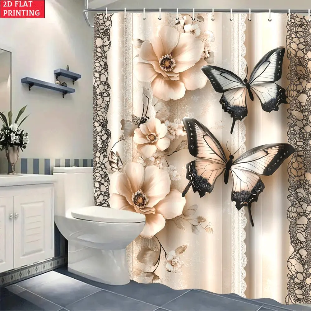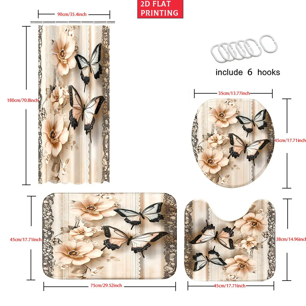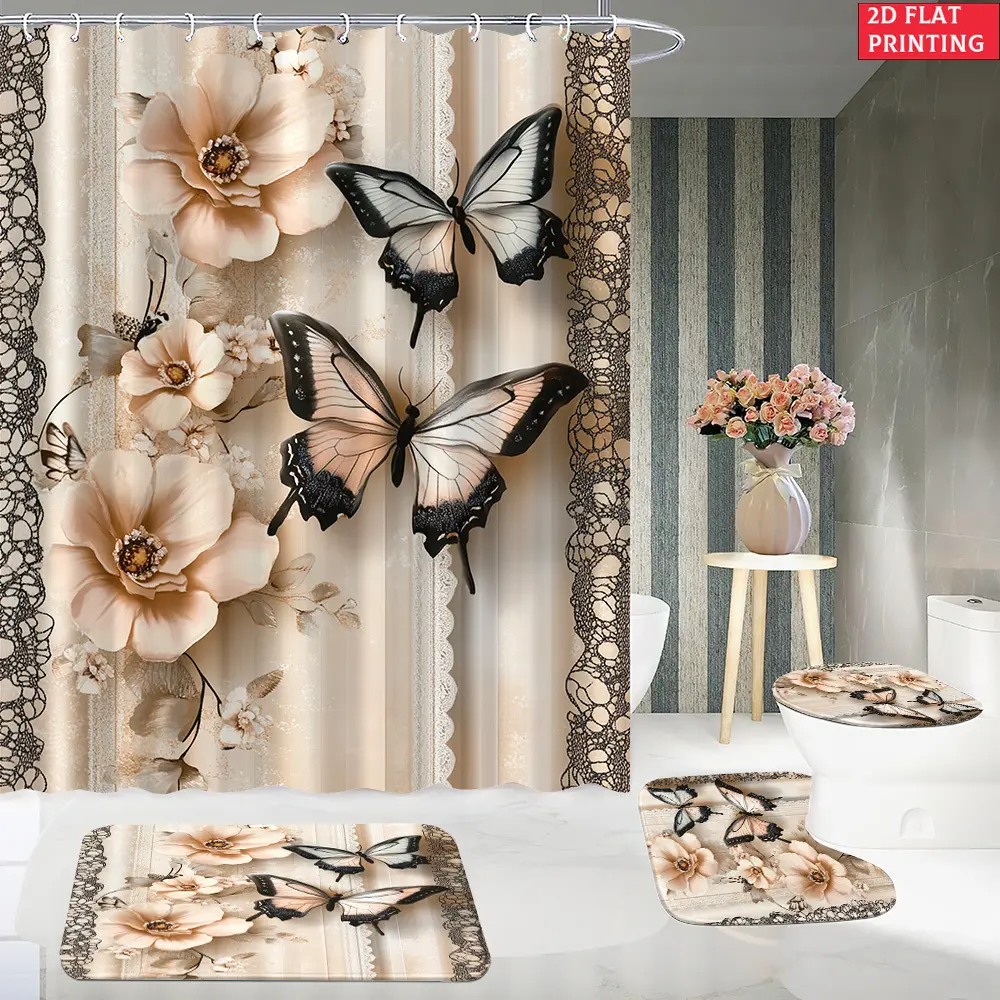 2D plan, 1/4 piece creative butterfly flower bathroom set, suitable for home and hotel use - elegant beige shower curtain with anti slip bath mat, toilet seat cover and U-shaped blanket pad, essential home decoration items, bathroom decoration accessories