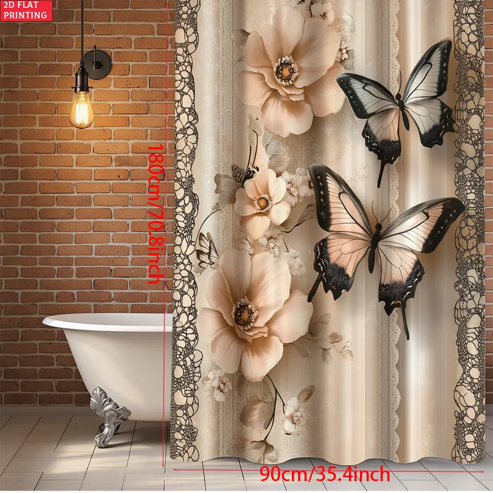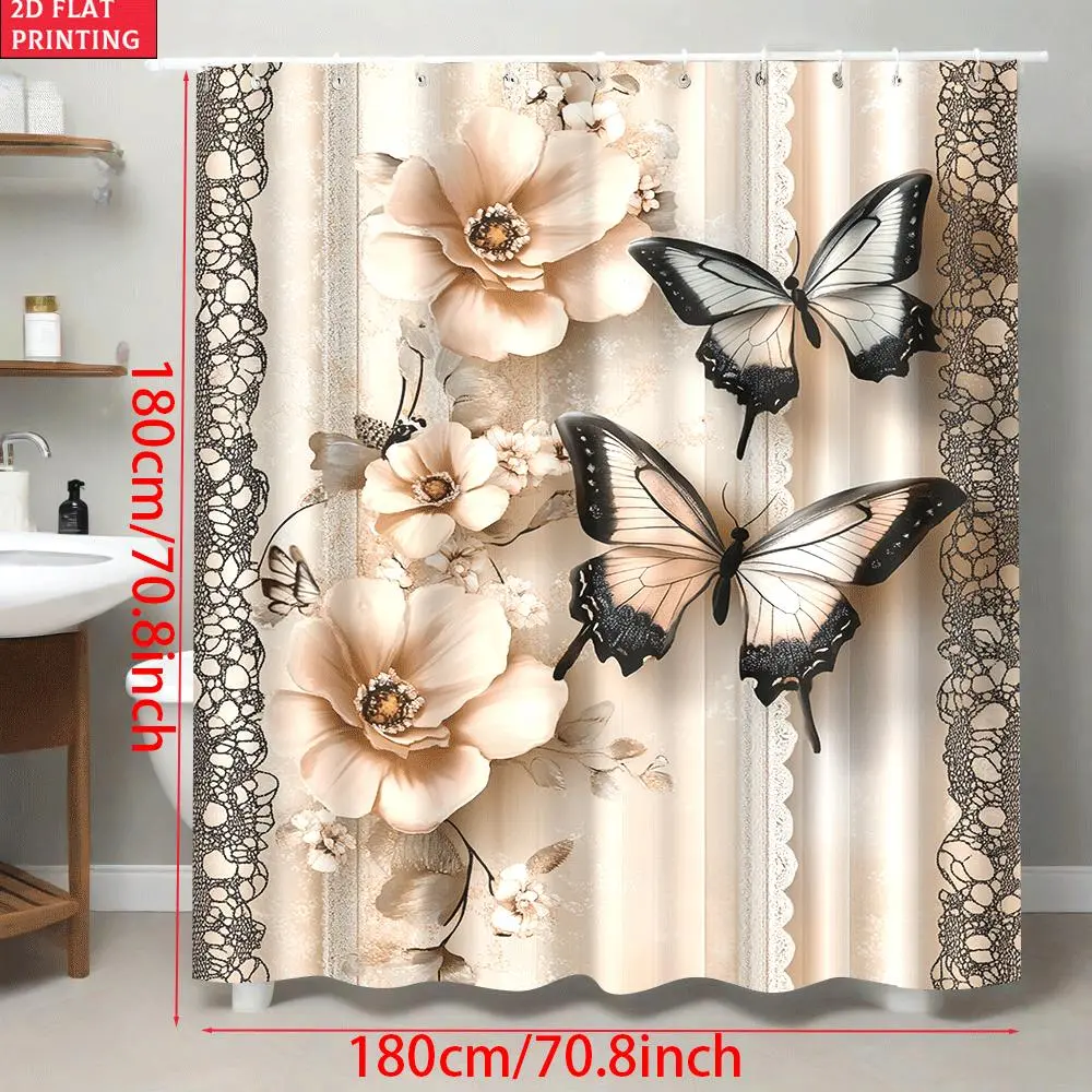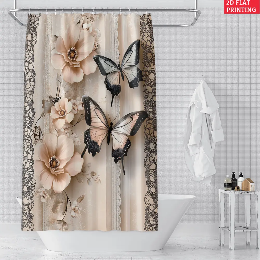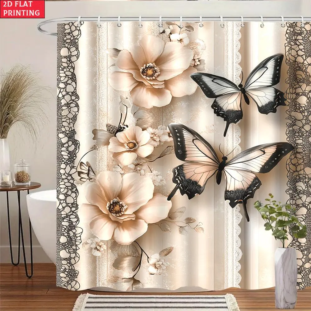 2D plan, 1/4 piece creative butterfly flower bathroom set, suitable for home and hotel use - elegant beige shower curtain with anti slip bath mat, toilet seat cover and U-shaped blanket pad, essential home decoration items, bathroom decoration accessories