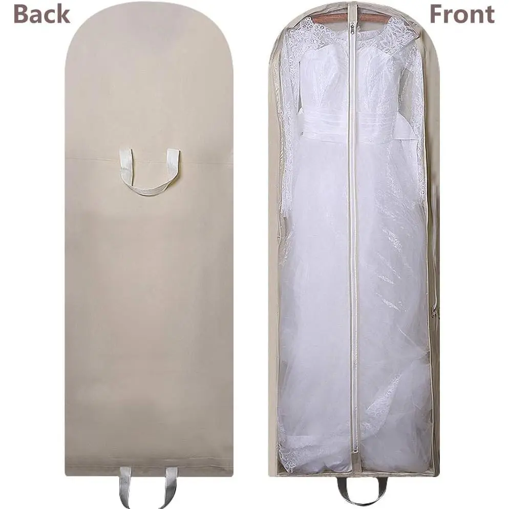 1, Made of non-woven fabric material. This storage and travel bridal gown garment bag is made of soft material that to protect your garment while travelling. 2, 63" length by 22.8" width with 6" Gusset wedding dress bag , big enough for storing wedding/ party/ prom gown/ dance dress or long train. Not including hangers. 3, This is the cloth expandable pretty delicate garment holder for ladies, it can be used for other purposes too! It makes the perfect bridesmaid, evening and formal ball gown storage cover set! What is more, you can use it to safely store your dresses, leathers, robe, suits and more! 4, Smooth sturdy zippers, zip and unzip easily and Two strong handles behind the back, you can folding the garment storage bag and hook on to the hanger, perfect for transporting or hanging in closet while traveling. 5, Easy to carry! You can fold it into carrying bag. The front of the bag is transparent, you can see everything clear.