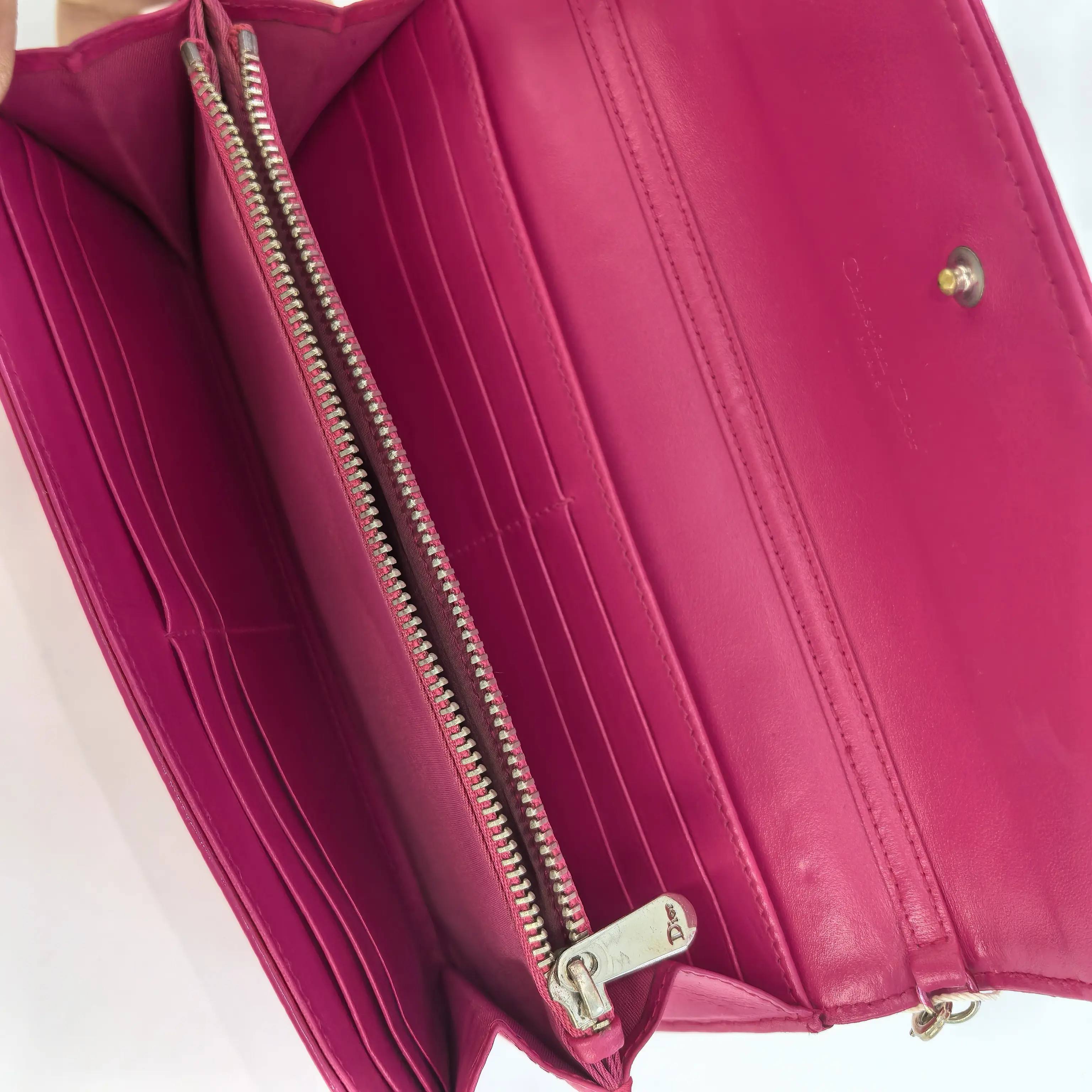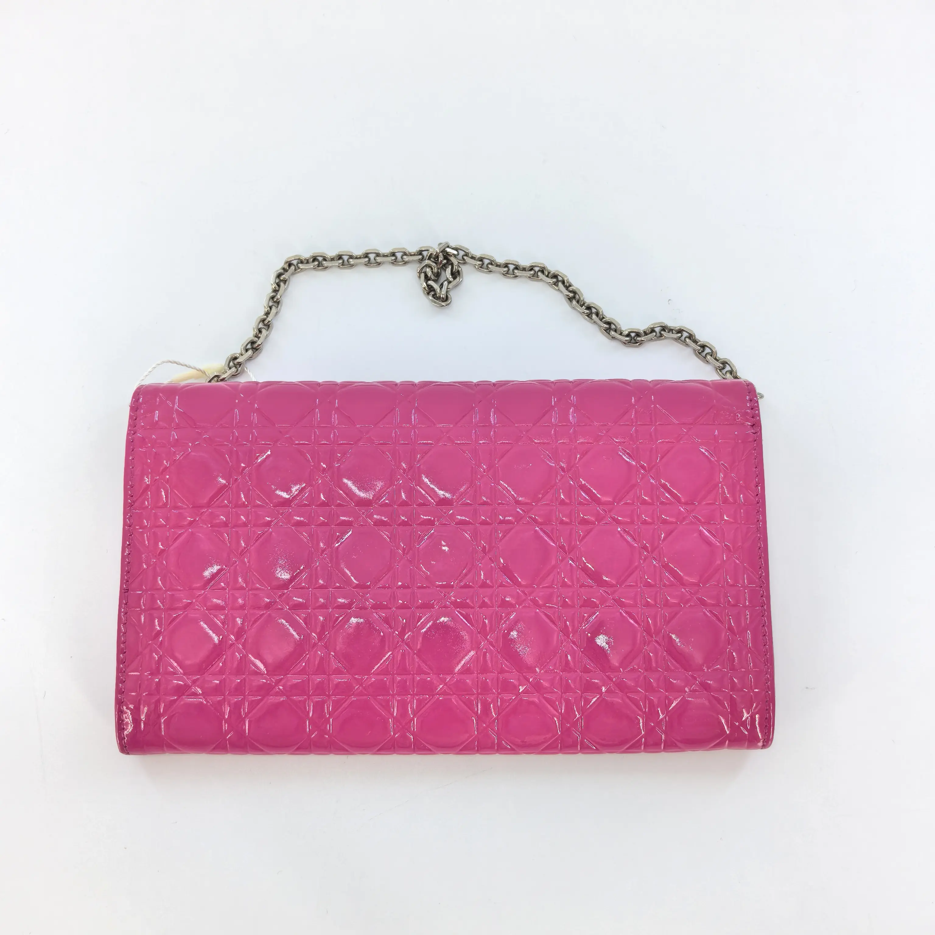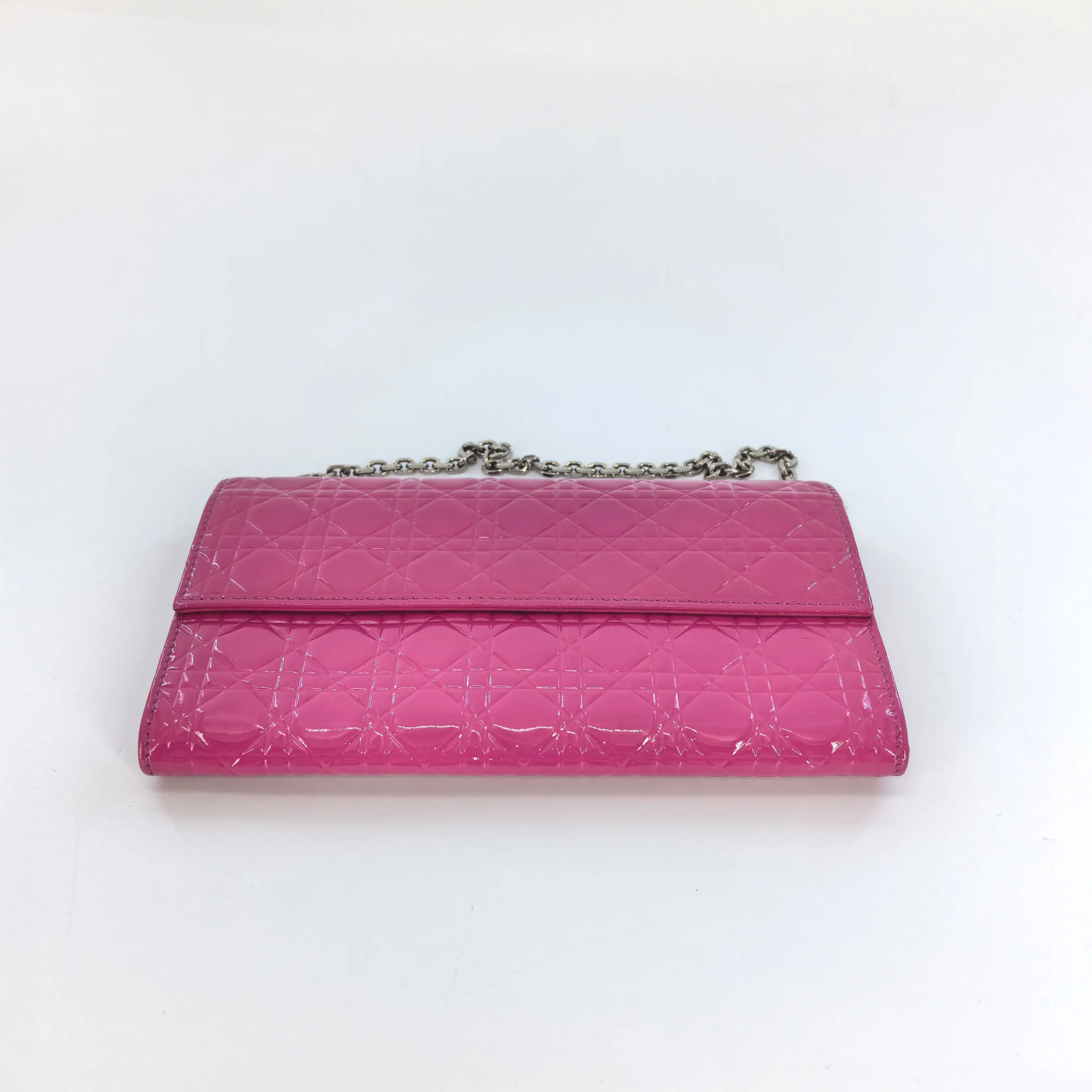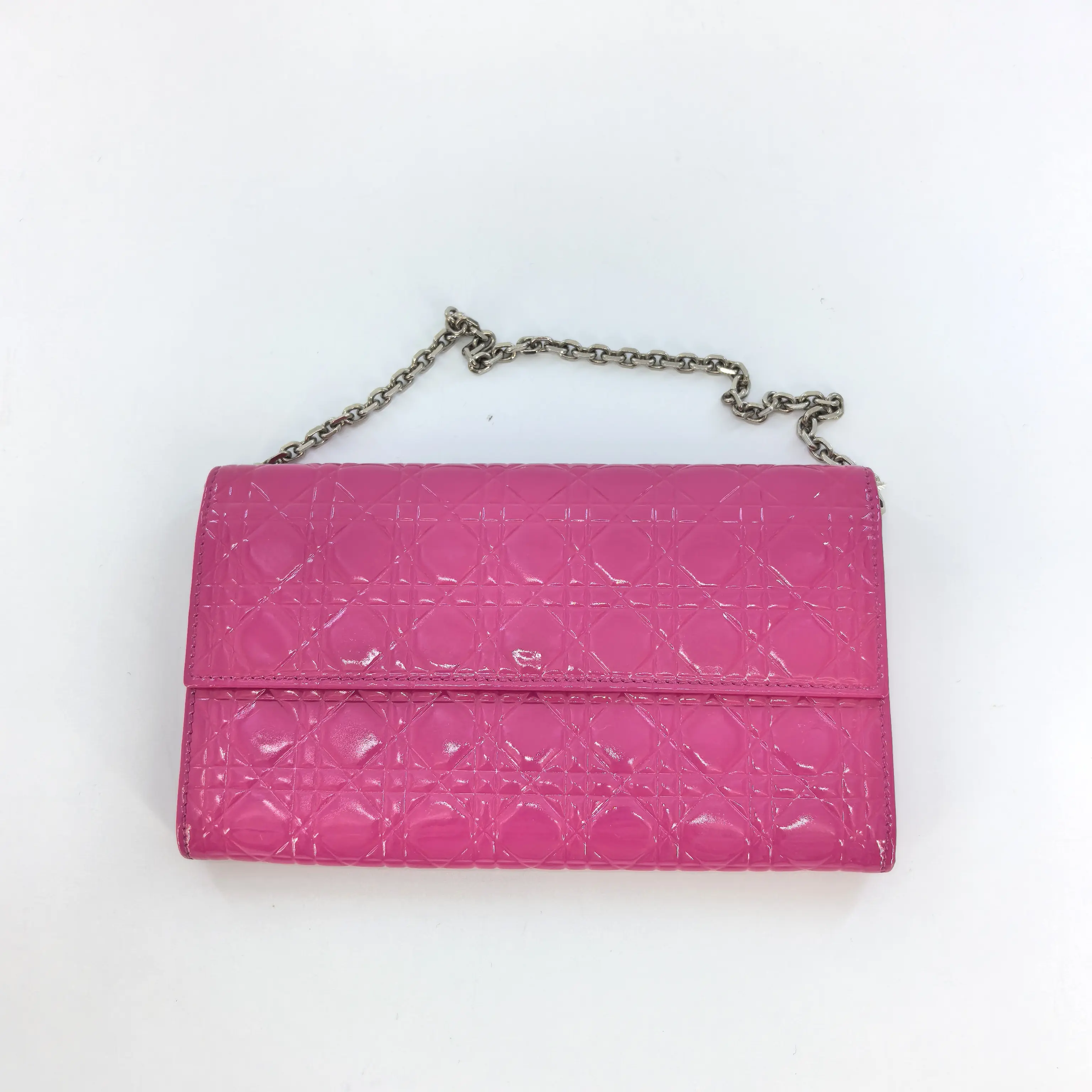 Discover the WOC Dior pink patent leather. This item stands out with its vibrant pink hue and sleek patent leather finish. Perfect for those seeking a stylish accessory that makes a statement. The design is simple yet elegant, suitable for various occasions.