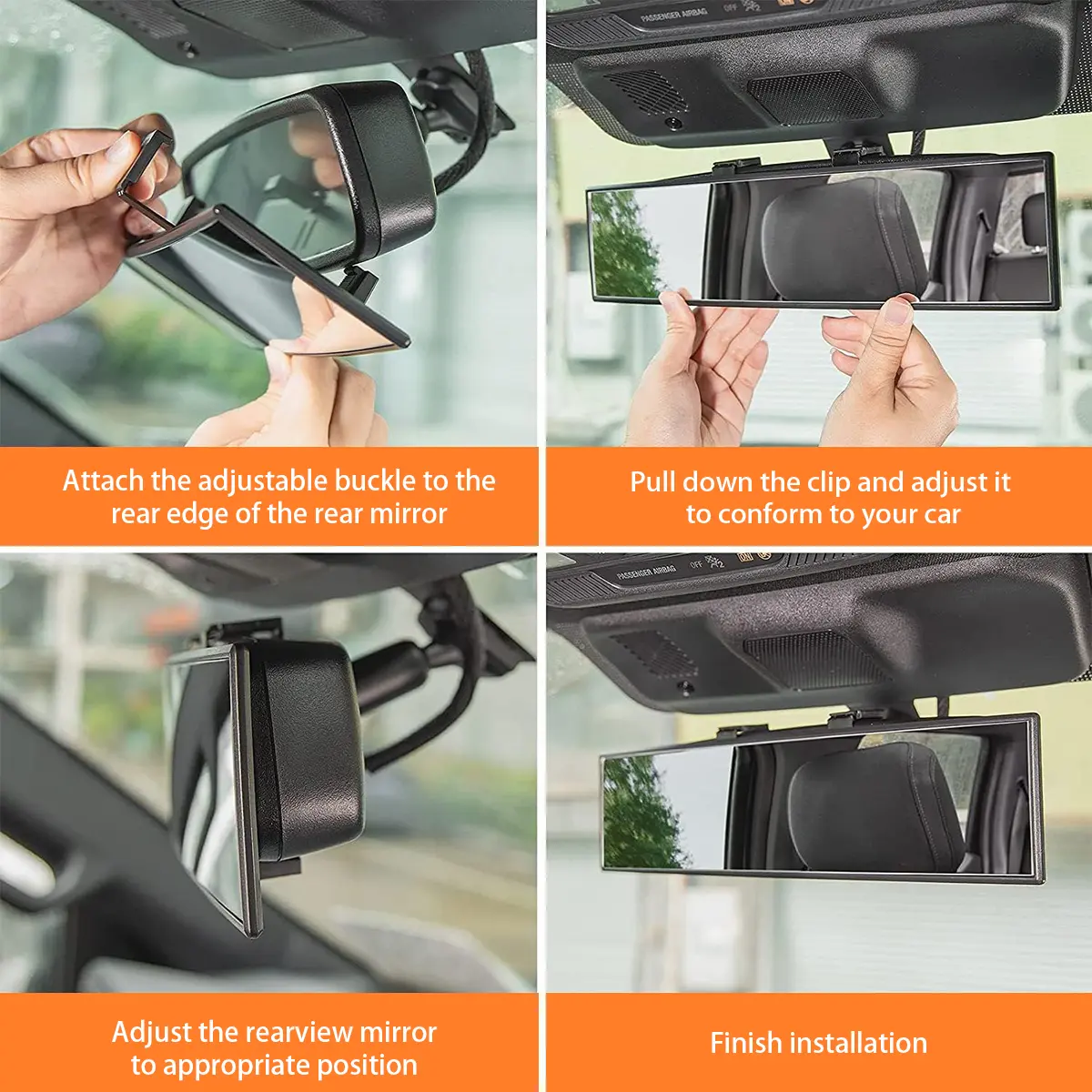 [Easy Installation]: Simply attach the adjustable clips located on the back of the mirror to the bottom edge of your vehicle's original rearview mirror and adjust the angle as needed. Note: Please avoid applying excessive force when pressing on the mirror.