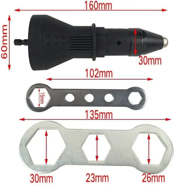 ·【DETAILS】Function: riveting.Big wrench:13.5cm/5.35",Small wrench: 10cm/3.94". Working with power drill:≥1.5N.m. Riveting tool: 16 x 5.8cm/6.30" x 2.28". Nozzle size: 2.4mm, 3.2mm, 4.0mm, 4.8mm ".