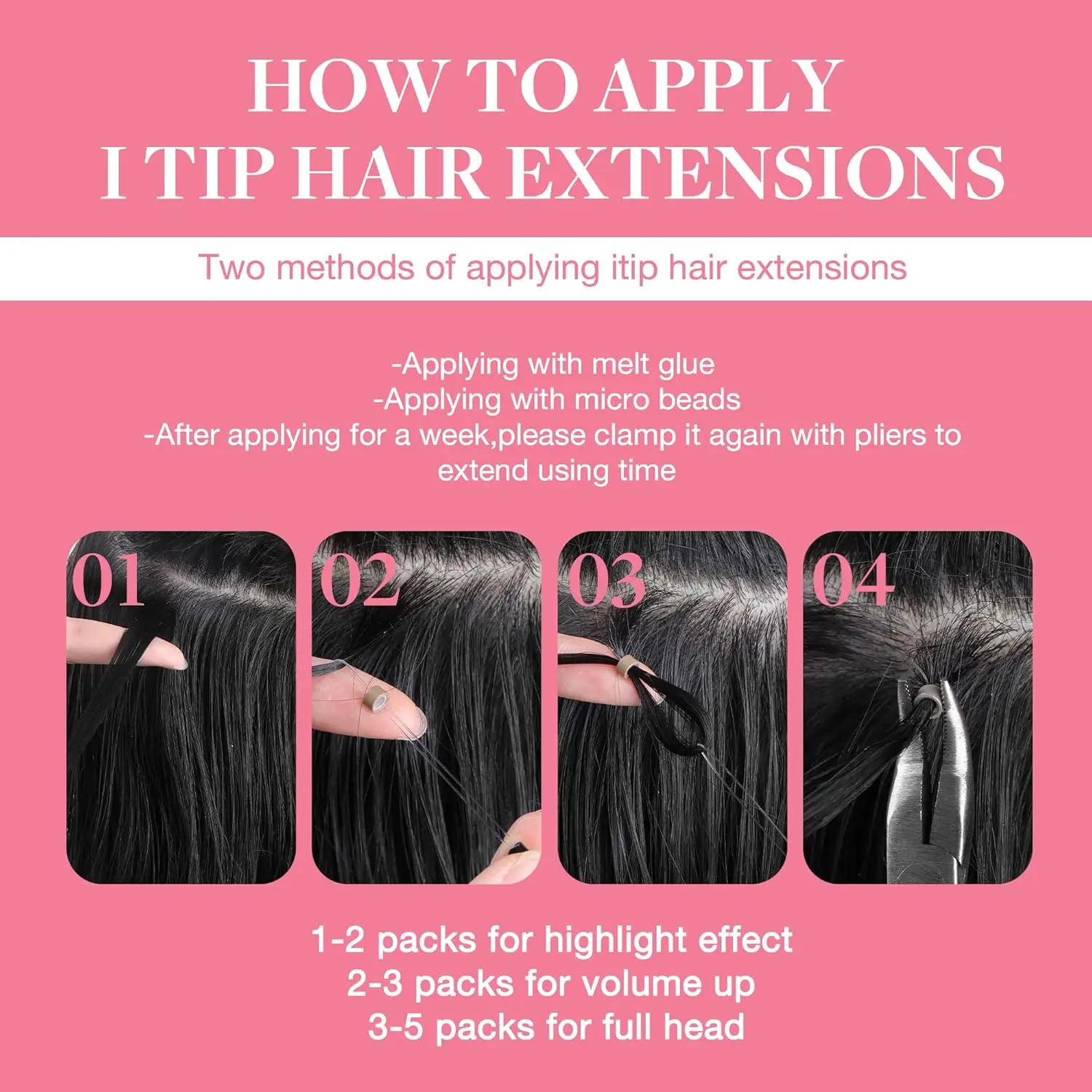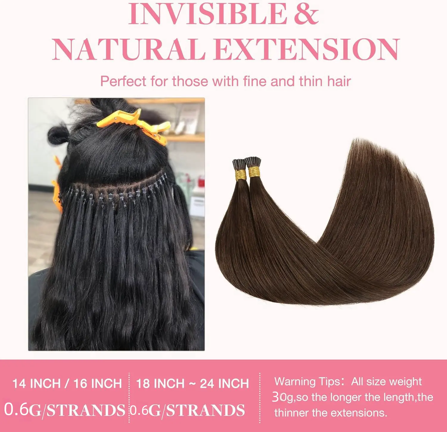 These long straight I-Tip extensions come in 12-20 inch optional lengths. Each pack contains 50 strands with a total weight of 30g, ideal for partial volume or length boosting. To achieve a full, thick and natural full-head hairstyle, we recommend using 5-6 packs, easily transforming your look from short to long.