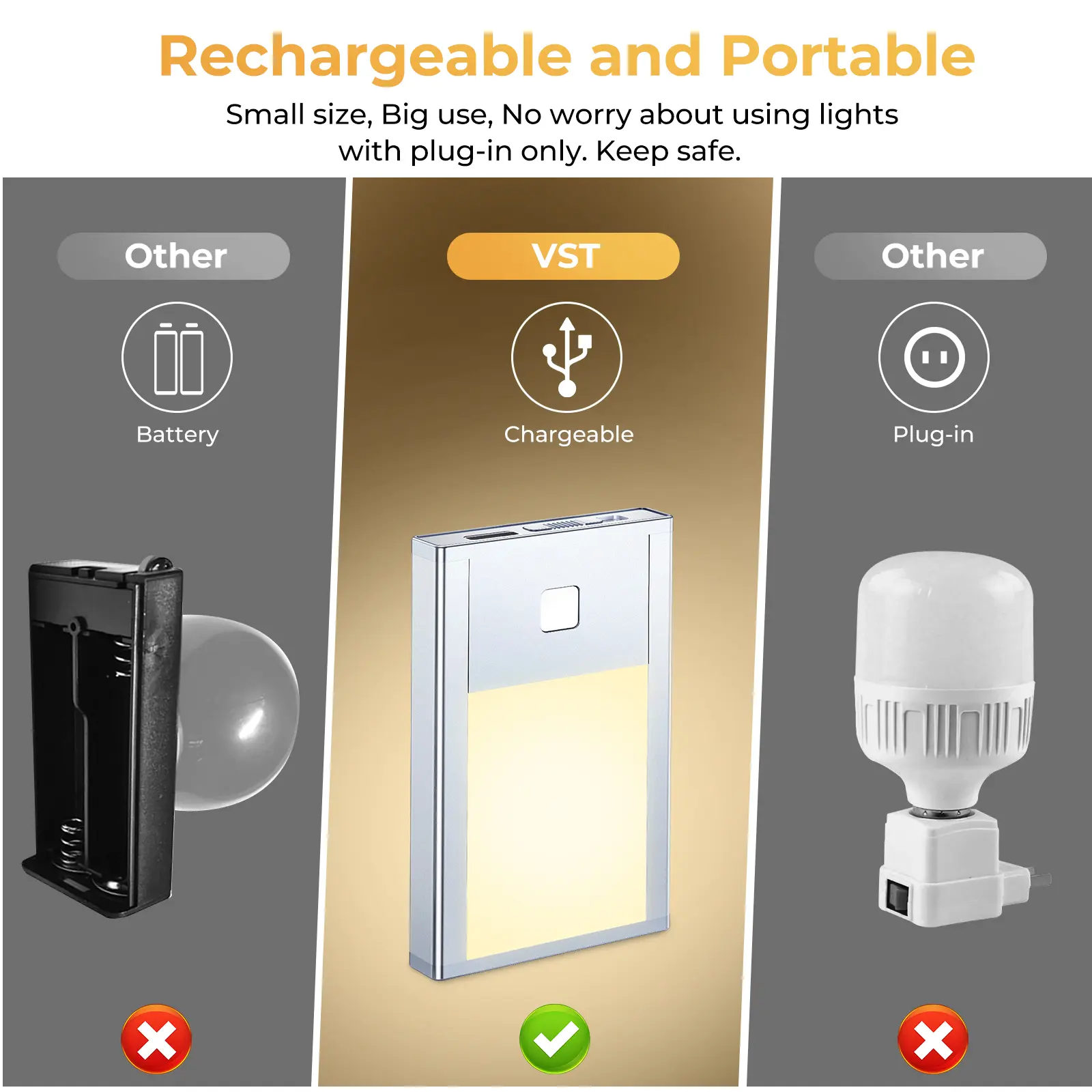 VST Motion Sensor Step Night Light, Rechargeable Battery Powered Stair Lights with Magnetic Suck Installation for Indoor Bedroom Hallway Nursery Kids Room (2.68 inch 3000K 3Pack Silver)