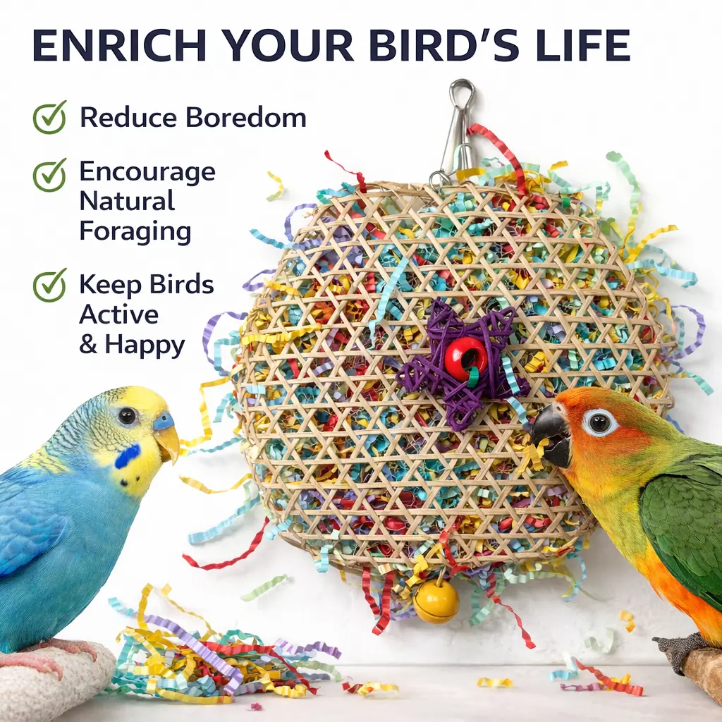 This hanging toy is ideal for small parrots, parakeets, conures, cockatiels, and love birds. It provides a fun and engaging activity for your feathered friend. The toy is designed to stimulate natural foraging behaviors, keeping your bird entertained and active.