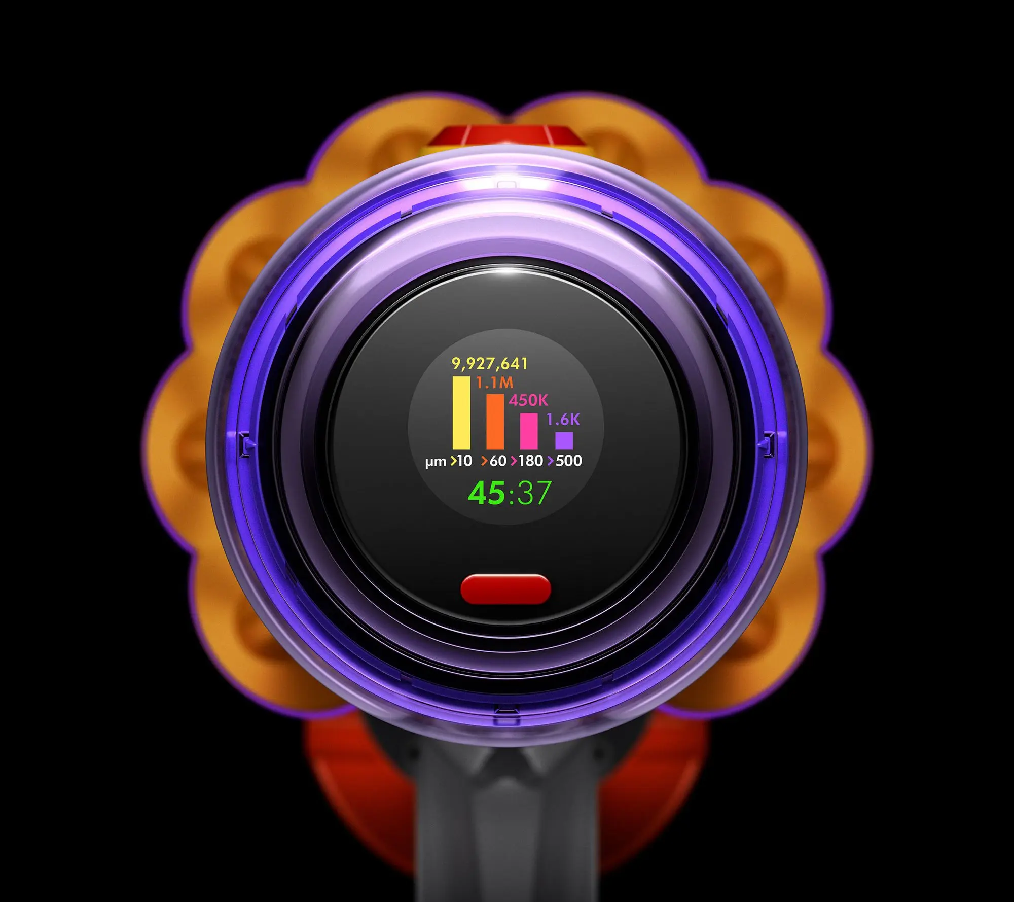 ·LCD screen displays run time countdown, power mode, and proof of a deep clean; calculates and categorizes picked-up particles