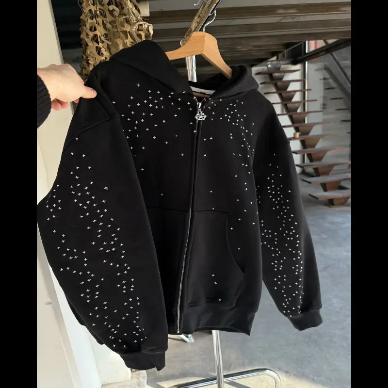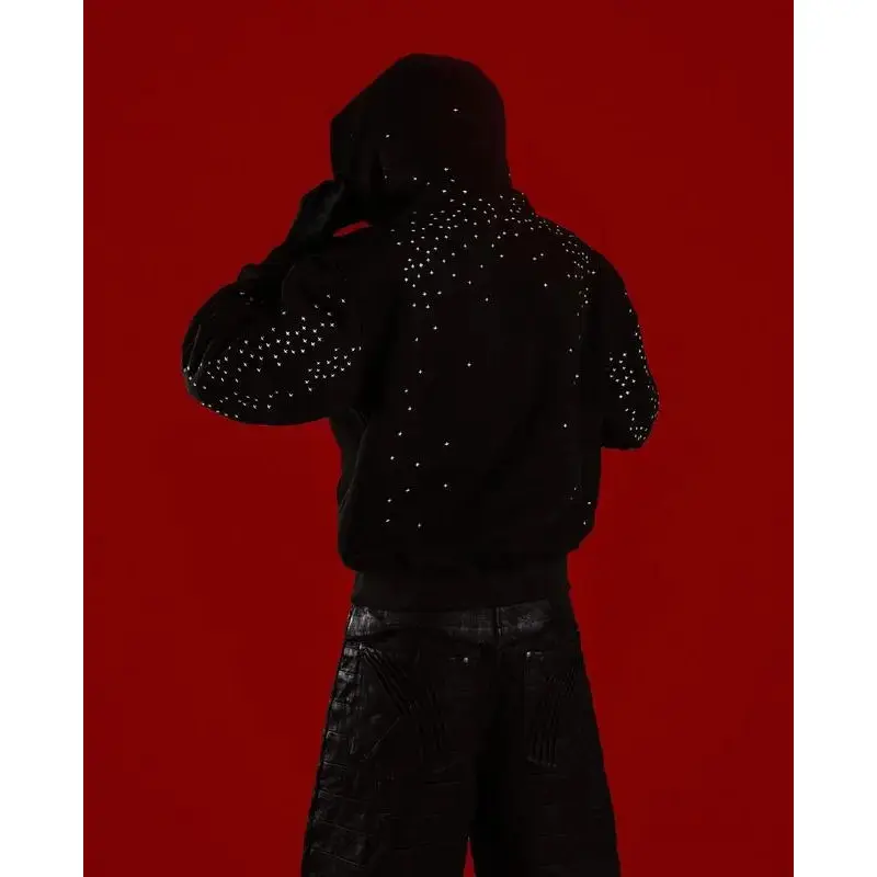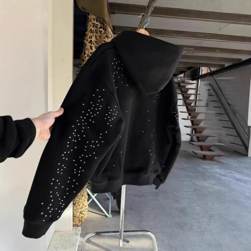 2026 Autumn Winter Starry Heavy Rhinestone Padded Shoulder Hooded Loose Jacket Tops Long Sleeve Casual Fitted Black Stretch Cotton with Pocket Geometric Print Fleece Hoodie Unisex Trendy for Daily Wear