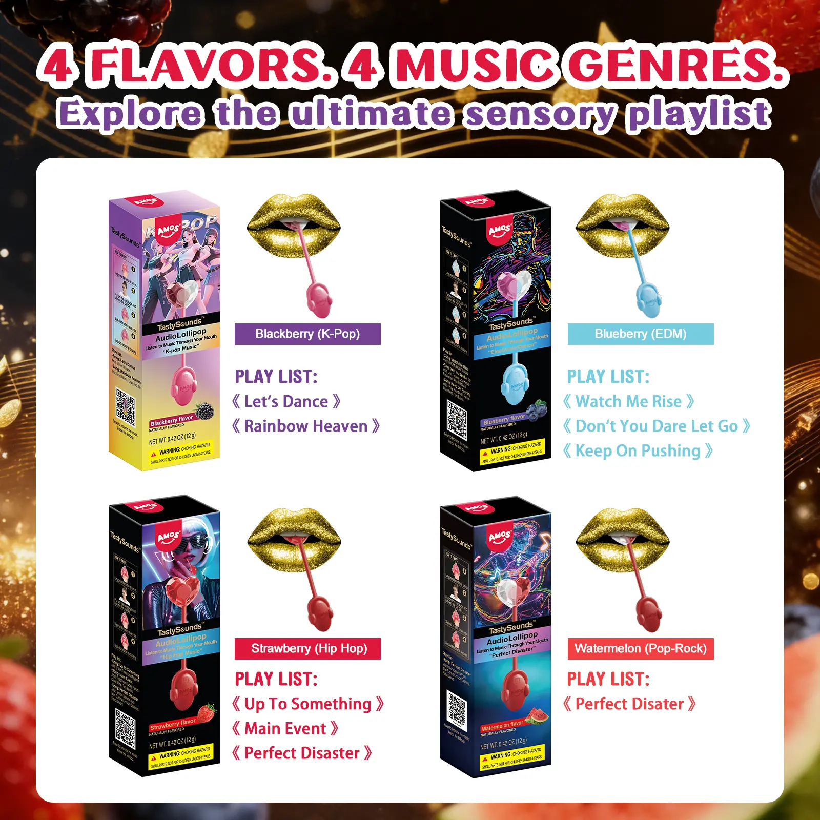 Turn candy into an experience with the AMOS TastySounds Audio Lollipop Gift Set – where flavor meets music and style.