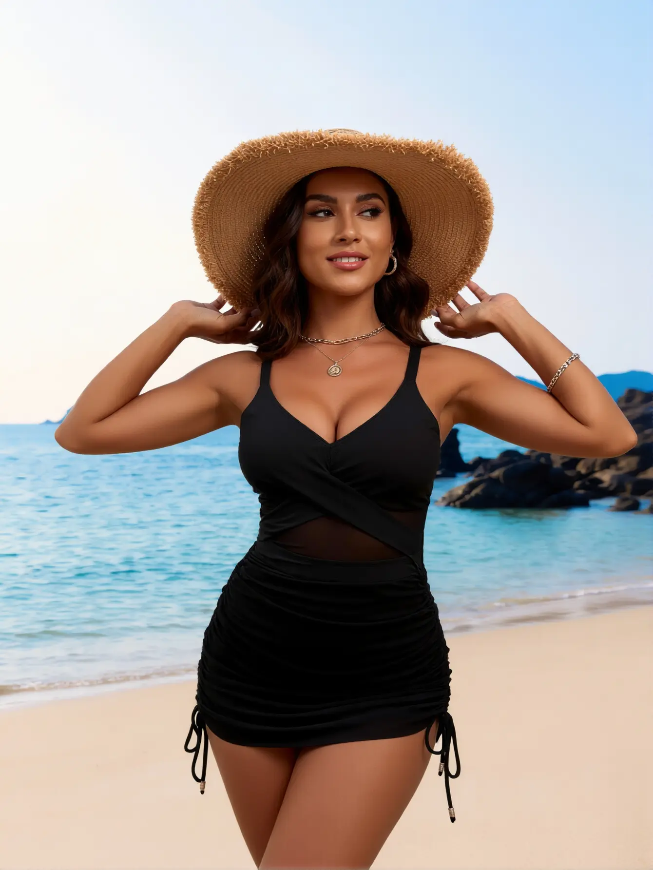 This stylish monokini is ideal for tropical getaways. The V-neck design and tummy-control feature make it a standout choice. The drawstring allows for a customizable fit. Perfect for social media trends, this swimsuit combines fashion with functionality.