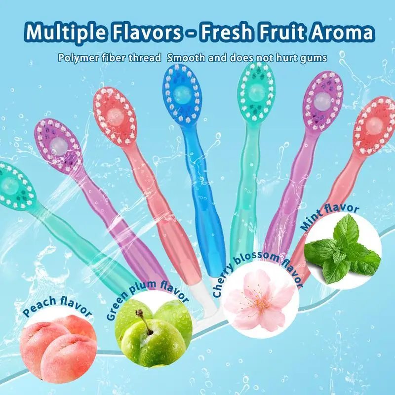 Pre-applied toothpaste & multiple flavors: Each toothbrush comes with pre-applied toothpaste featuring refreshing flavors such as peach, cherry blossom, green tea, mint, and citrus—simply brush and enjoy instant freshness.