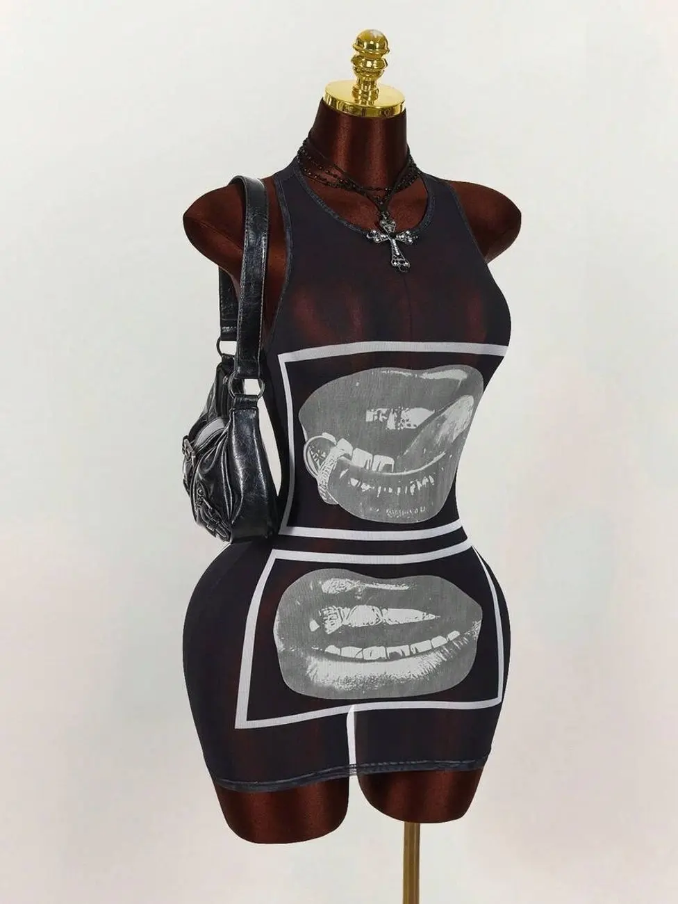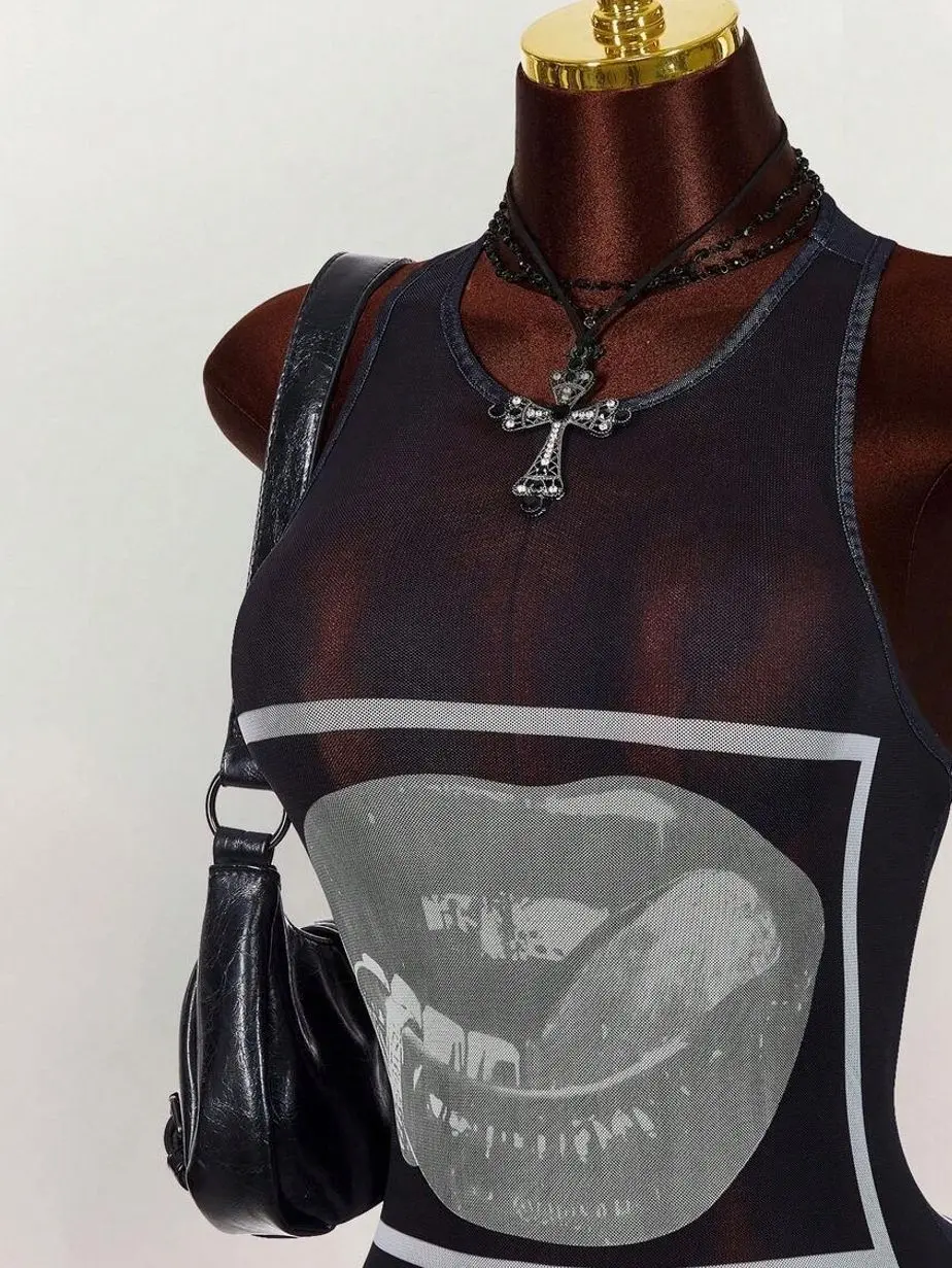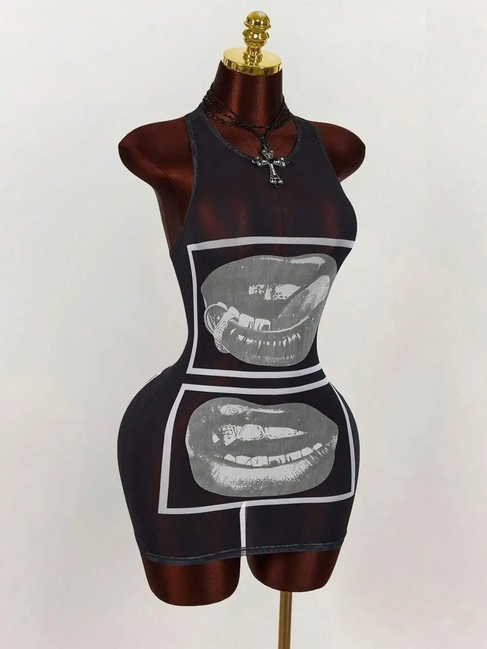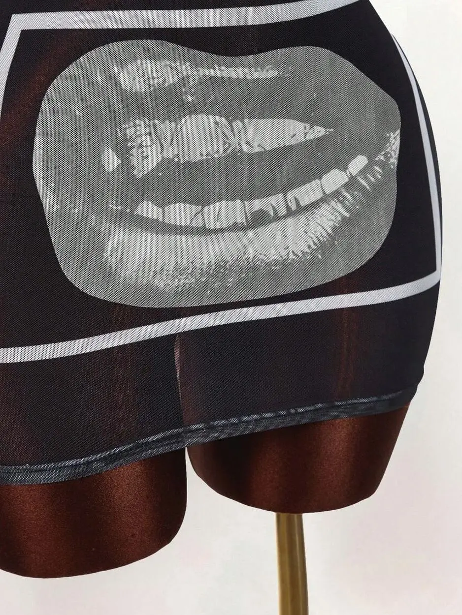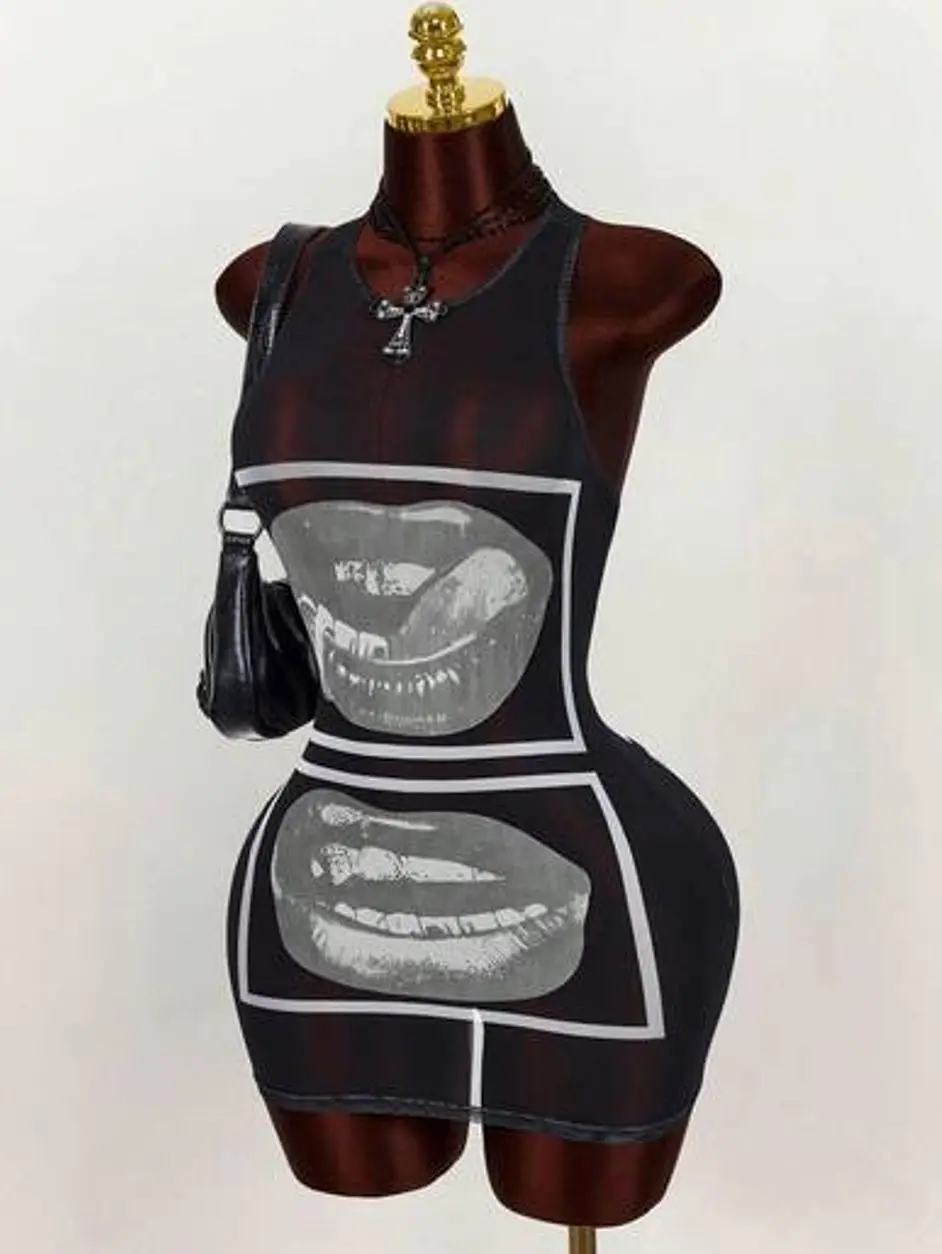 Amplova Gyaru Style Rave Outfits Festival Rave Outfits Festival Lip Print Sheer Bodycon Mini Dress