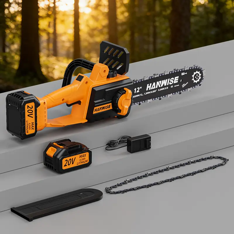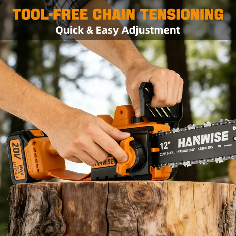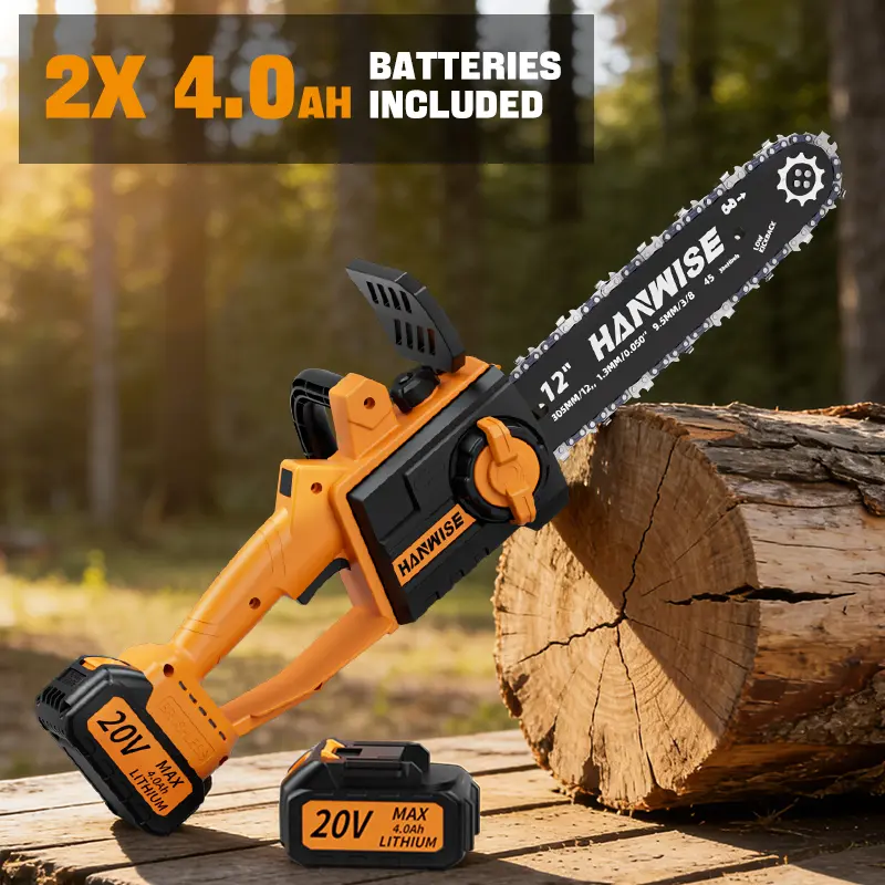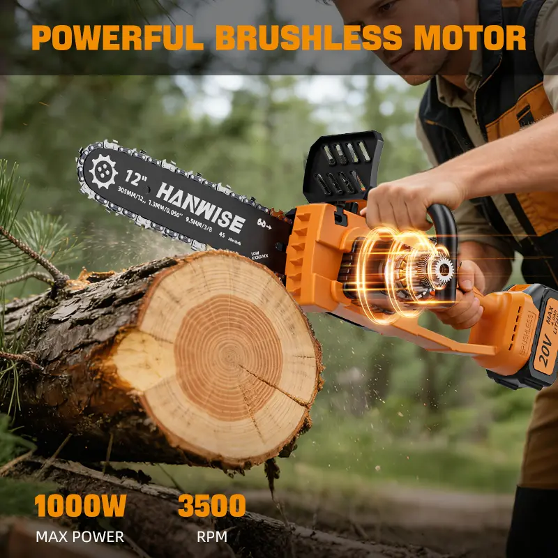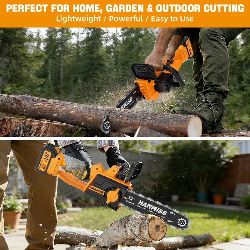 HANWISE 12 inch brushless electric chain saw, enhanced handheld design, with wireless and portable functions. Suitable for cutting wood, pruning trees, and maintaining courtyards and gardens. It is an excellent gift choice for men and husbands.