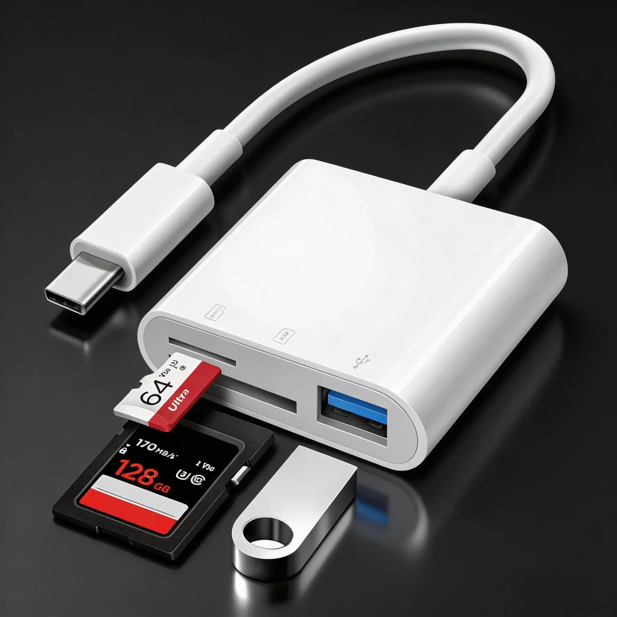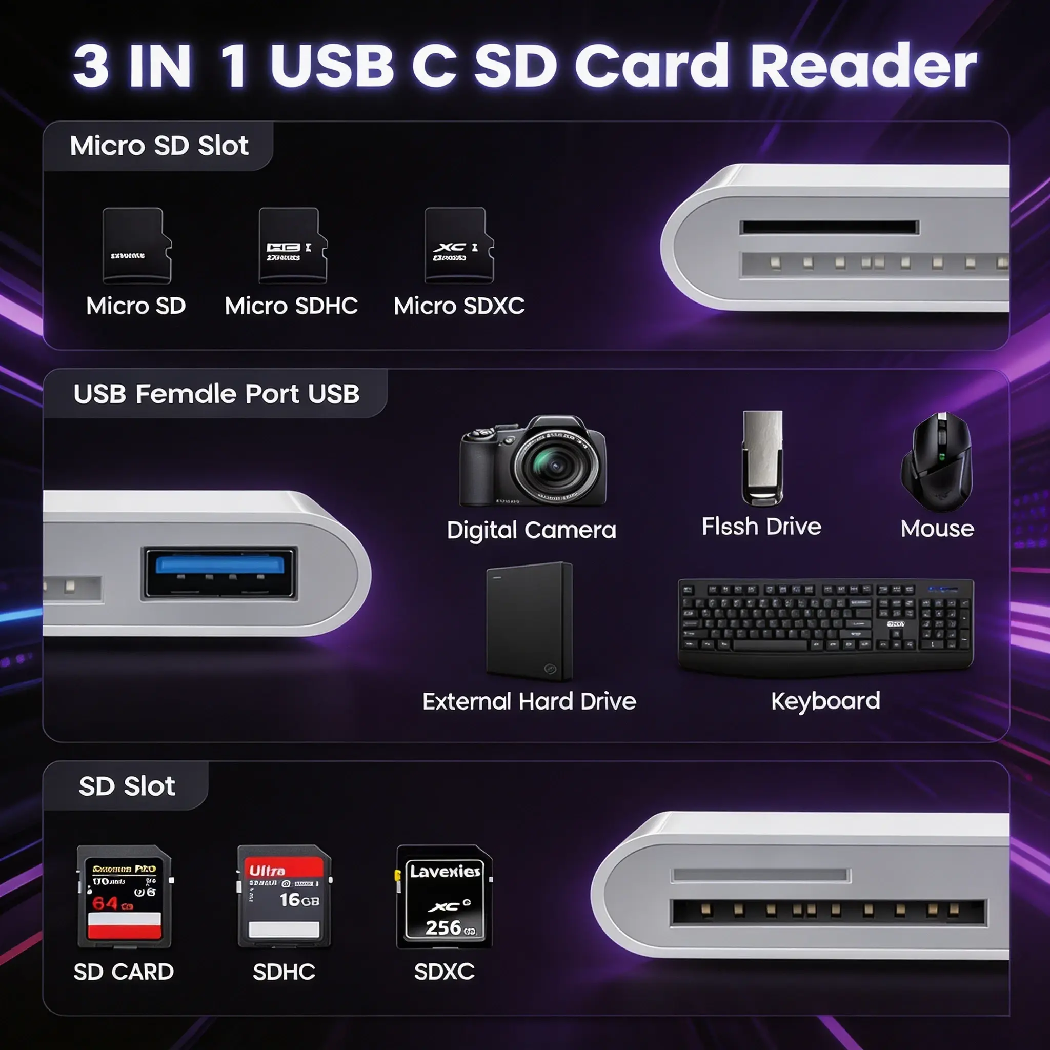 Fermoved 3-in-1 USB C Card Reader – Plug & Play for iPhone, iPad, MacBook, and More Type-C Devices
