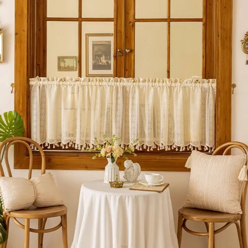 1pc Cotton Linen Curtain Half Light Blocking Vertical Striped Lace Fringe Rod Pocket, New Living Room Bedroom Cream French Vintage Style