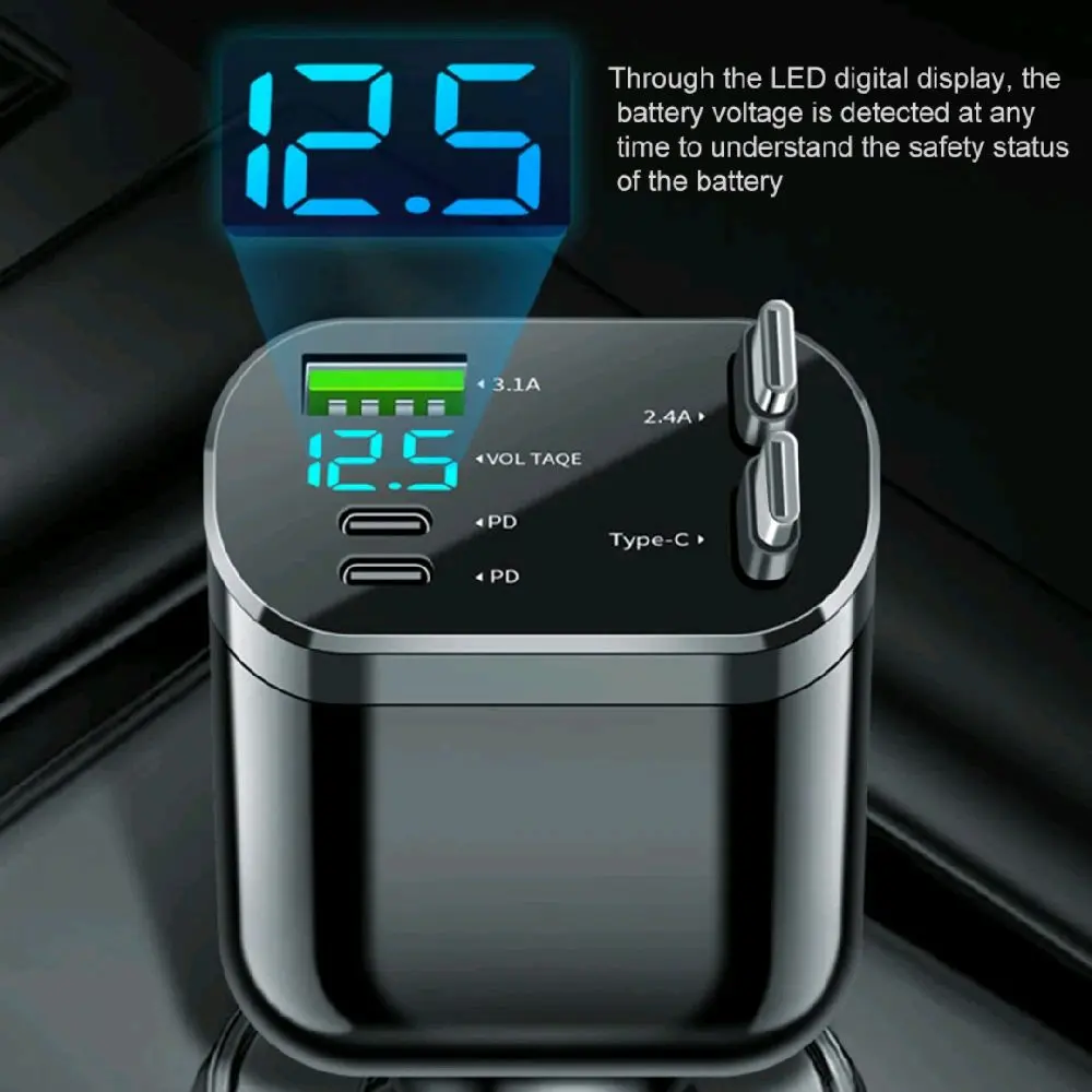 5 in 1 fast Car Charger PD Fast Charging L+ C Retractable Cable Foldable Car Power Adapter 2 PD Ports and USB Interface Super Fast Charging for iPhone Samsung Android Power Bank Car Accessories Road Trip charger.car charger for iPhone and Android phone