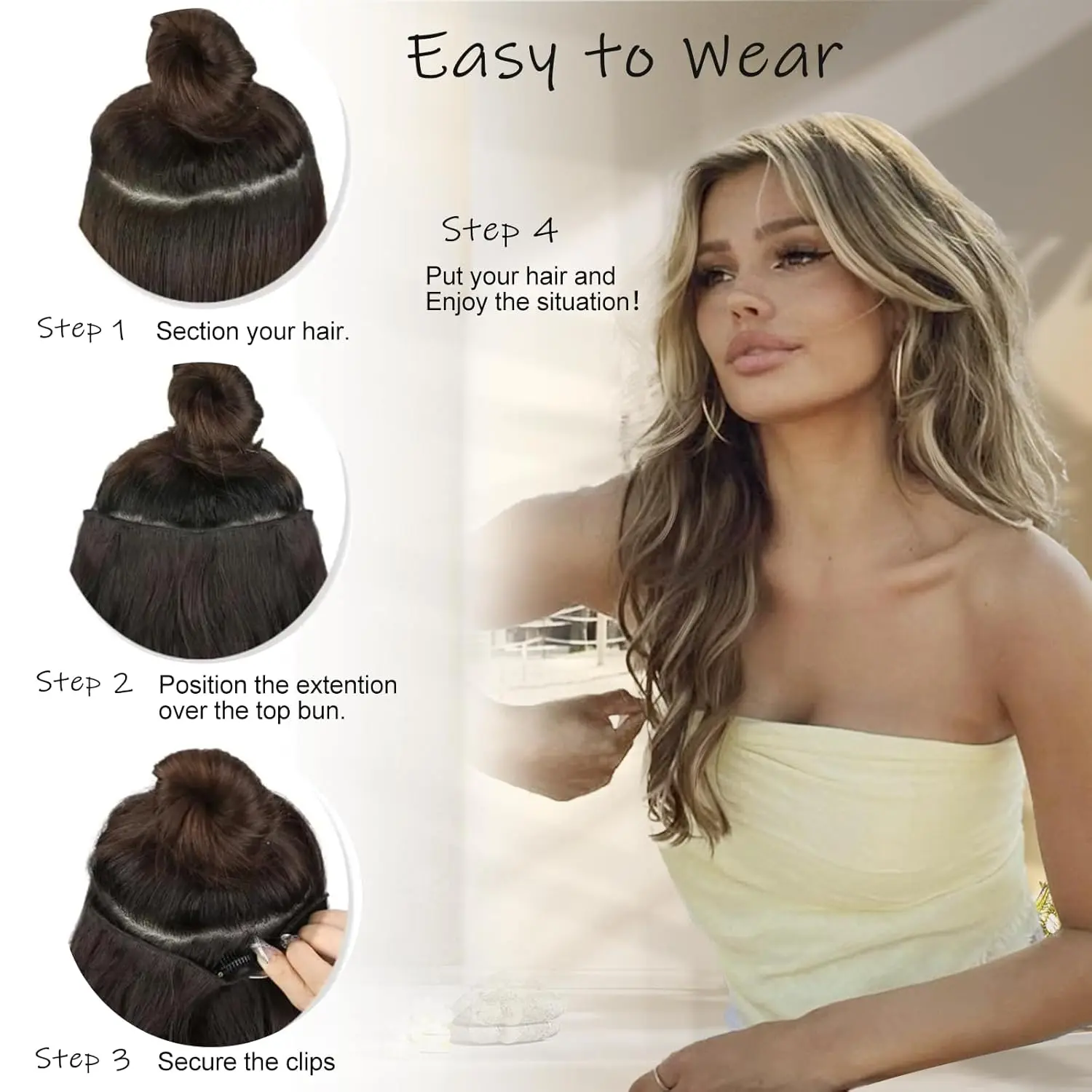 Blend: Drop your top layer of hair and lightly brush. The Ash Blonde highlights will weave through your natural strands for a stunning, multi-tonal finish.