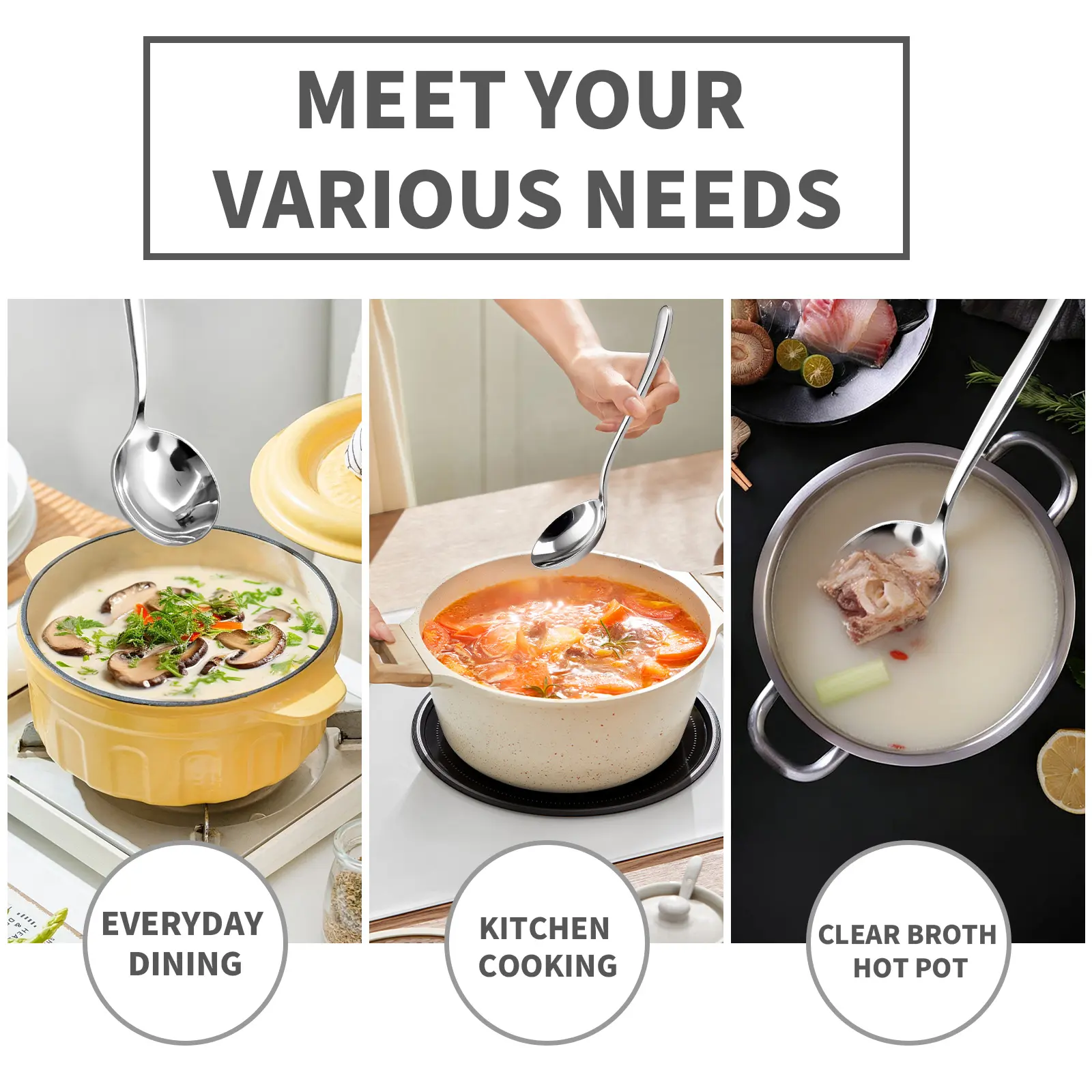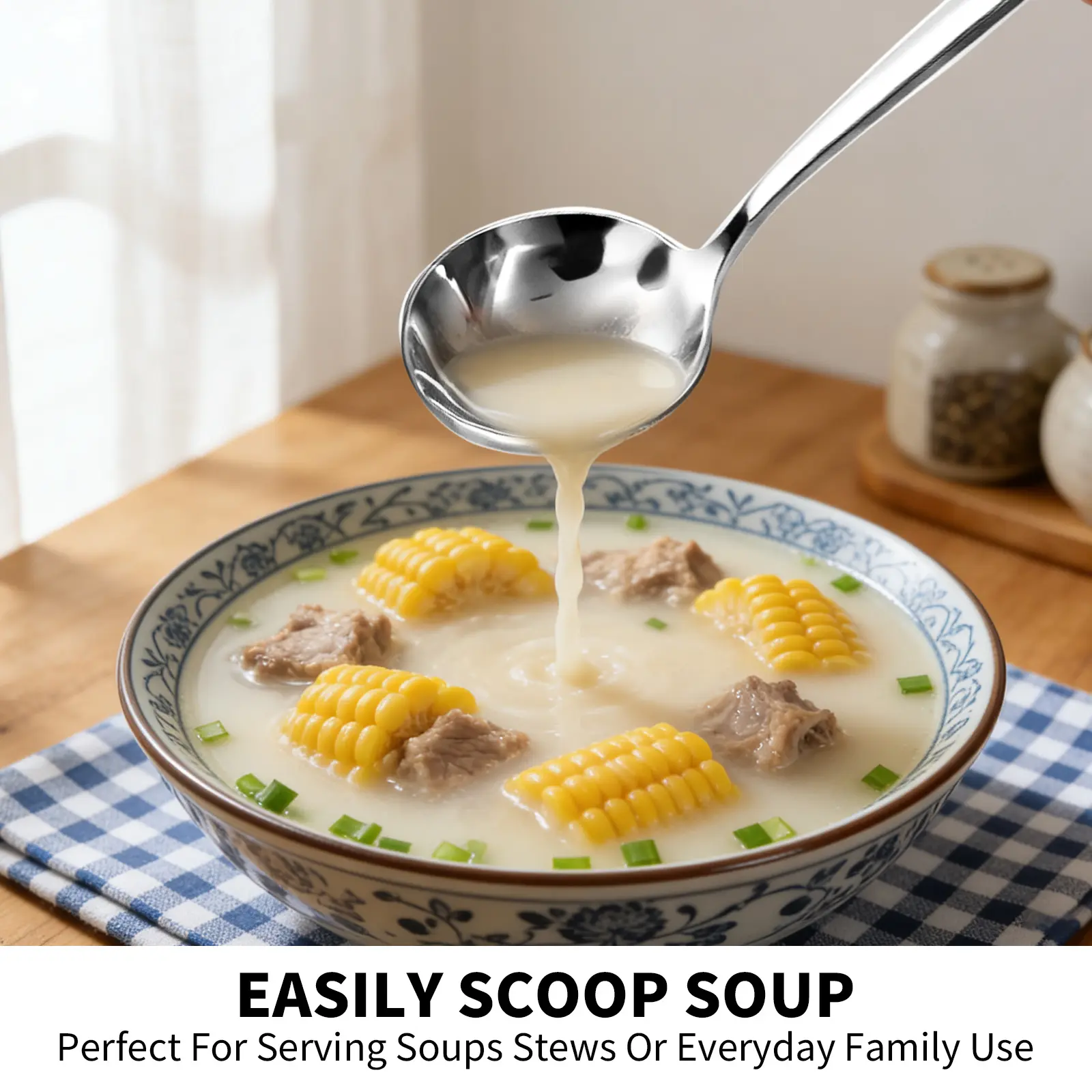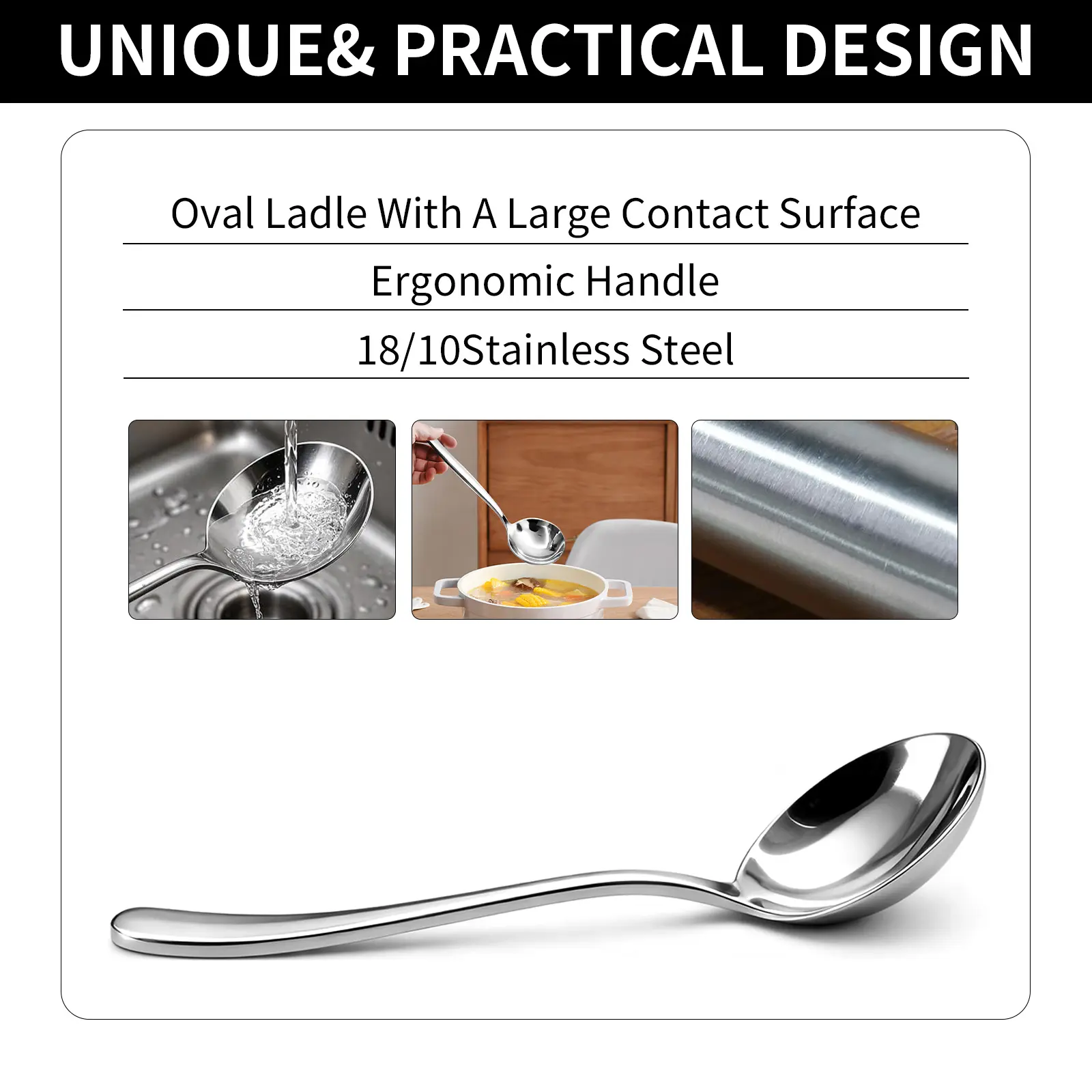 Ergonomic Handle: Designed for a balanced, comfortable grip, ideal for scooping soups, stews, and other dishes