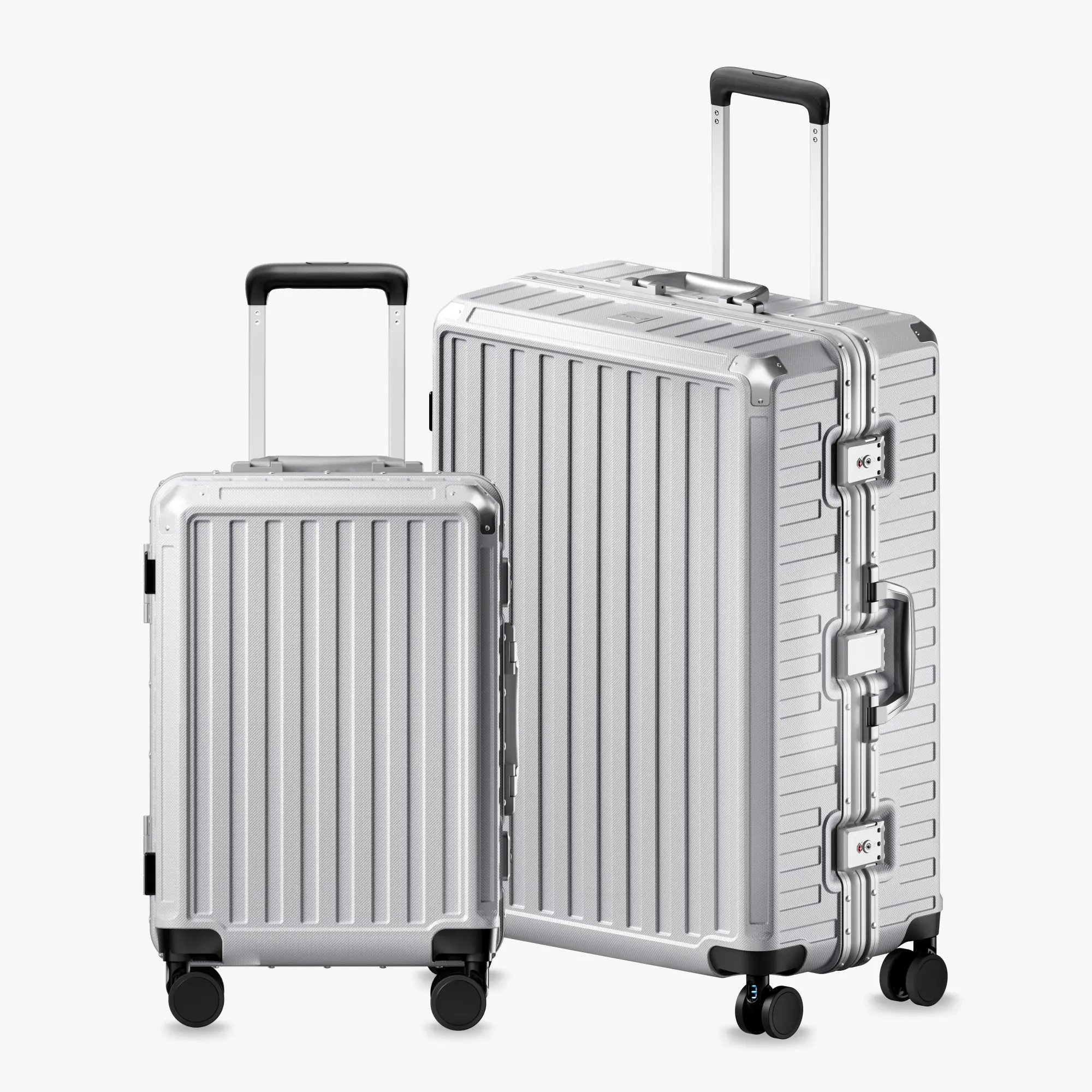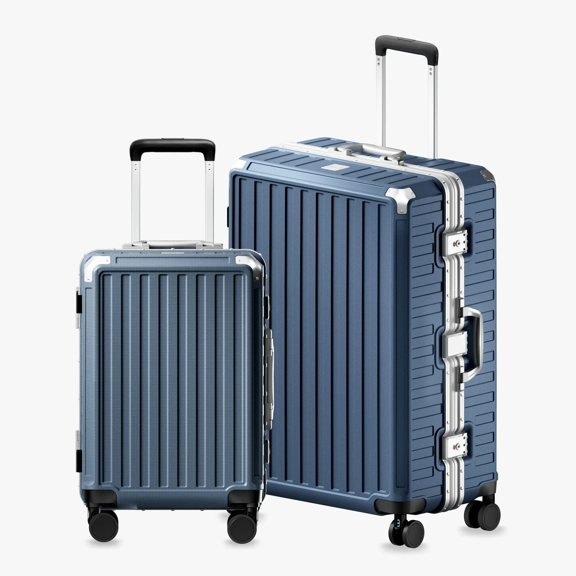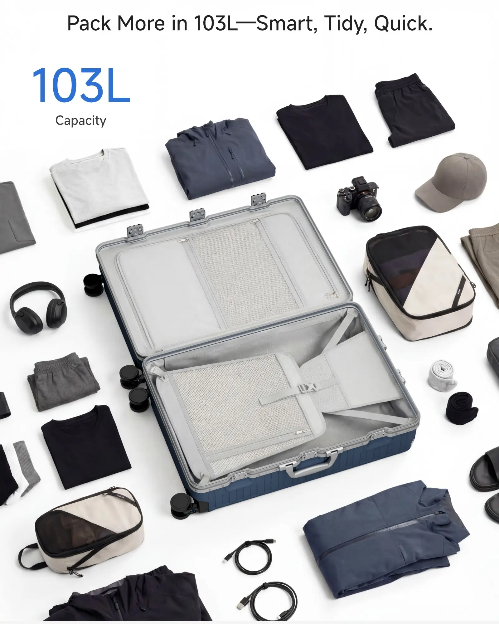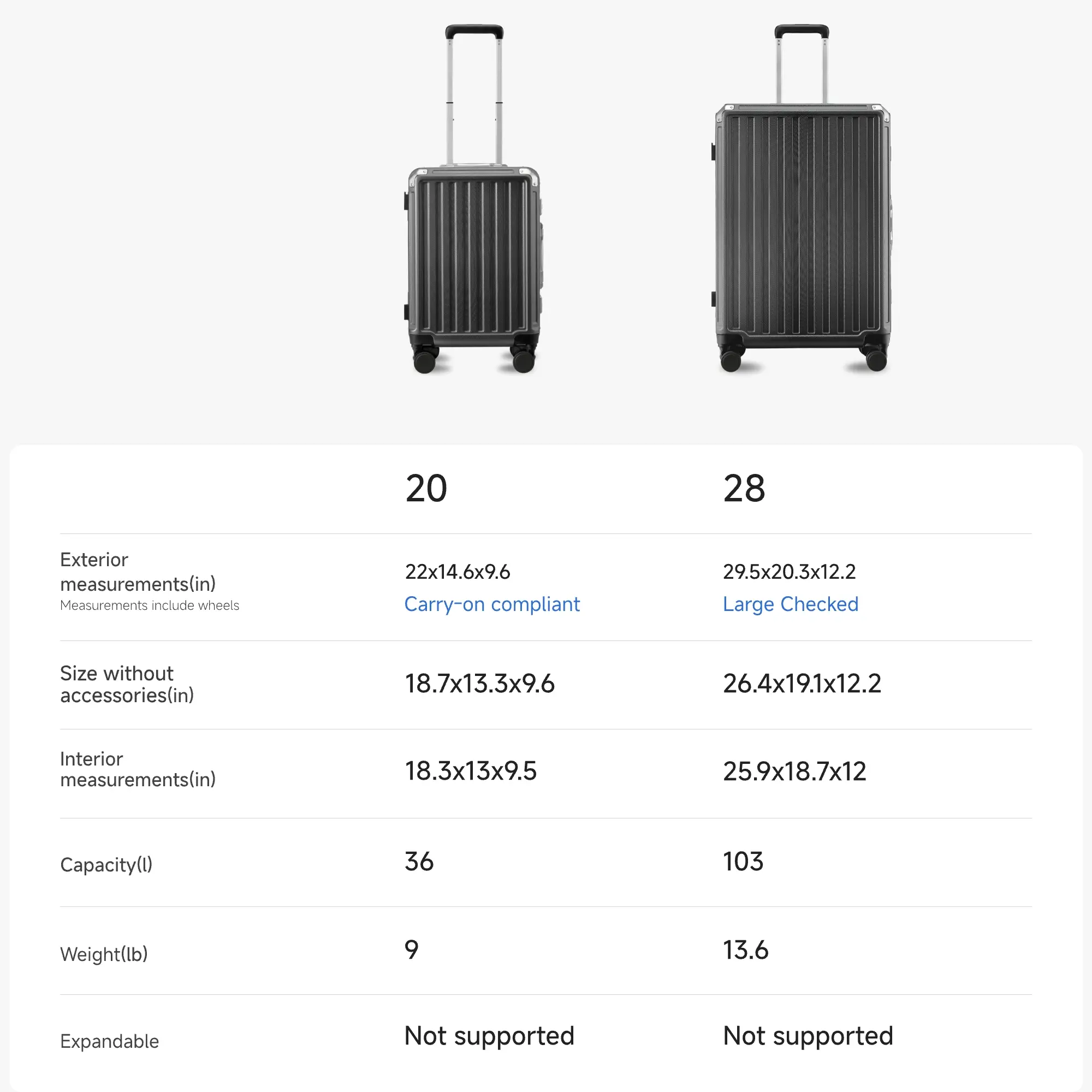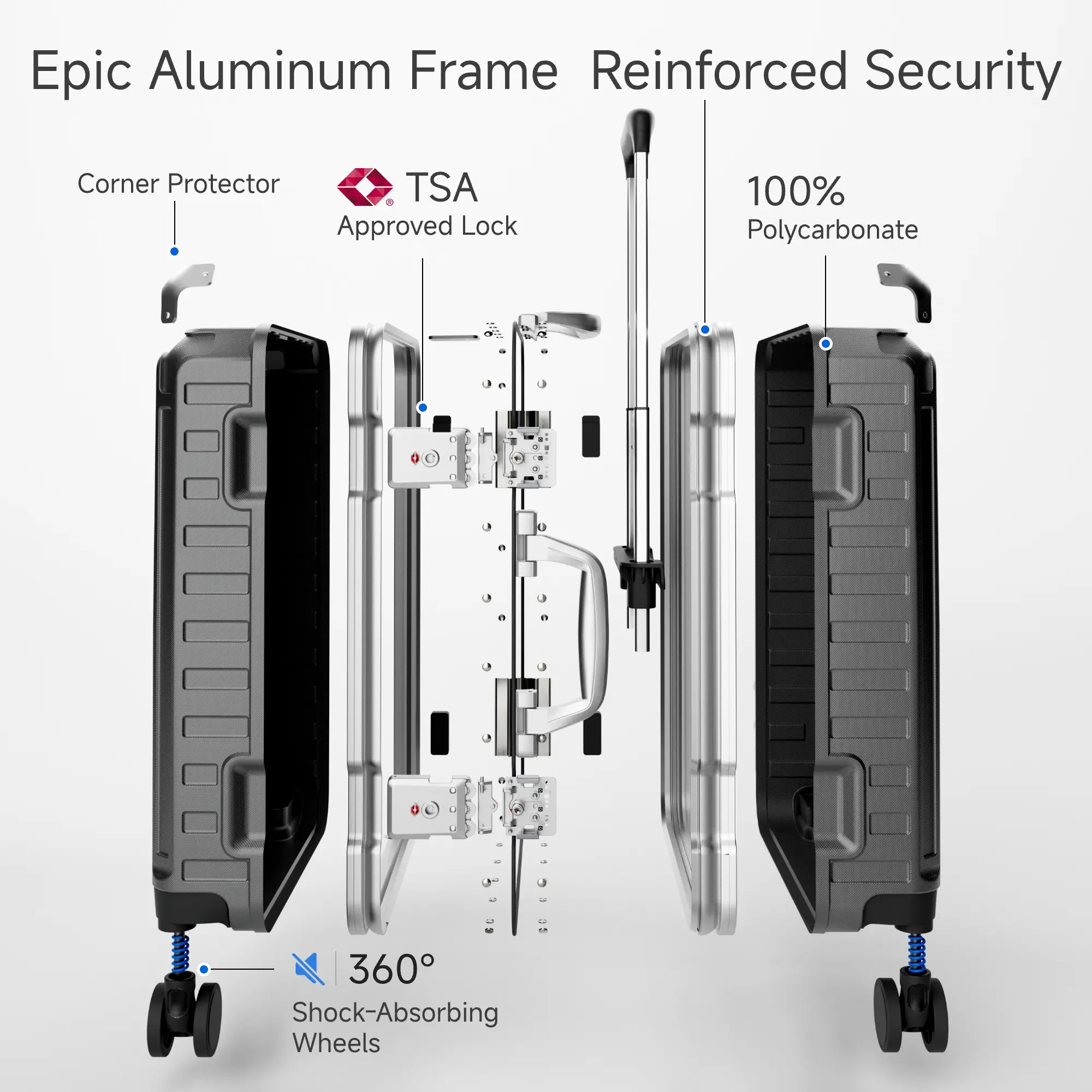 • Aluminum Frame + 100% PC: One-piece molded aluminum frame for deformation resistance and reinforcement; 100% PC case, with superior toughness and resilience compared to ABS+PC, providing 360° robust protection for luggage safety.