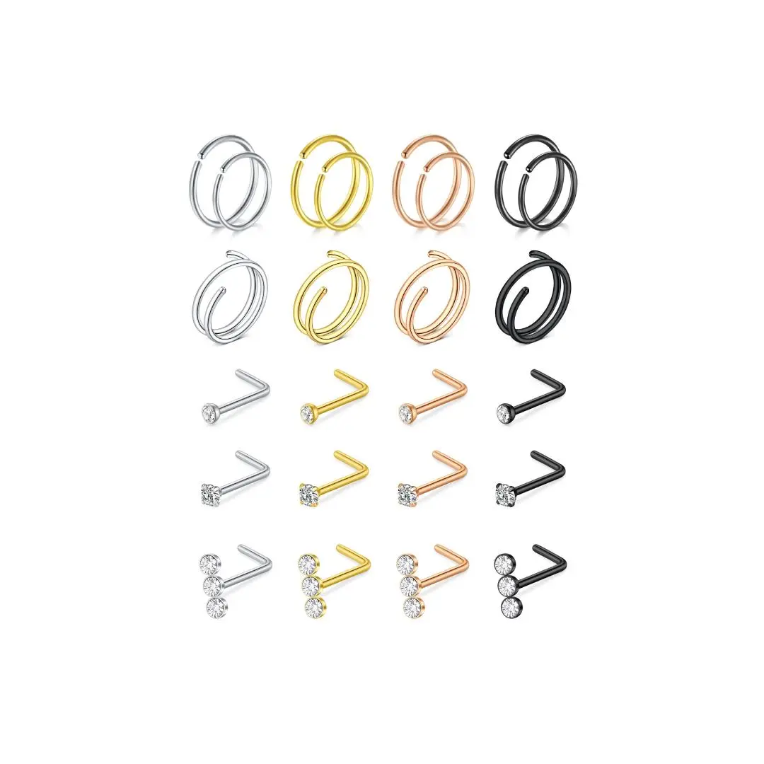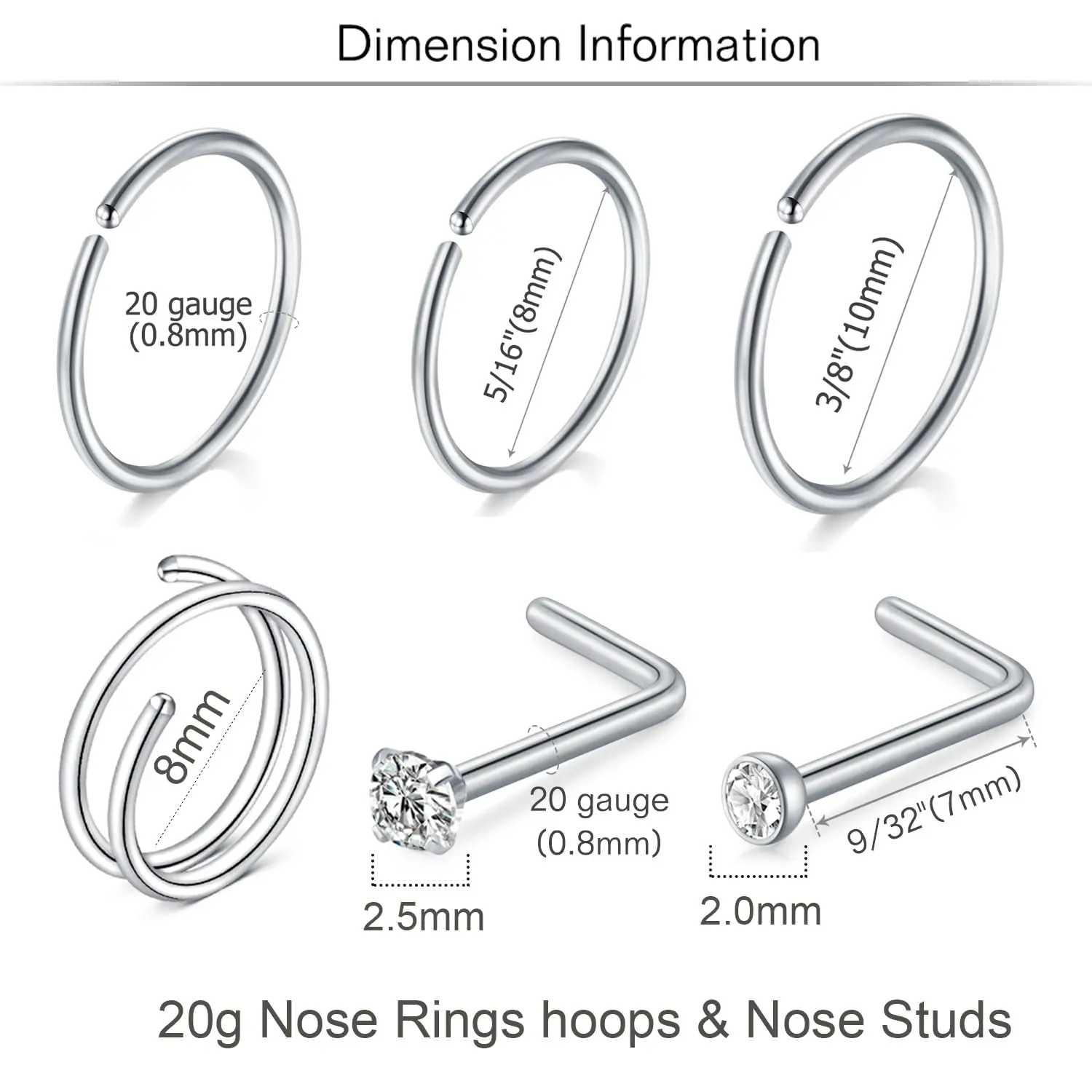 [Measurements]: Simple nose rings hoops 20gauge (0.8mm), inner diameter: 5/16"(8mm), 3/8"(10MM); double hoop nose ring 20g, inner diameter: 5/16"(8mm); Nose studs 20 gauge (0.8mm), nose rings studs l shaped pole length: 7mm;