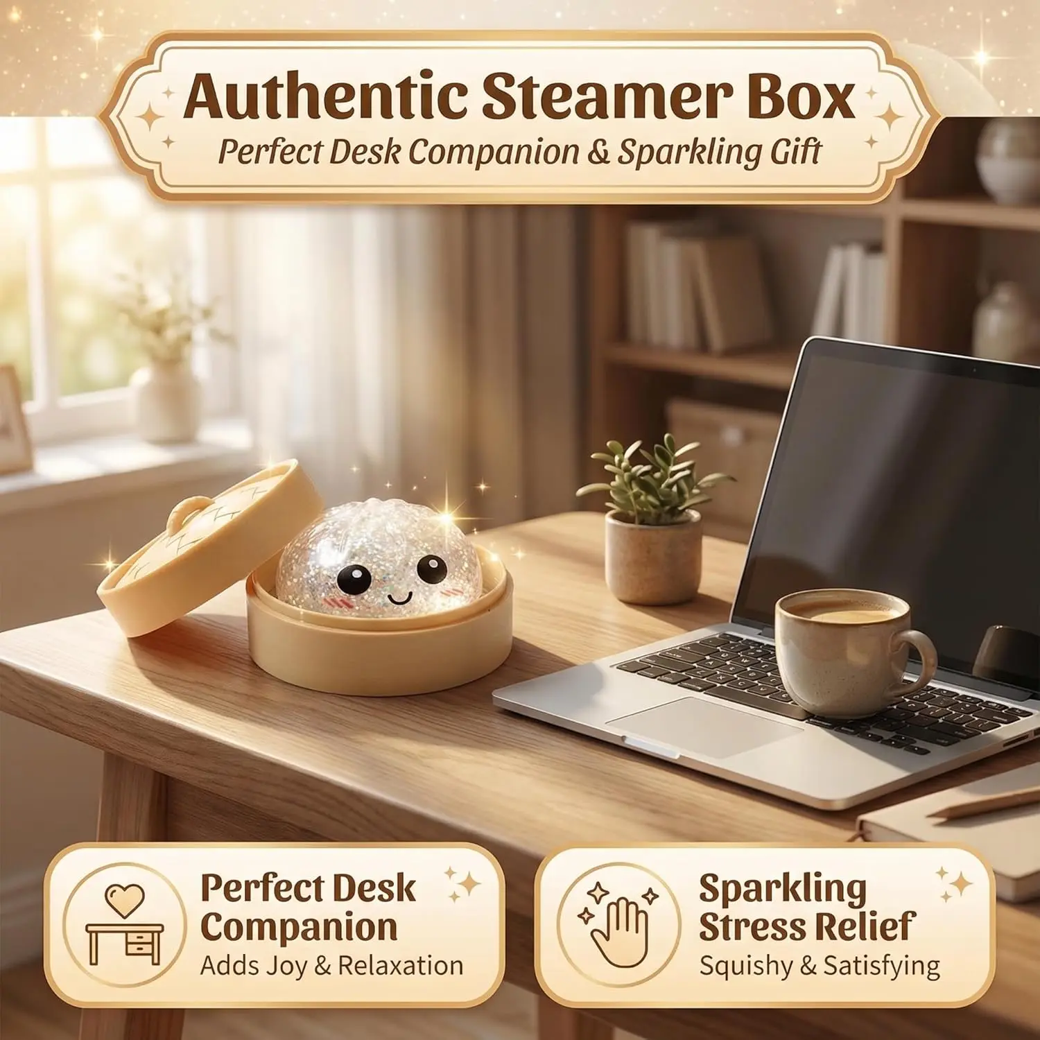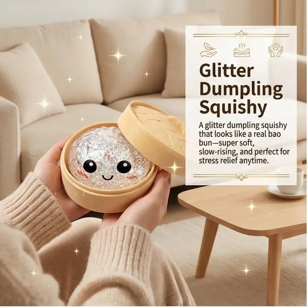 This 2026 new glitter dumpling squeeze stress reliever comes with a mini steamer case for easy carrying and storage. It features a slow-rising, soft and flexible texture that brings a comfortable tactile experience, helping ease tension and improve focus.