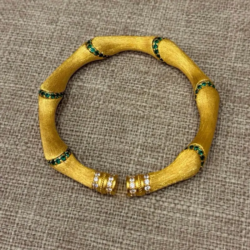 2439 Bamboo Joint Height Bracelet Vintage Brushed Craft Alloy Bracelet with Green and White Stones