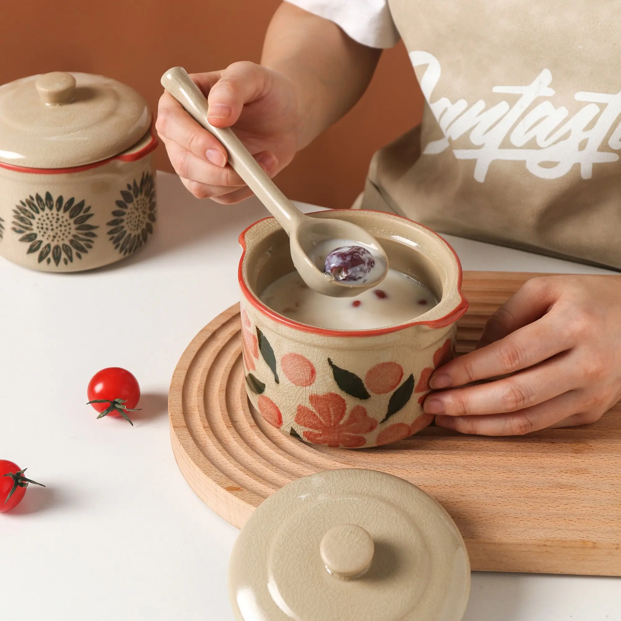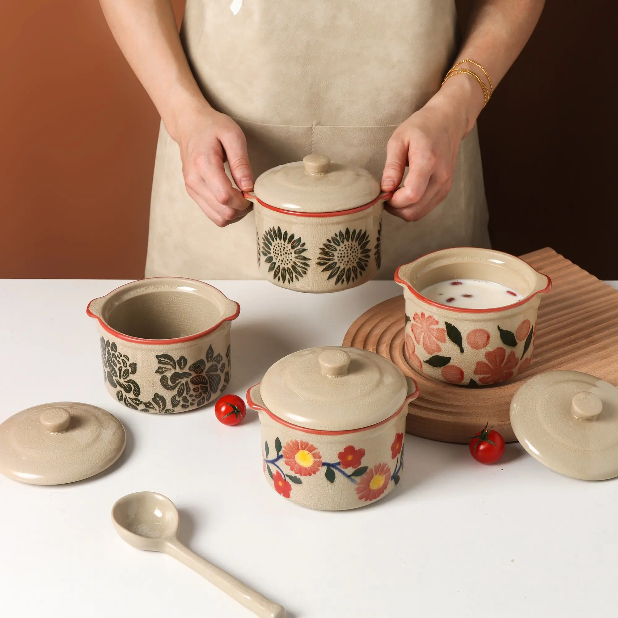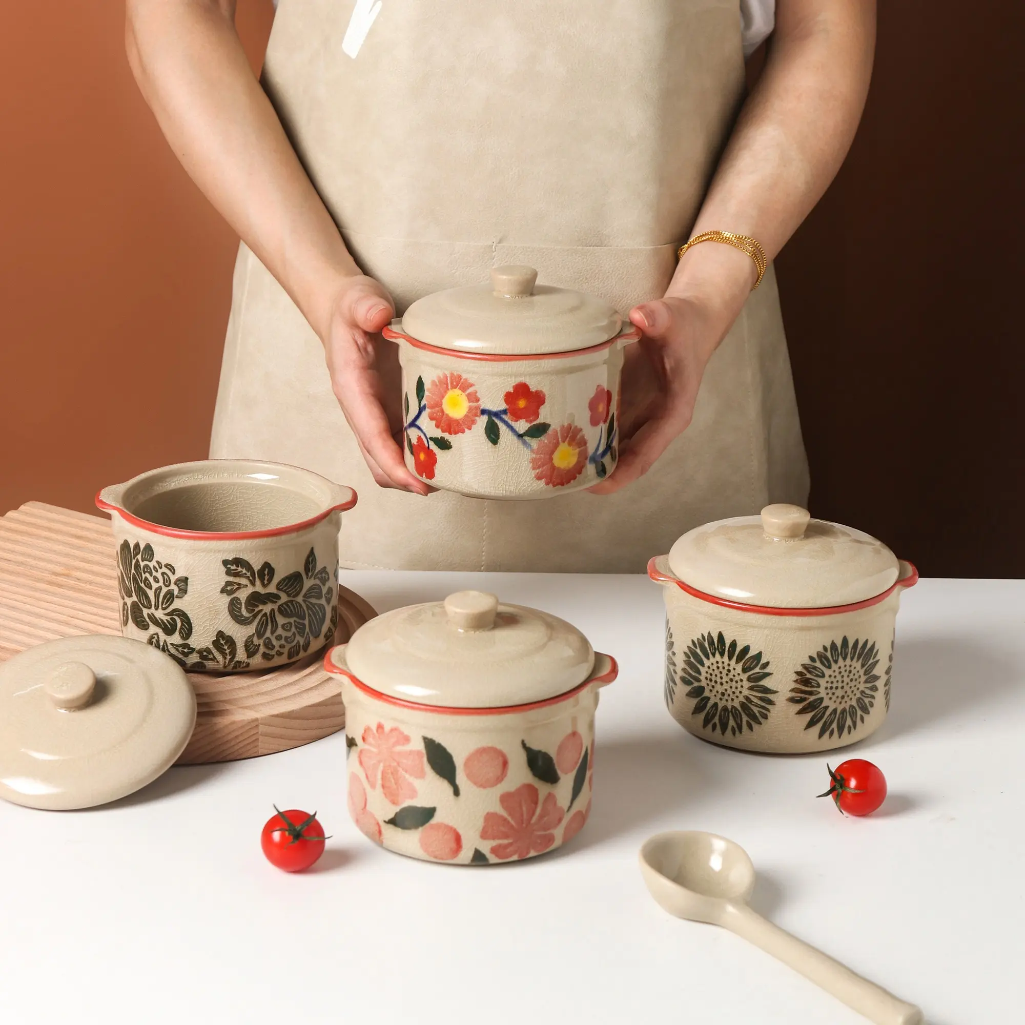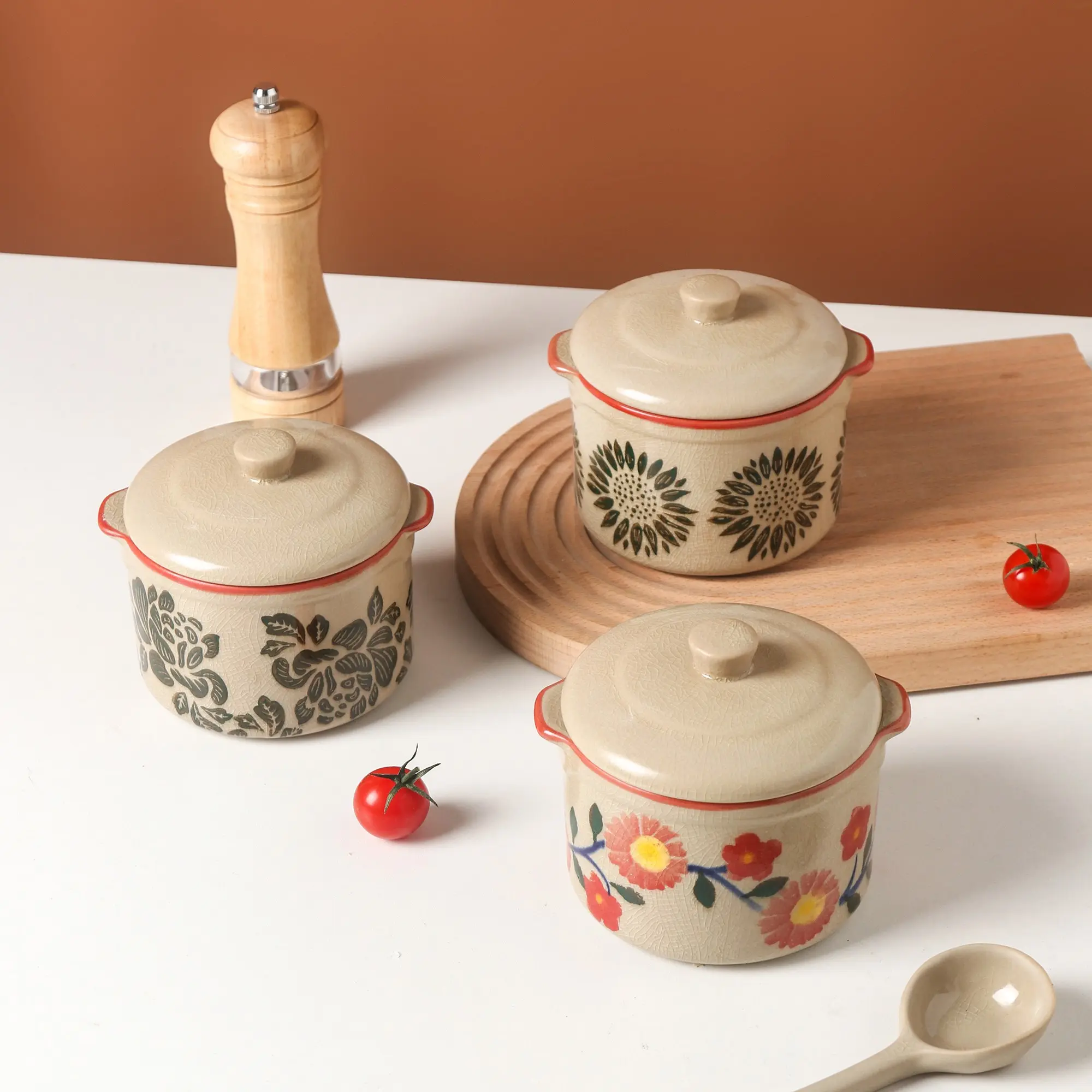 Ceramic Covered Casserole Dish, Ice Crack Pattern Steaming Pot, Unique Floral Design, Dishwasher Safe, Ideal for Soup and Noodles