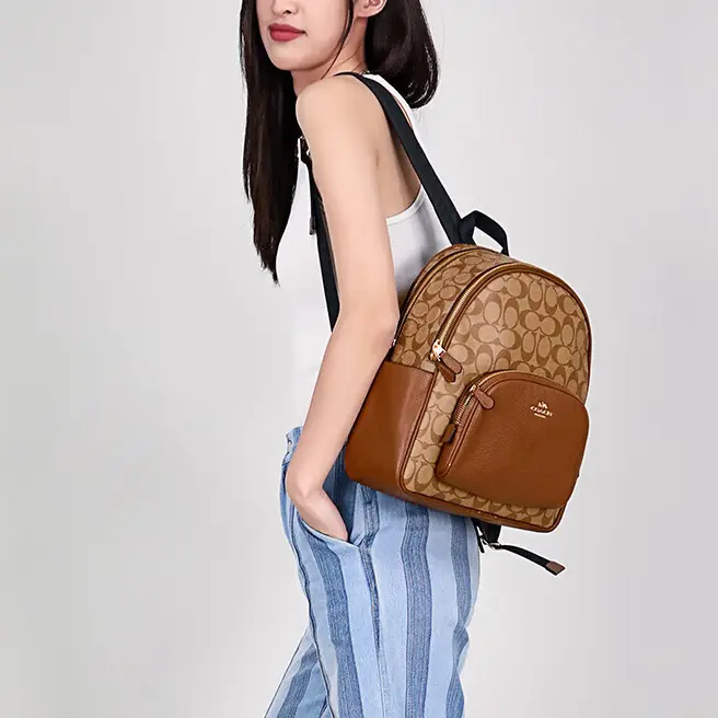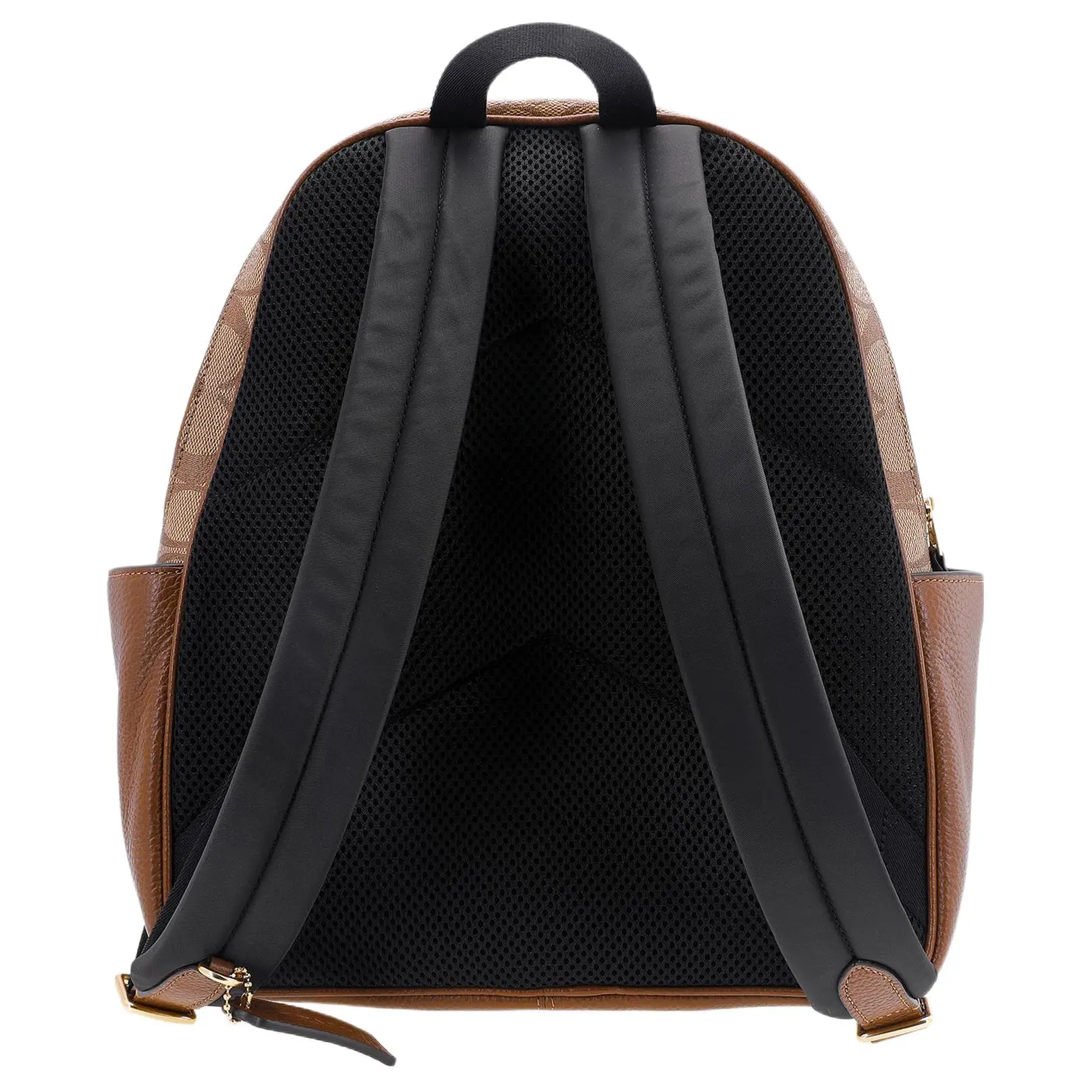 Materials: Exterior combines durable coated canvas with refined pebbled leather trim—both water-resistant and scratch-resistant. Lining is 100% polyester with Coach’s signature striped fabric.