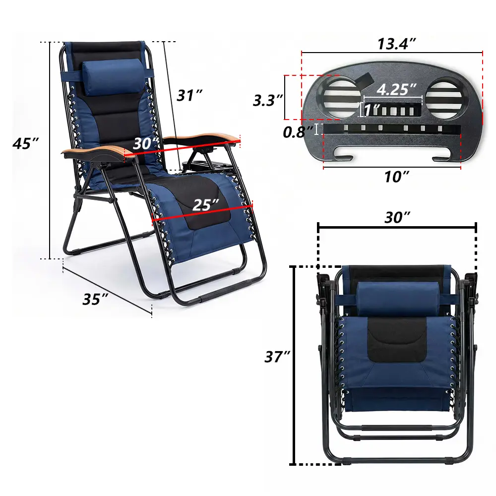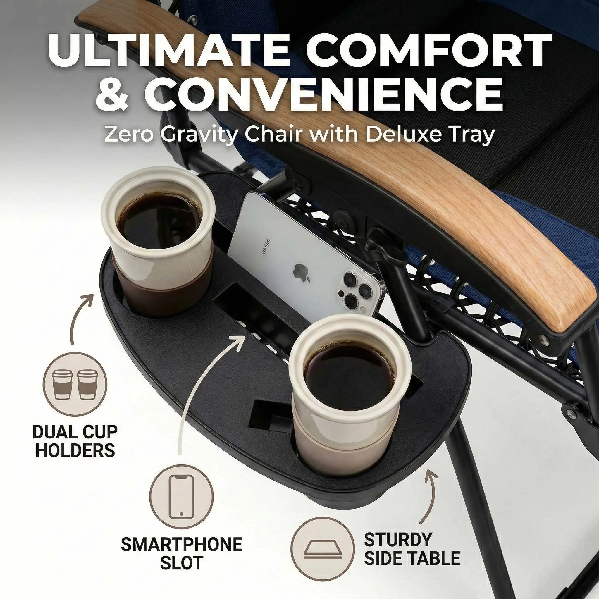 ·3.Smooth Lockable Reclining System & Utility Tray:Effortlessly glide from an upright position to a fully laid-back zero gravity angle with the smooth locking mechanism, allowing you to secure the chair at your desired position. It comes equipped with a detachable side utility tray that includes cup holders and slots for your phone, tablet, or book, keeping your beverages and essentials within easy reach while you relax.