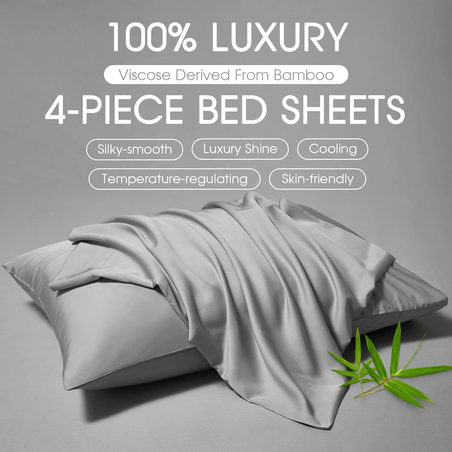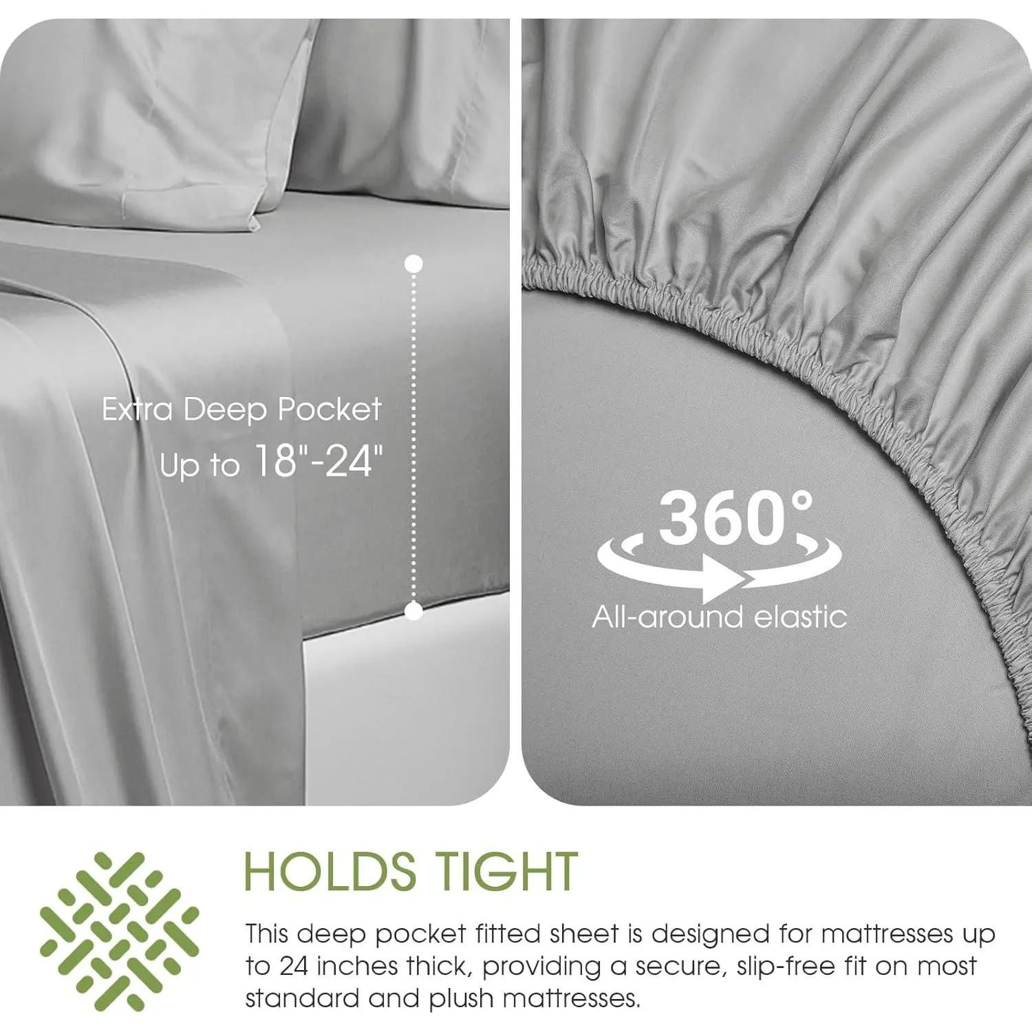 Our luxury sheets are made from rayon derived from bamboo, which is manufactured in an environmentally friendly way.Fibers from our sheets are extremely soft, luxury and feel like to perfect temperature to help you sleep more comfortably.LUXURY LOOK & SILKY SOFTNESS Our Sheets are an incredibly soft fabric, and its special weave leaves materials feeling silkier and often more luxurious.All you have to do is run your hands across some sheets to discover how silky they really are.COOLING AND MOISTER-WICKING SHEETS Our Sheets has excellent temperature regulating properties, which means that the bed sheets are designed to keep you cool on summer nights and warm on chilly winters.This is an ideal option for hot sleepersFits Extra Deep Mattress - extra deep pocket sheet set fits 18" - 24" inches extra-deep mattresses,it perfect for extra tall and thick mattresses,memory foam toppers,air or double pillow-top mattresses,and our fitted sheets will not slips off.Size Dimensions - 4 pcs queen sheet set, includes 1 flat sheet (90"x102"),1 fitted sheet (60"x80") and 2 pillowcases (20"x30").Machine washable and this sheet set is finished with fine stitching to ensure a good level of comfort to last for years.