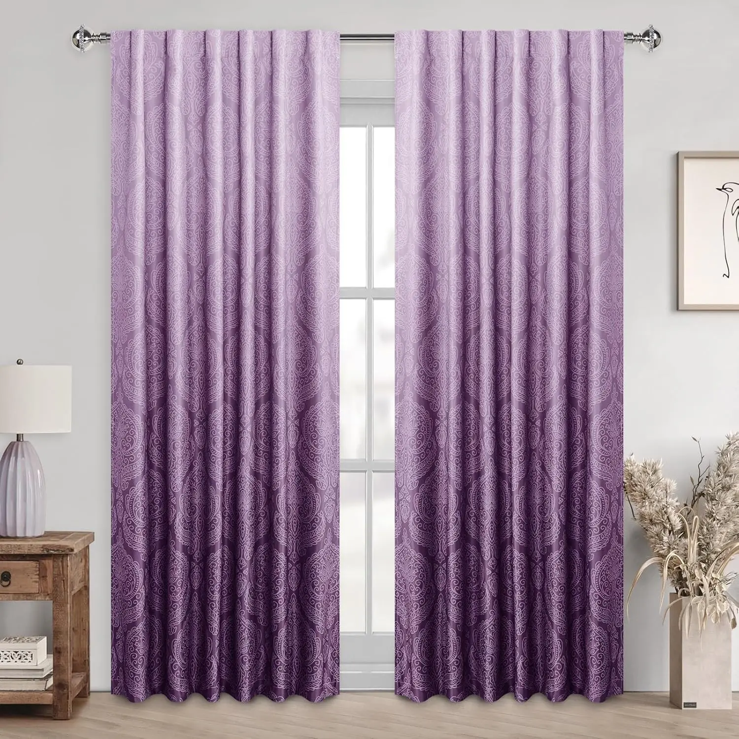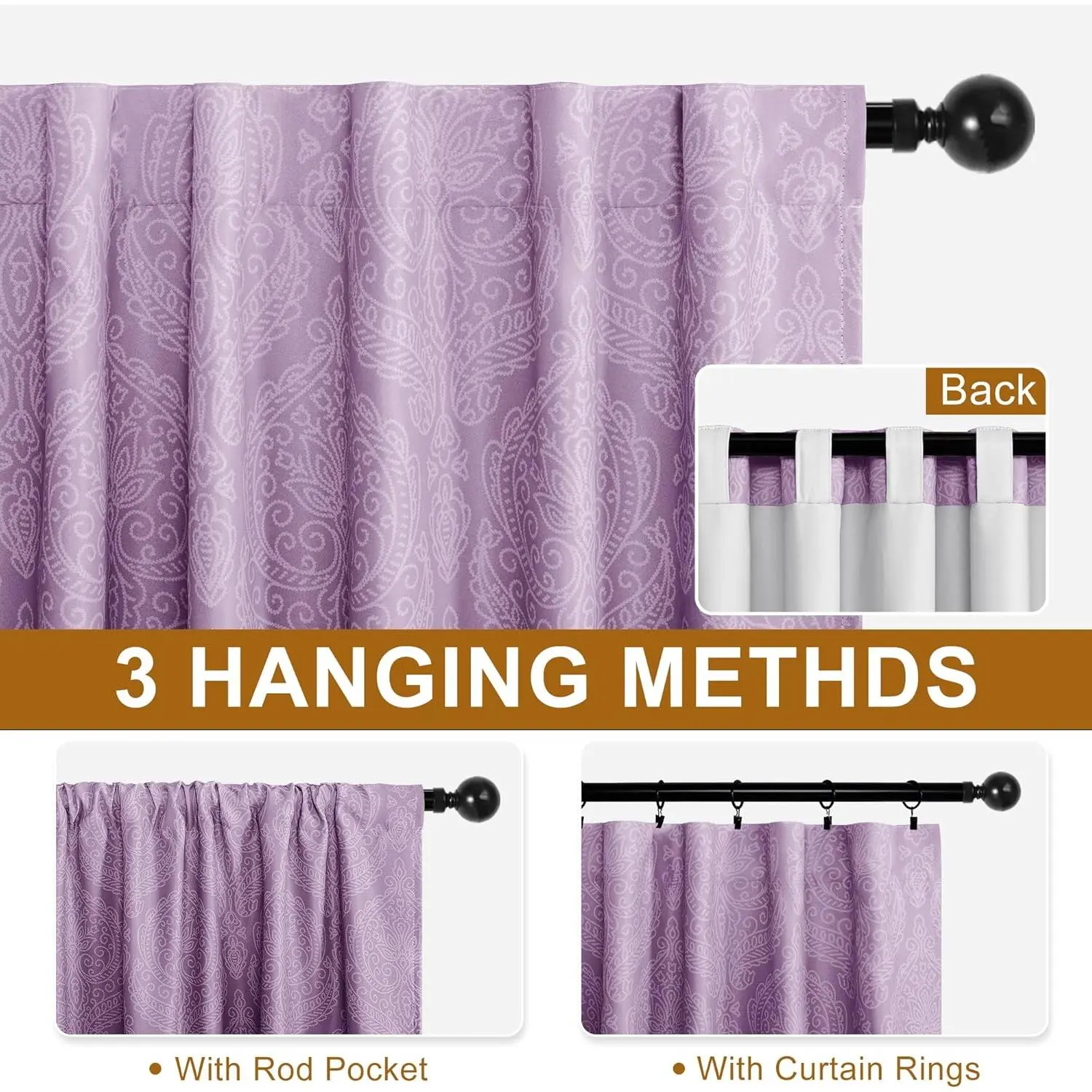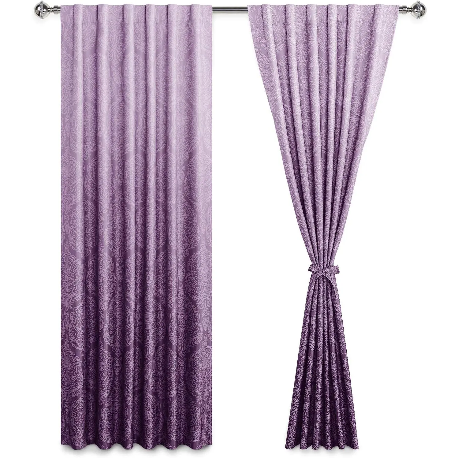 PACKAGE INCLUDES - This Package includes a set of 2 curtain panels.Each curtain panel measures 52" wide by 84" long (Total width is 104") and is available in 3 hanging options: Back loops, rod pocket or with your own clip-rings.TIEBACKS DESIGN - Each panel has 2 tiebacks of the same fabric sewn on both side of the curtain.You can tighten or loosen the curtains according to your preferences, and you don't need to spend extra money on curtain tiebacks.WELL BLACKOUT EFFECT - Our Curtains made of durable polyester fabric.It can block most of sunlight and UV rays.They can also insulate summer heat and winter chill, balance room temperature to save spends in energy costs.Protecting furniture from color shading and utmost privacy.SPECIAL PATTERN DESIGN - Elegant damask pattern with natural gradient effect on the front of the curtain (and the back is white solid color) will add a unique luxury view to your home, bedroom, living room, dining room and other rooms.EASY CARE - Machine washable in cold water, ironed at low temperature if needed.Please do not bleach or tumble dry.Don't use sharp things scratching curtains.