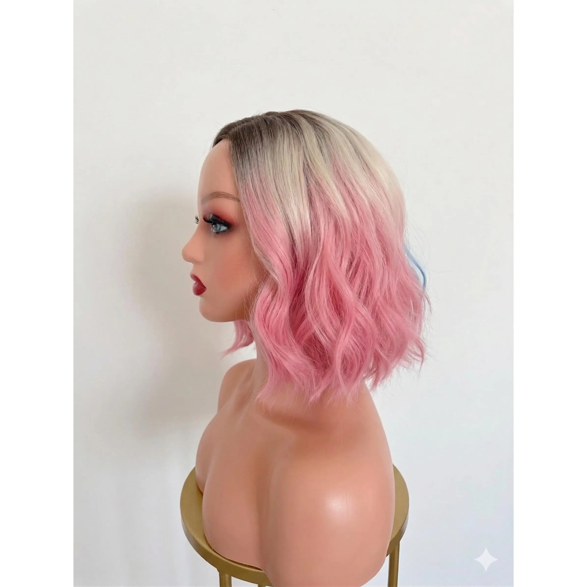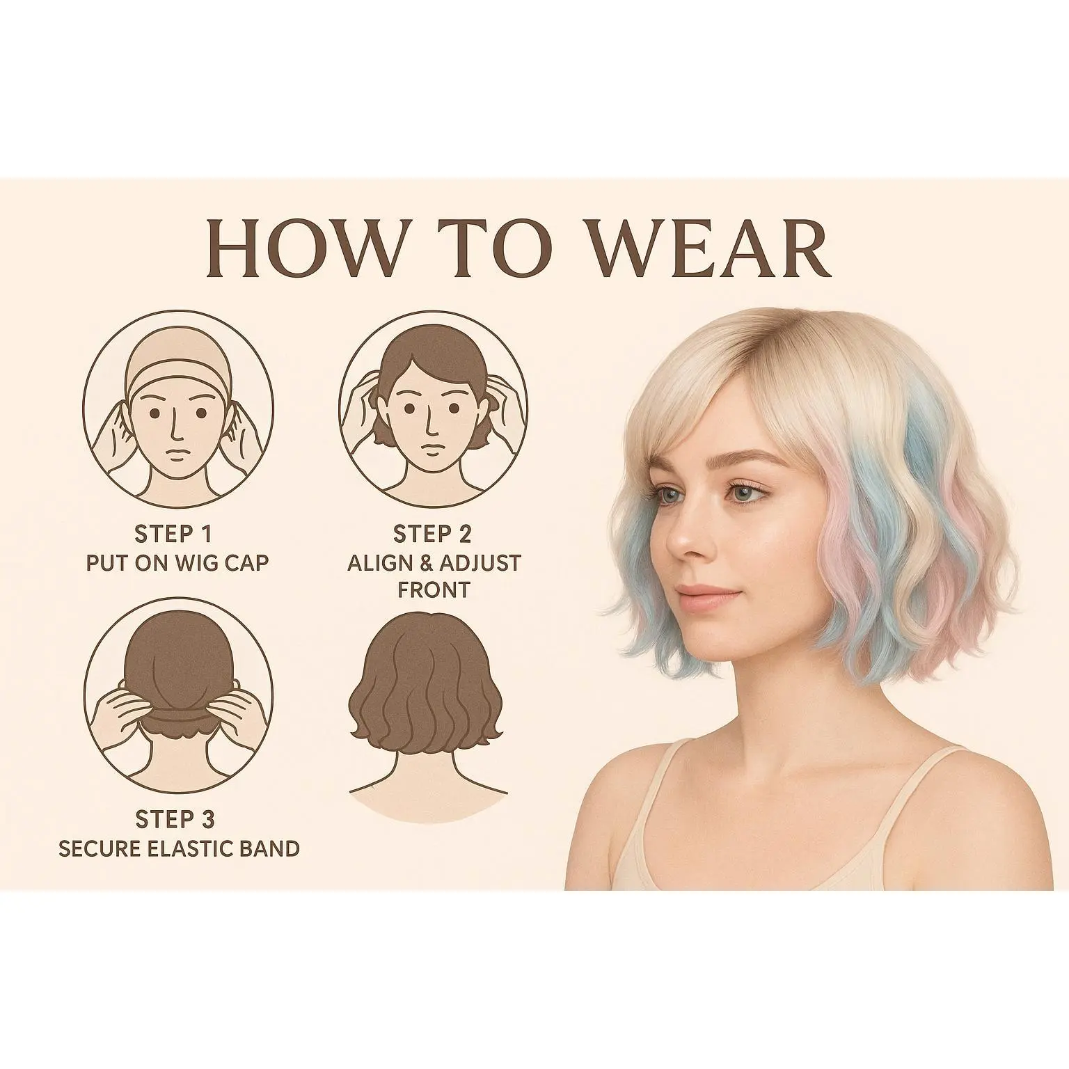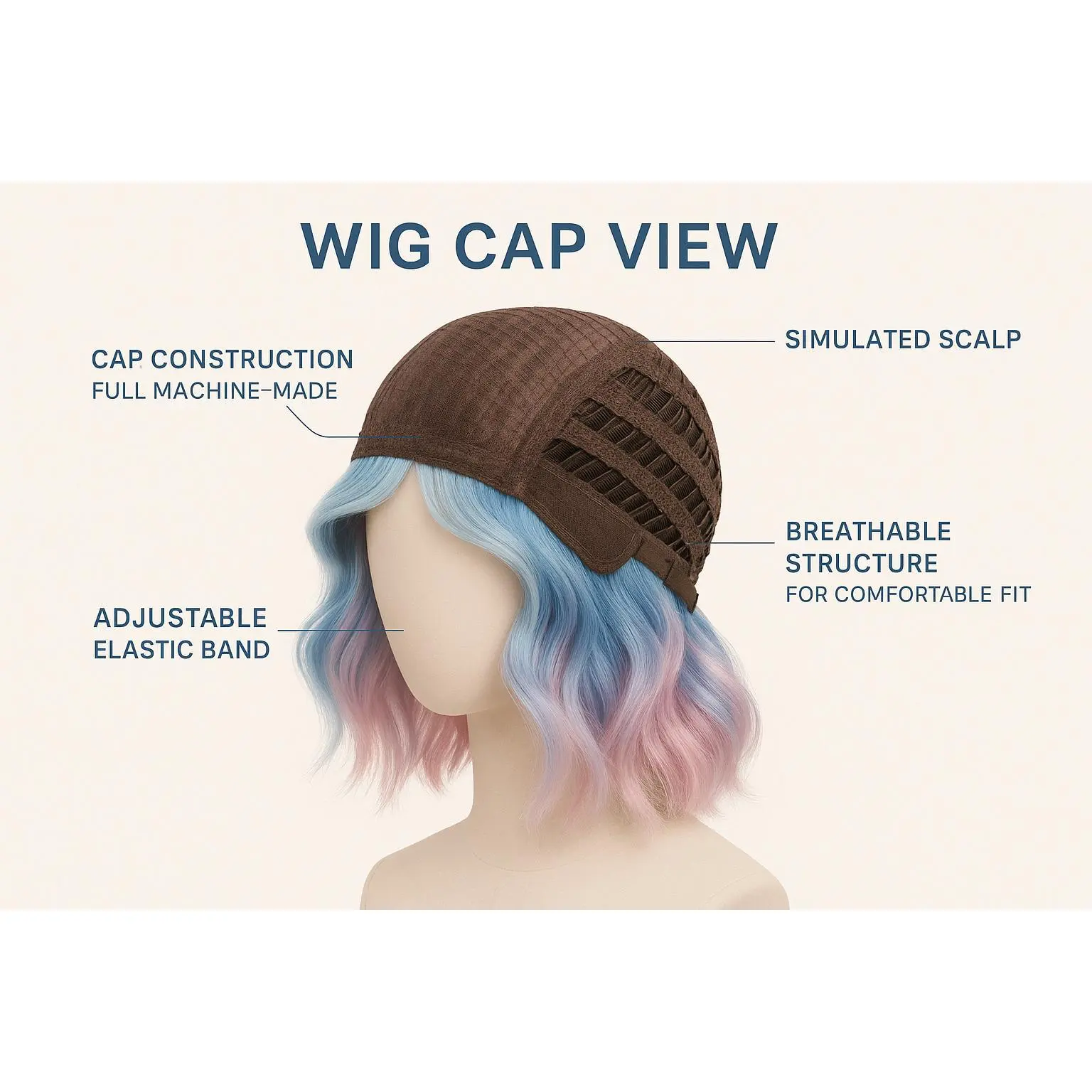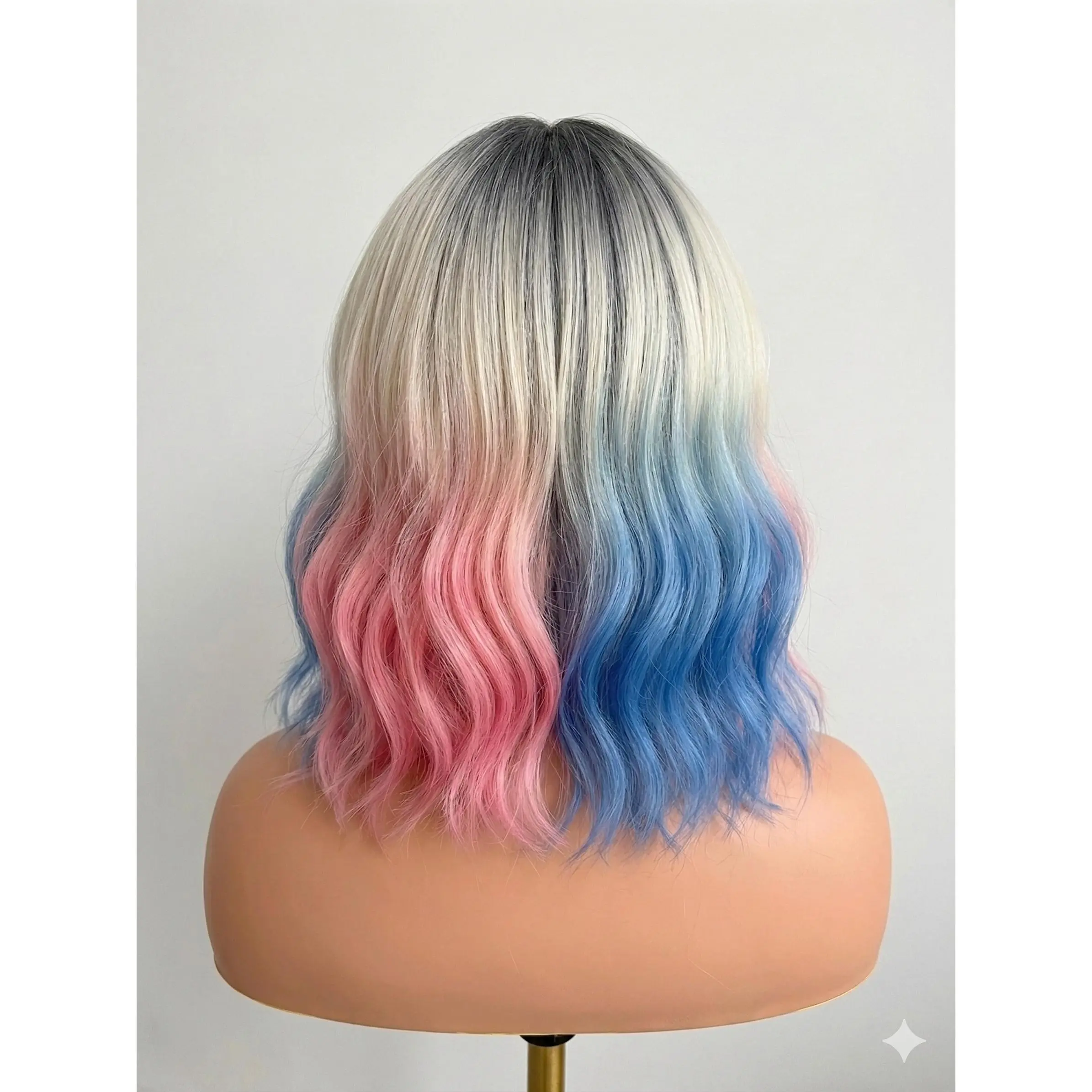 This short wavy wig features a unique platinum blonde base with vibrant blue and pink blend. Designed with a simulated scalp and full machine-made cap for a natural look and lightweight fit. Made from premium synthetic fiber, it's heat resistant up to 160°C and perfect for effortless styling.