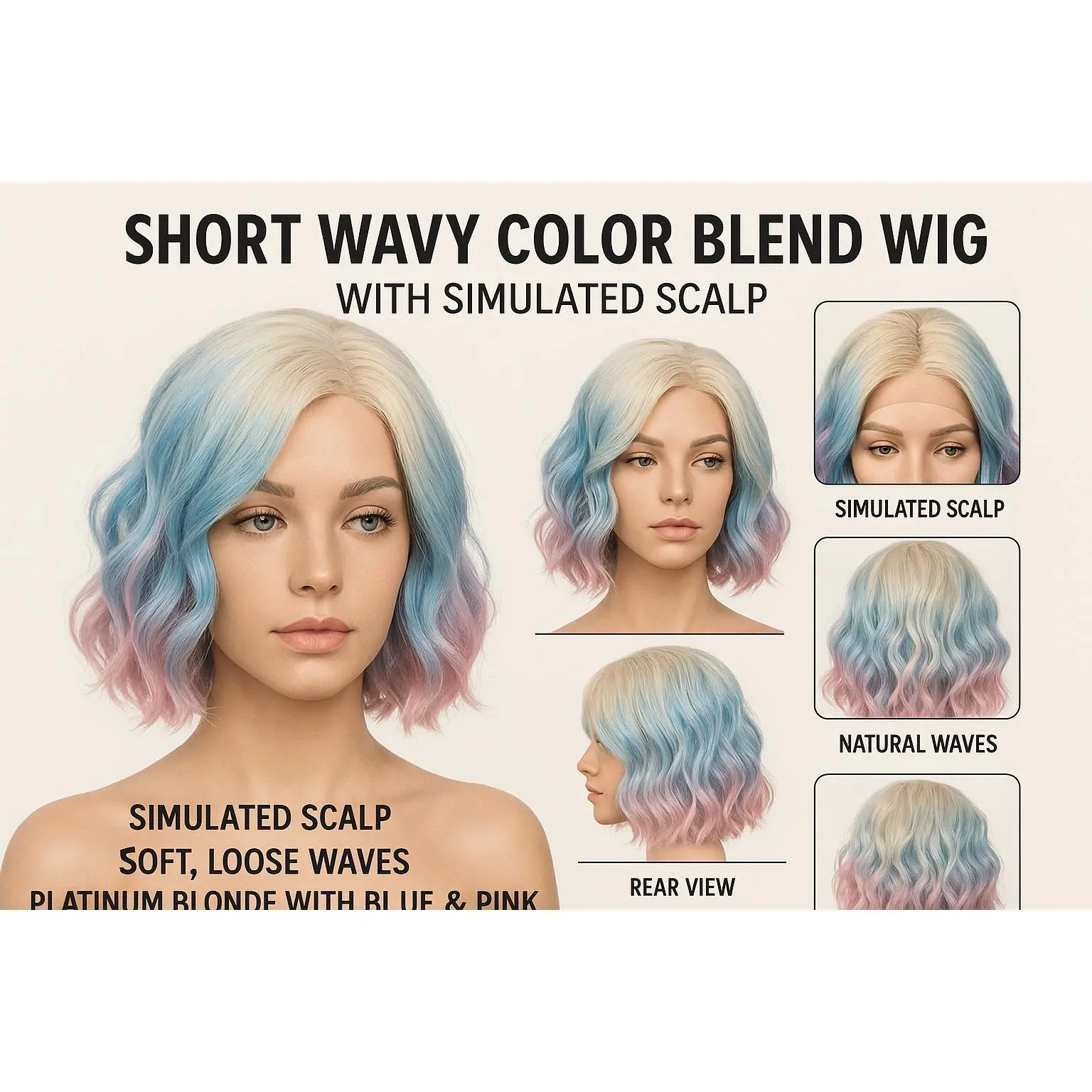 Short Wavy Color Blend Wig with Simulated Scalp - Platinum Blonde with Blue & Pink