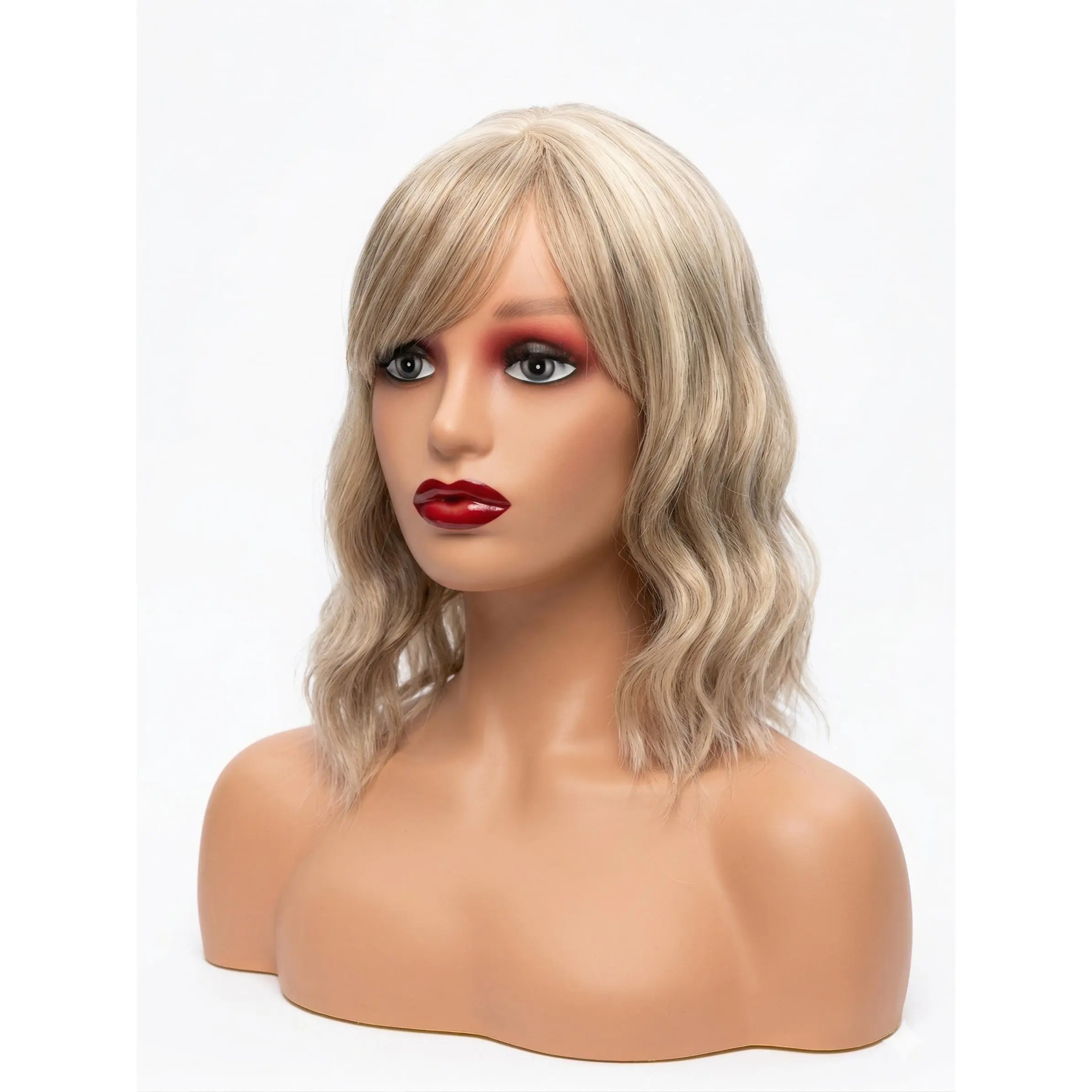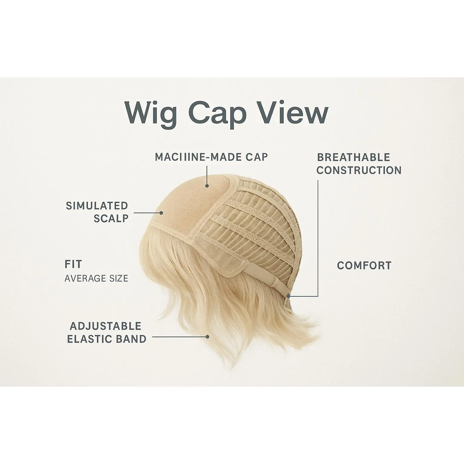 This short wavy wig features a natural loose wave texture in a light blonde shade. The full machine-made cap includes a simulated scalp for a realistic parting and natural look. Easy to wear with adjustable straps for a secure fit, made of premium synthetic fiber that is heat resistant up to 160°C. Designed for comfortable everyday use.