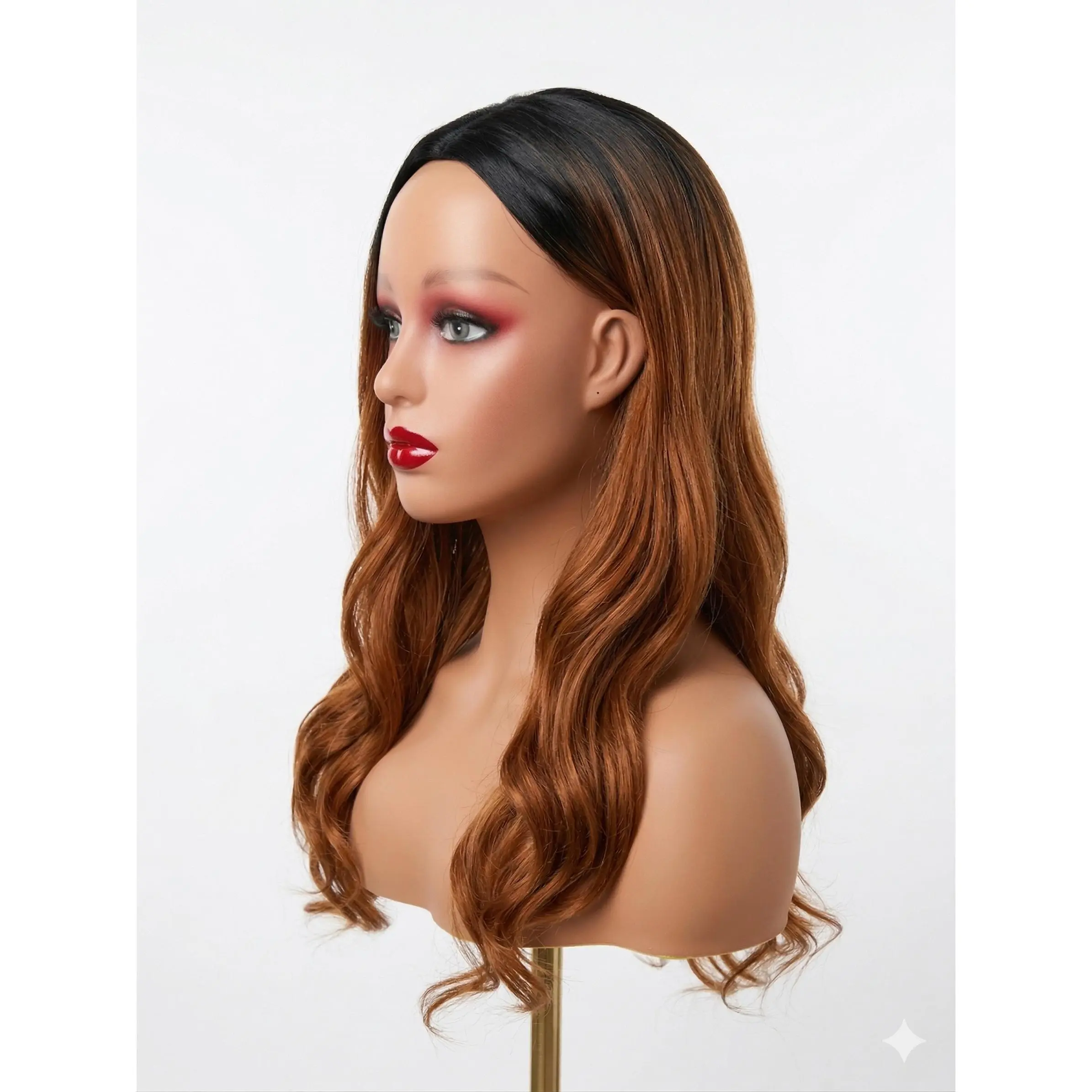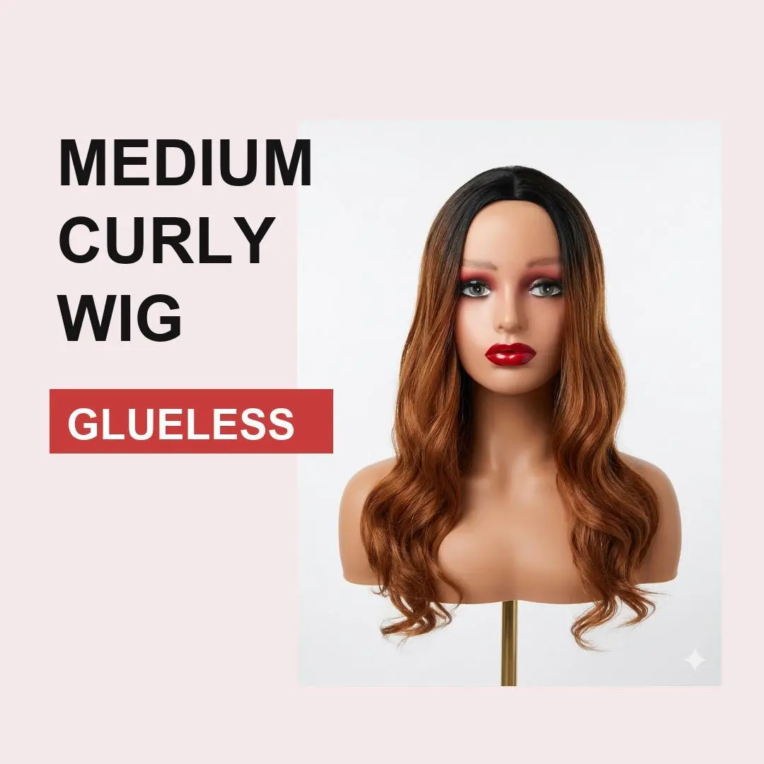 This medium length wig features soft, loose curls in a warm light brown shade with a natural black root fade. Designed with a simulated scalp for a realistic hairline, it offers a full machine-made construction for durability and comfort. The adjustable straps and lightweight, breathable cap ensure a secure and comfortable fit. Made from premium heat-resistant synthetic fibers, this glueless wig allows easy daily wear and styling up to 160°C.