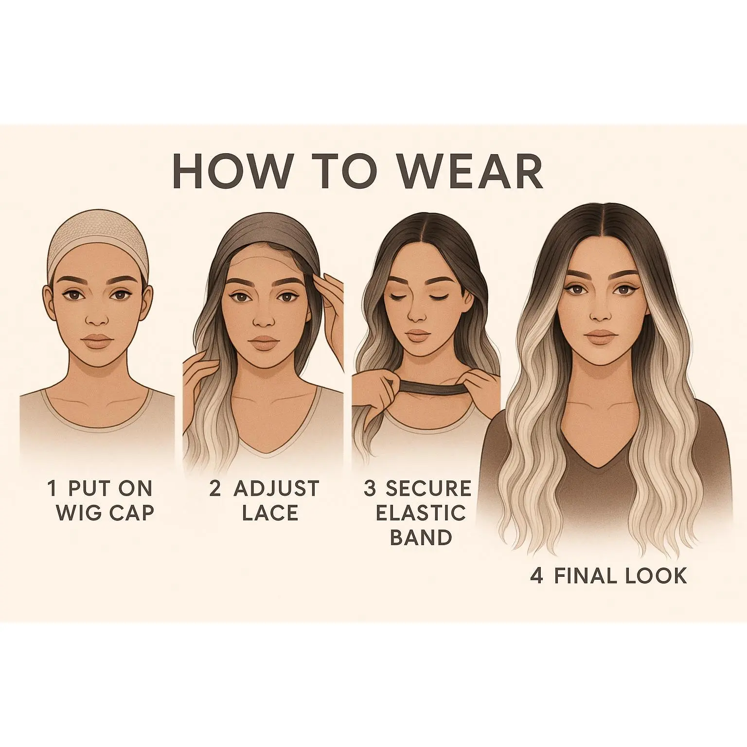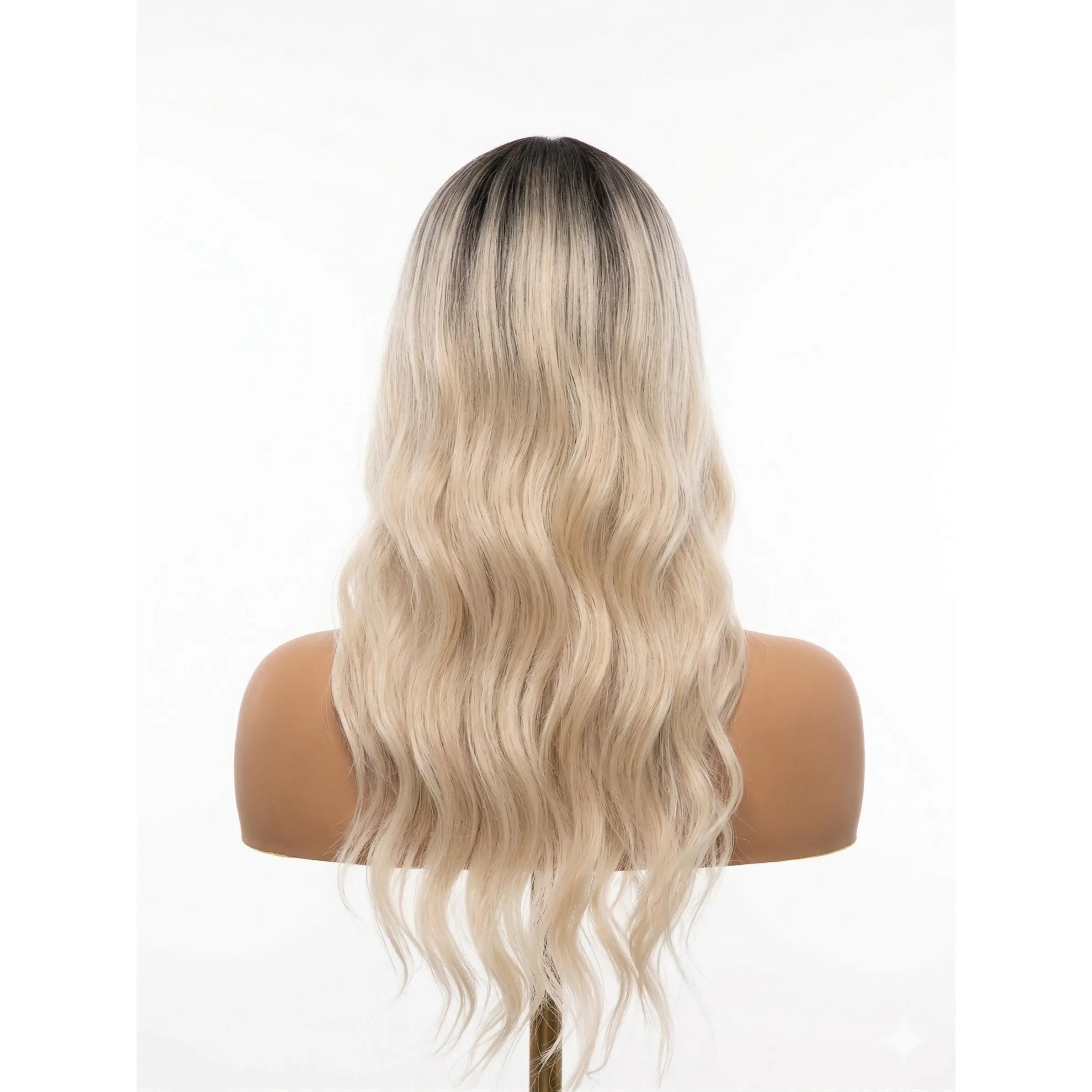 Natural Wave Series long wavy lace front wig with a smooth black to platinum blonde ombre effect. Features a loose wave texture and a natural hairline with simulated scalp for a realistic look. The cap is adjustable with straps and combs, plus a grip band for secure, glueless wear. Made from premium synthetic fiber, heat resistant up to 160°C for styling versatility.