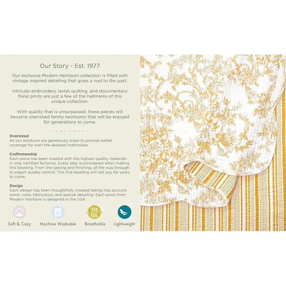 100% CottonElevate your bedroom décor with the classic elegance of the Garden Toile Quilt Set.Featuring a delicate toile print in your choice of blue, gold, or red, it reverses to a complementary striped pattern for versatility.100% cotton fabric and fill for softness, breathability and comfort.The scalloped edges add a romantic touch, while the channel quilting ensures durability and lasting quality.Full/Queen set includes 88"W x 90"L quilt and two standard shams - 20"W x 26"L.Machine washable for easy care.