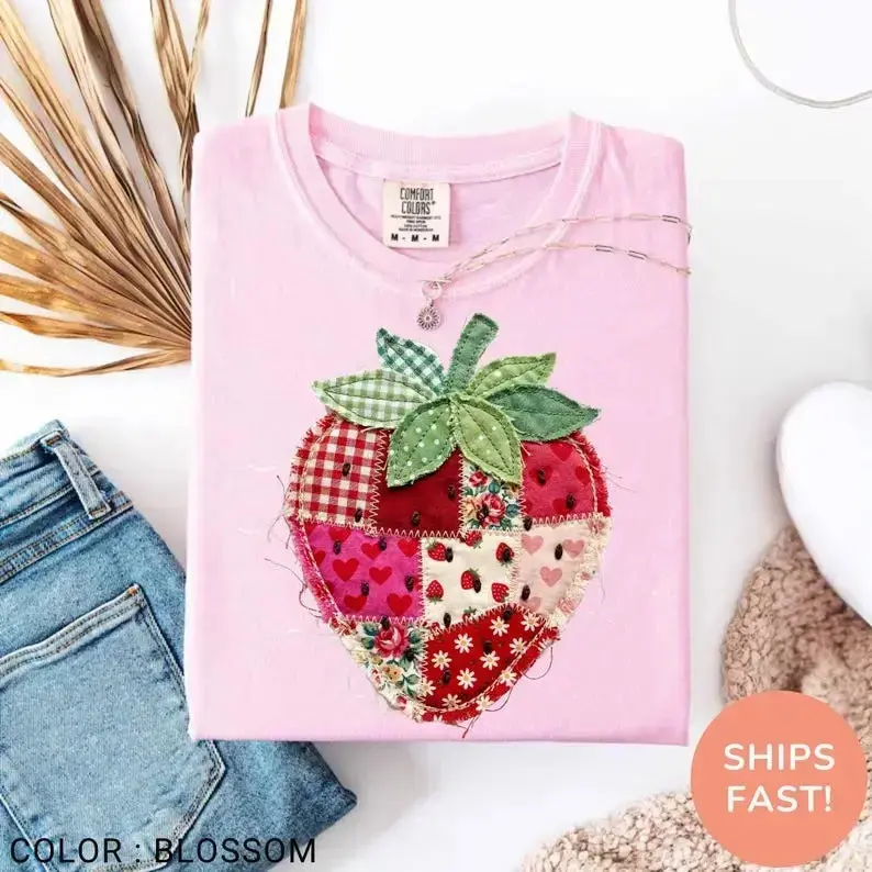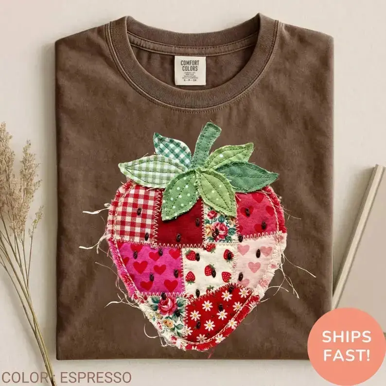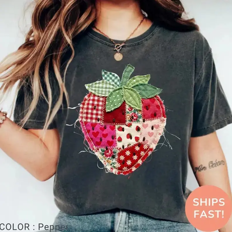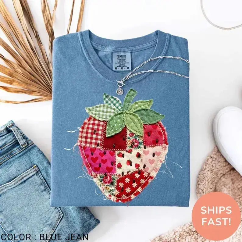 Comfort Colors PRINTED Strawberry T-Shirt, Patchwork Quilted Farmhouse Berry Tee, Rustic Gingham Floral Cottagecore Aesthetic, Vintage Tee