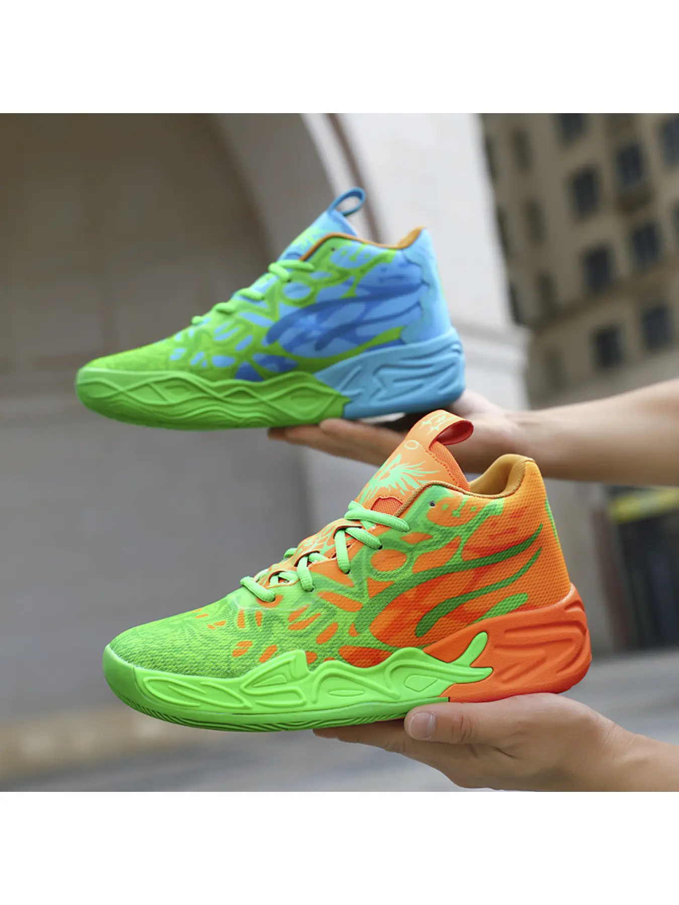 5. 1 Pair Fluorescent Pink Green Graffiti Parent-Child High-Top Basketball Shoes Art Sports Style Breathable Mesh Material Shock Absorption Ankle Protection For Basketball Training And Trendy Daily Outfit