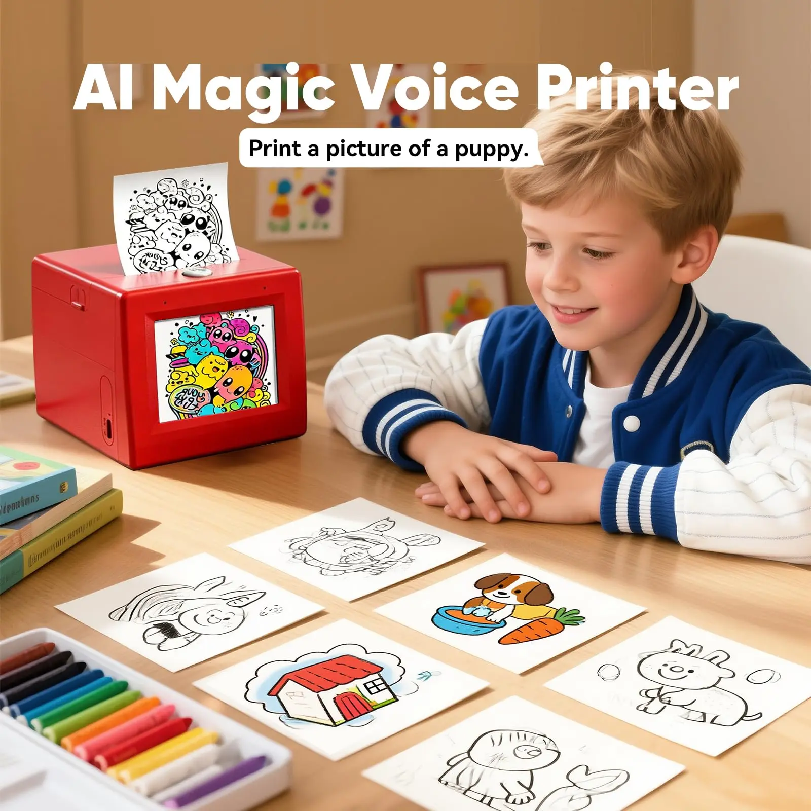 Children's AI Sticker Drawing Machine, featuring voice-to-image conversion, portable cartoon drawing maker, instant thermal paper output, creative toy set, includes 3 rolls of thermal paper and 2 rolls of stickers.
