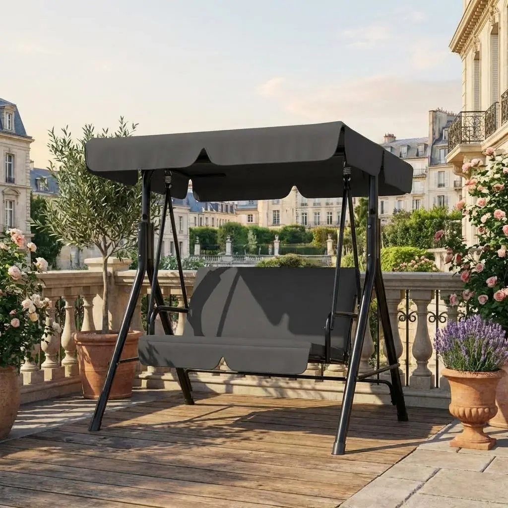 The seat and canopy are made from upgraded polyester fabric with water‑ and UV‑resistant coating—designed for outdoor comfort and easy maintenance. (Recommended not to leave exposed to harsh weather for extended periods.)