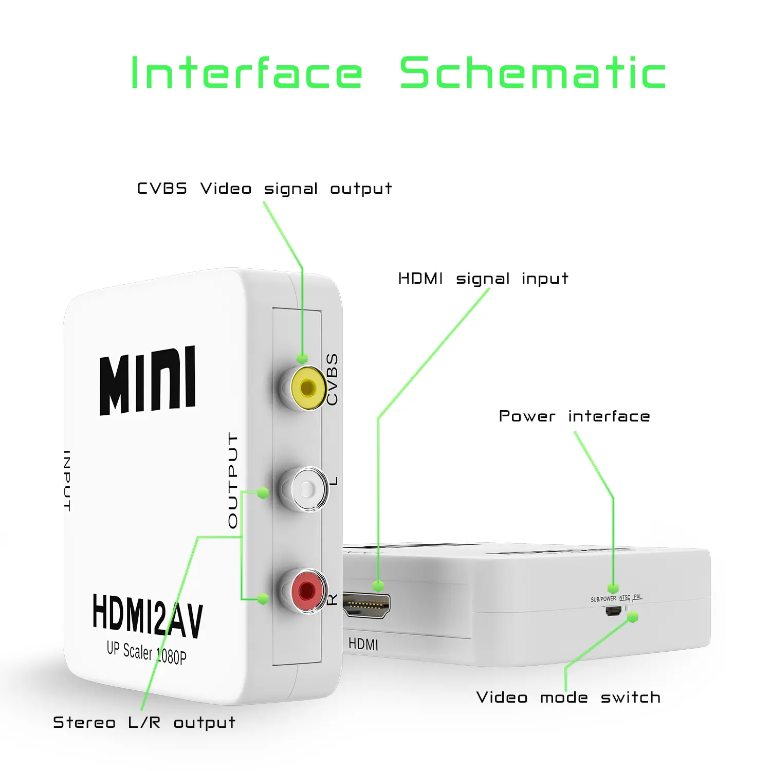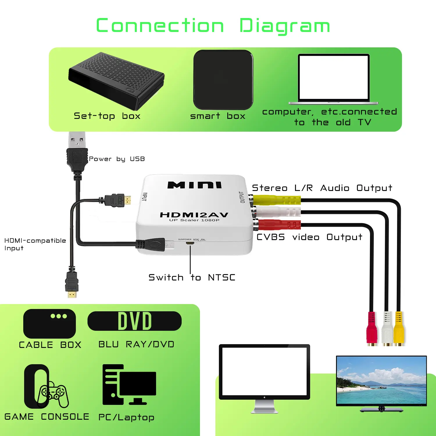 ·RCA to HDMI Converter: Converts analog RCA composite (Yellow, White, Red) input to HDMI 720P/1080P output on HDTVs/Monitors. Only support RCA to HDMI. NOT Support HDMI to RCA!