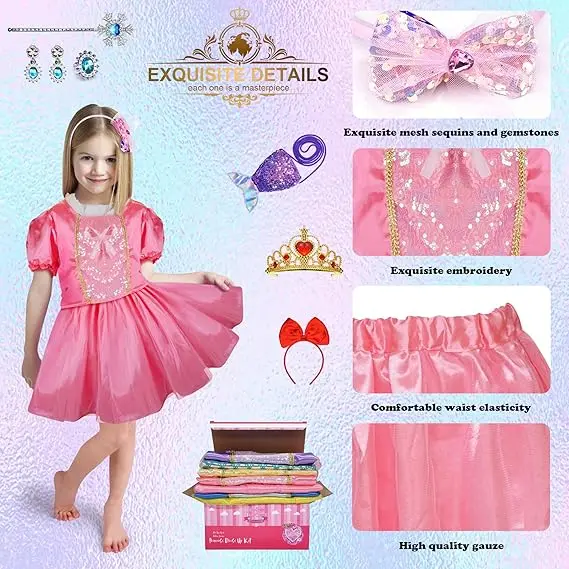 ·5-in-1 Princess Fantasy Kit: Unleash the magic with our ultimate princess dress up for girls! This comprehensive set includes 5 complete roles in one box, featuring 4 tops, 4 skirts, 1 cape, 2 hair bows, 1 crown, 1 pair of earrings, 1 ring, 1 magic wand, and 1 mermaid purse for endless storytelling.