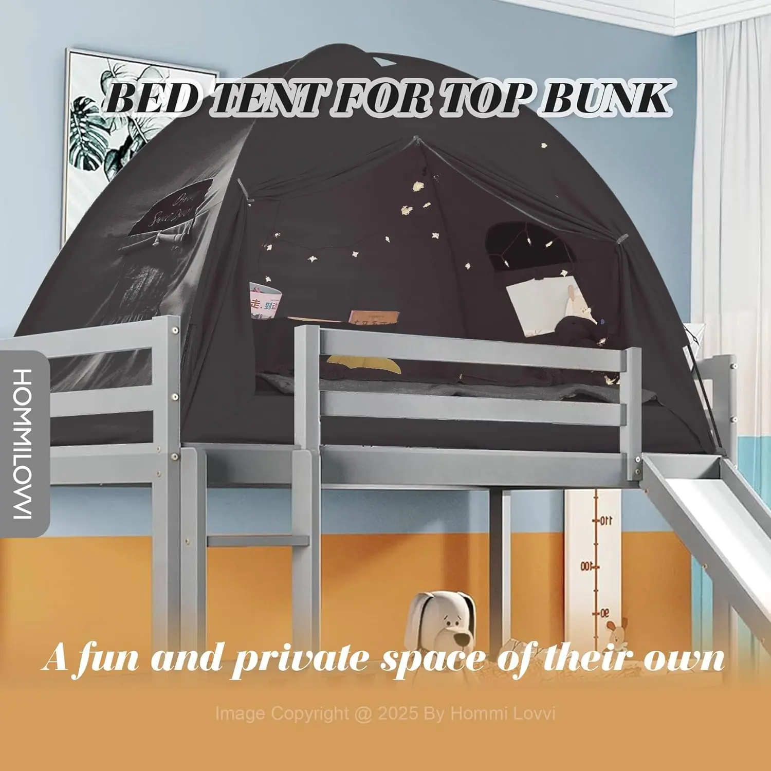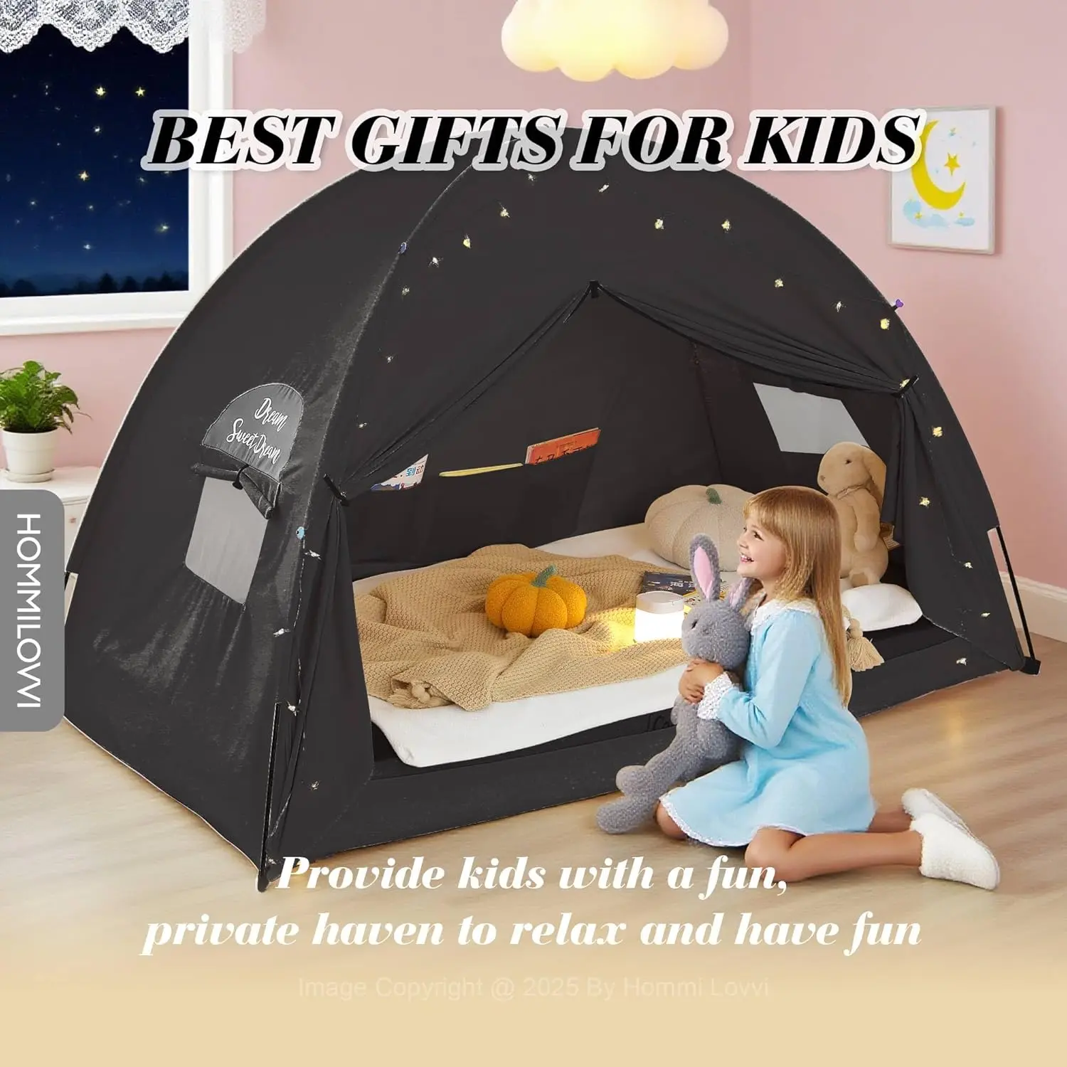 COZY PRIVATE SPACE: The blackout twin Bed tent includes a string starry lights, making bedtime extra special.Fun color-blocked windows spark joy for little adventurers!Breathable see-through mesh allows airflow and let you check on your sleeping child.Fits bed size: 75"L x 39"WDURABLE, SOFT & BREATHABLE: Crafted from high-quality polyester fabric for all-season softness and comfort, this kids bed tent features an 8mm high-elasticity fiberglass frame that maintains perfect shape.Perfect for creating a calm retreat for kids, with just enough airflow to prevent stuffiness while keeping naps undisturbedALL-IN-ONE HIDEAWAY: This versatile tent for twin bed offers the perfect blend of privacy, comfort, and functionality, making it an ideal retreat for kids and adults alike.Featuring 2 mesh windows, 3 storage pockets, 1 overhead toy storage hammock, and 1 nightlight hook, it creates a cozy and organized space for sleep, play, or relaxationEASY SET-UP, PORTABLE & FOLDABLE: Tool-free-assembly bed tent !Just slide the fiberglass poles through the tunnel and lock all 4 corners – your instant private space is ready!Includes step-by-step instructions and a storage bag for easy portabilityBEST GIFTS: Perfect for sleepovers, outdoor adventures, or cozy reading nooks, this twin bunk bed tent suits all ages.It easily converts into a floor tent for children, a floor playhouse, or a twin bed.We stand behind the quality of our premium bed canopy tent.If you're not 100% satisfied, contact us anytime, we're happy to help