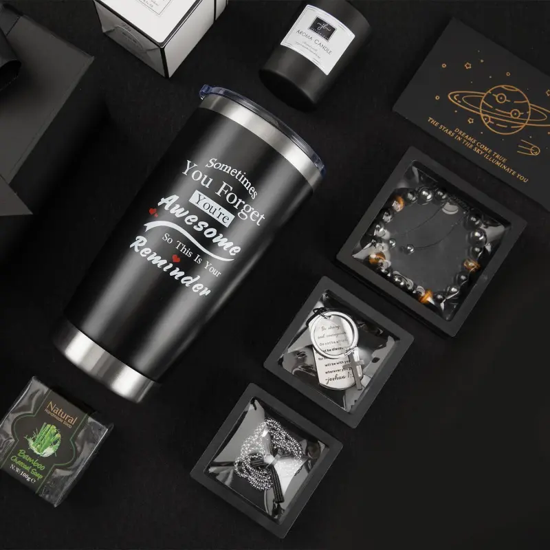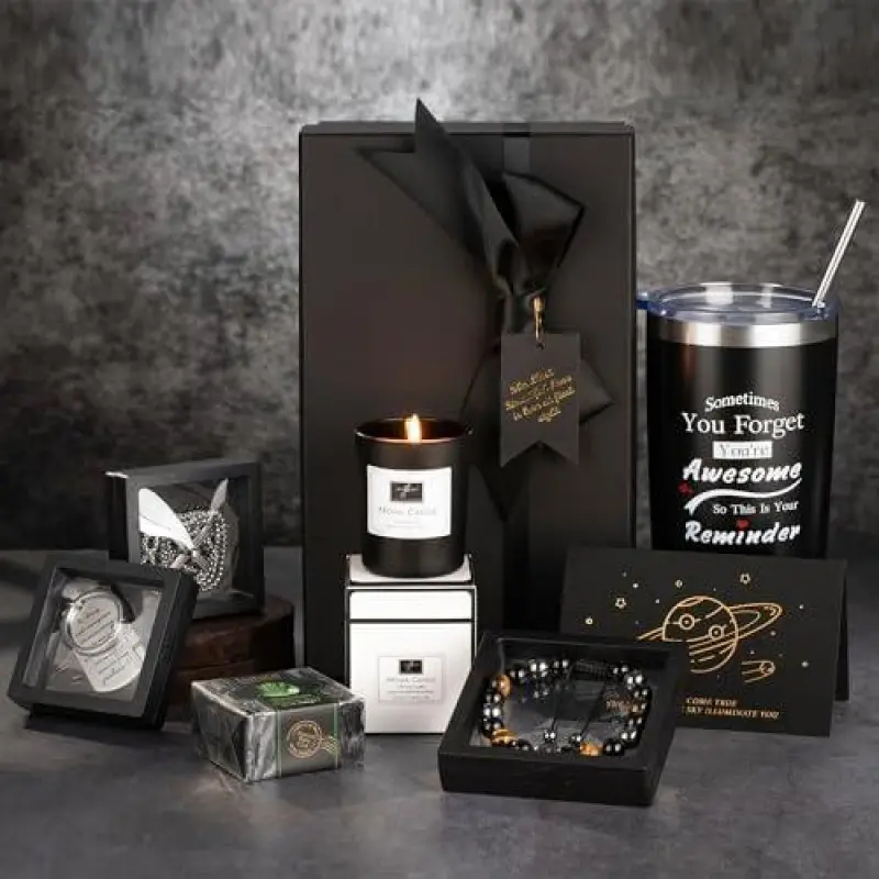 [Gift Box Package]:The gifts set comes with Insulated Tumbler , Men's Bracelet,Pure Manual Soap ,Scented Candle,Cross Necklace,,Greeting Card, Exquisite gift box and some accessories such as lid, straws.This men gift set is a wonderful gift to satisfy your giving gift needs and the dad gifts set will make him happy and heat- warming.